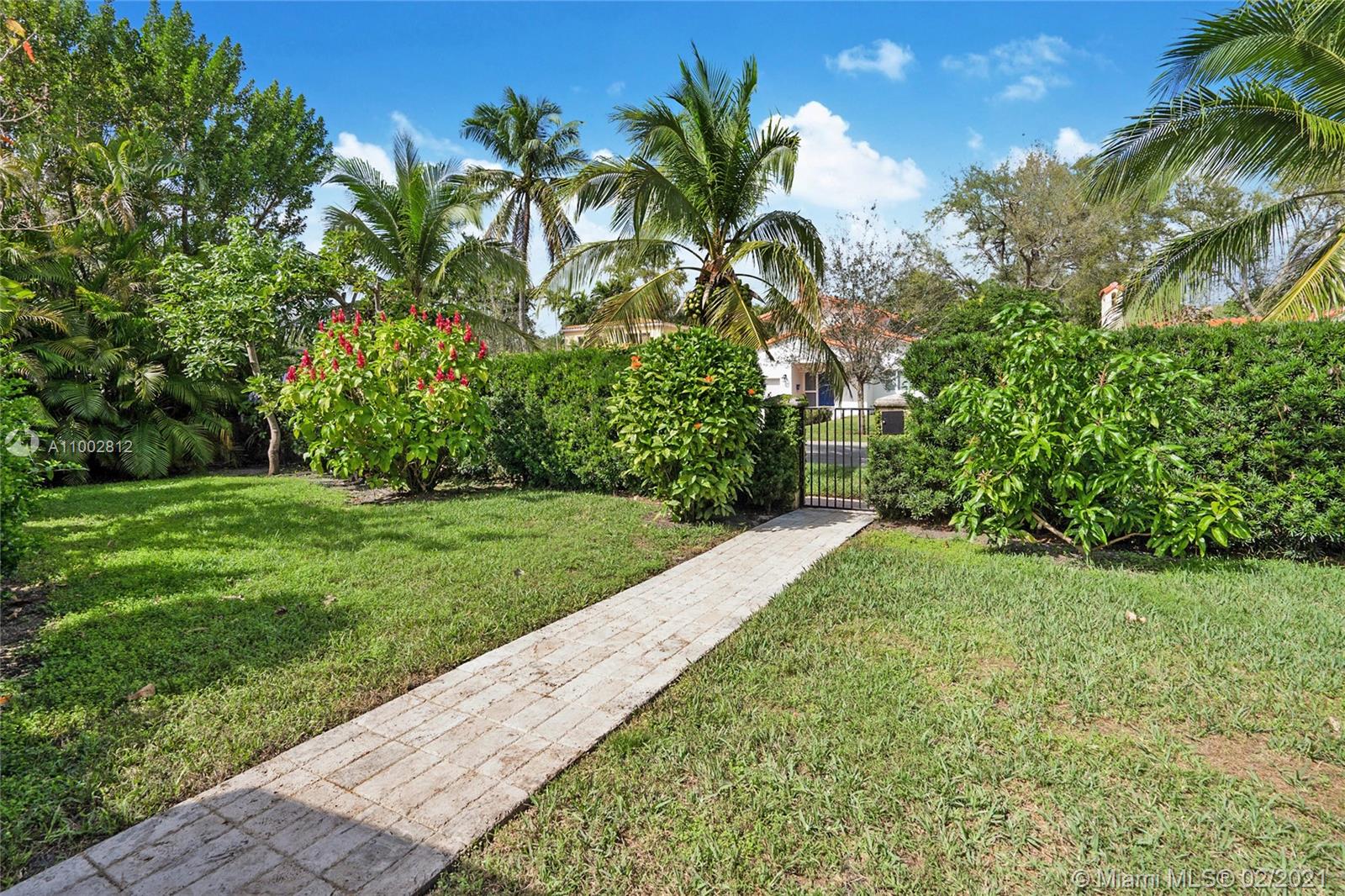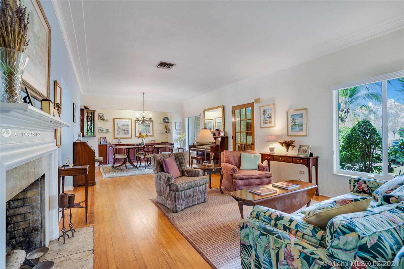Located in a Prime Coral Gables location, behind a privacy wall, this 4 bd, 3 bath residence w/ cottage is on a quiet, low traffic street. The 12,000 sq. ft. lot is laden w/ exotic plants & fruit trees. Garden vistas from every rm. Charming details are exemplified by hardwood floors, fireplace in living rm & gabled ceiling in fam rm. Modern features incl Impact windows/doors/barrel tile roof. Large updated kitchen w/ granite countertops/island/ breakfast bar/eat in area/home office ideal for a family. Home offers a split plan: Master on west side features Bay window/window seat/ample closets. 3 bdrms & 2 baths on east side. The 592 sq ft cottage features high ceilings, saturnia flooring, large liv area/Murphy bed/full bath/kitchen & office space. All cast iron pipes have been replaced.