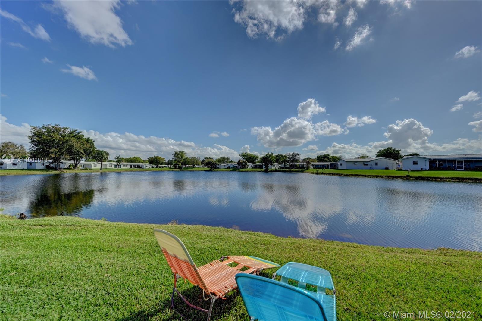 WATER,WATER EVERYWHERE! Breathtaking views & sunsets from this 2 bed 2 bath home! A waterfront gem--one of few directly positioned on wide tranquil lake with highly sought after north/south setting. Generous 55+ community amenities--2 heated pools & spas, tennis courts, fitness center, clubhouse, free TV/internet, all outside maintenance, free shuttle to stores. Expanded Florida room and screened porch overlooking water with large grilling space. Upgraded LED ceilings with remote controlled fans throughout, extensive security system, walk-in closet, one car garage, doublewide driveway, hurricane awnings/shutters, newer roof. A/C unit under warranty, seller funded home warranty through 12/31/21. BEST OF ALL, VAST GRASSY LAKEFRONT ACCESS IS ALL YOURS!