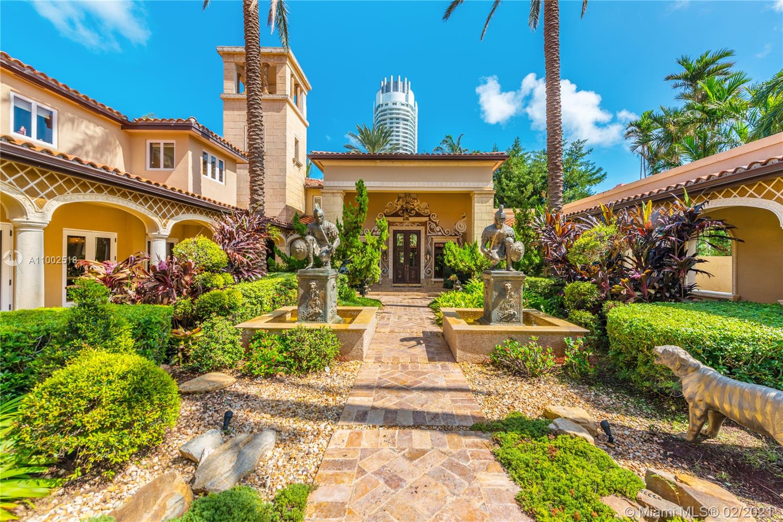 One of a kind estate on a 39,000 sq ft lot. Beautiful open courtyard. A recently renovated grand estate offering exquisite mahogany wood details, 25' fireplace, game room, 2 separate private guest houses, staff room, office, gourmet kitchen w/island, impressive large master suite, terraces, loggias, fountains, resort style pool, gazebo, summer kitchen, and outstanding grounds. 10 bedrooms, 10 bathrooms, 3 half baths. A total of 4 kitchens throughout the property. Excellent dockage for large 100ft+ yacht plus additional boat lift and jet ski lift. Equipped with natural gas generator to power the complete home. Luxury abounds throughout this extraordinary waterfront estate. Impressive views to the historical founainebleau hotel. No neighbors to your left side.