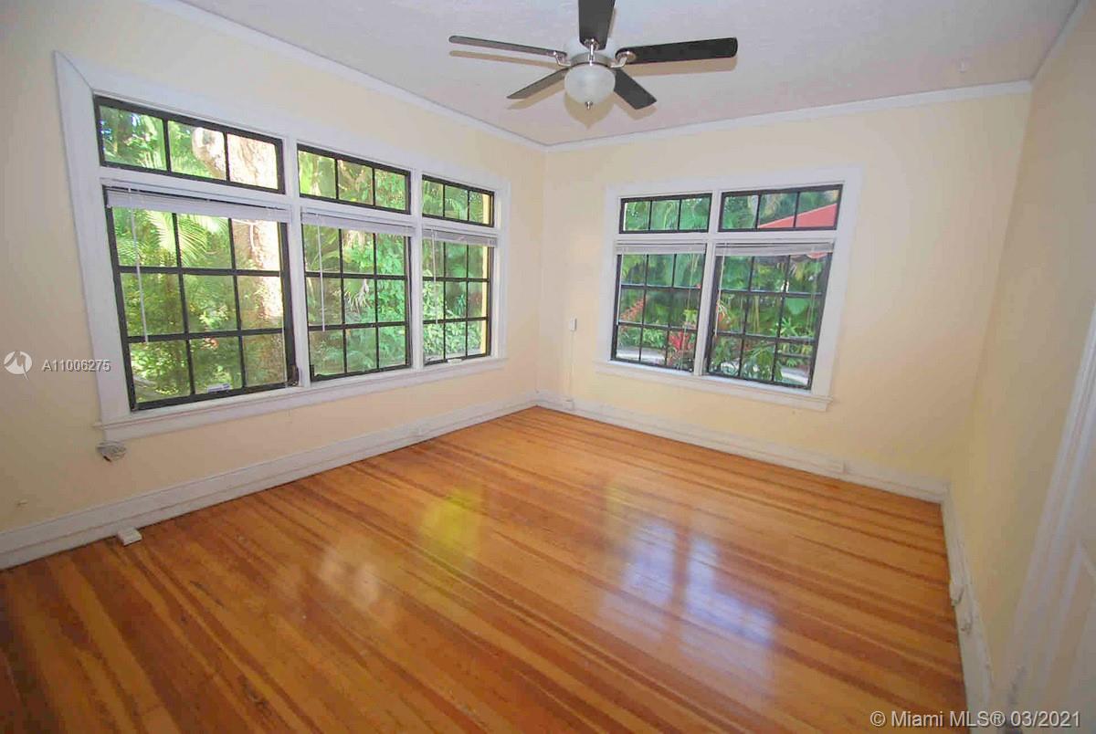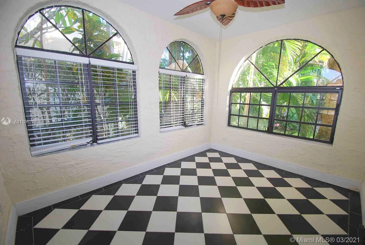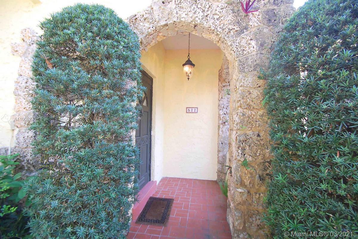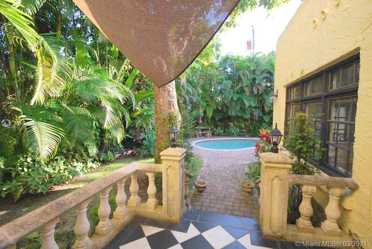Charming Old Spanish home sits pretty on elegant and picturesque tree-lined Alhambra Circle. A coral rock covered entry leads to a foyer. Beyond is the living room, sunroom and a formal dining, spacious kitchen with eat-in area and bar or pantry. The main house has two bedrooms on the first floor, including the principal suite, and the third bedroom upstairs. Most of the home has pine wood floors. A separate, original structure has two living areas: a studio with a bath on the second floor, a two-bedroom, one bath unit on the first floor plus a full two-car garage with laundry. Romantic pool surrounded by mature trees and beautiful garden, fountains.