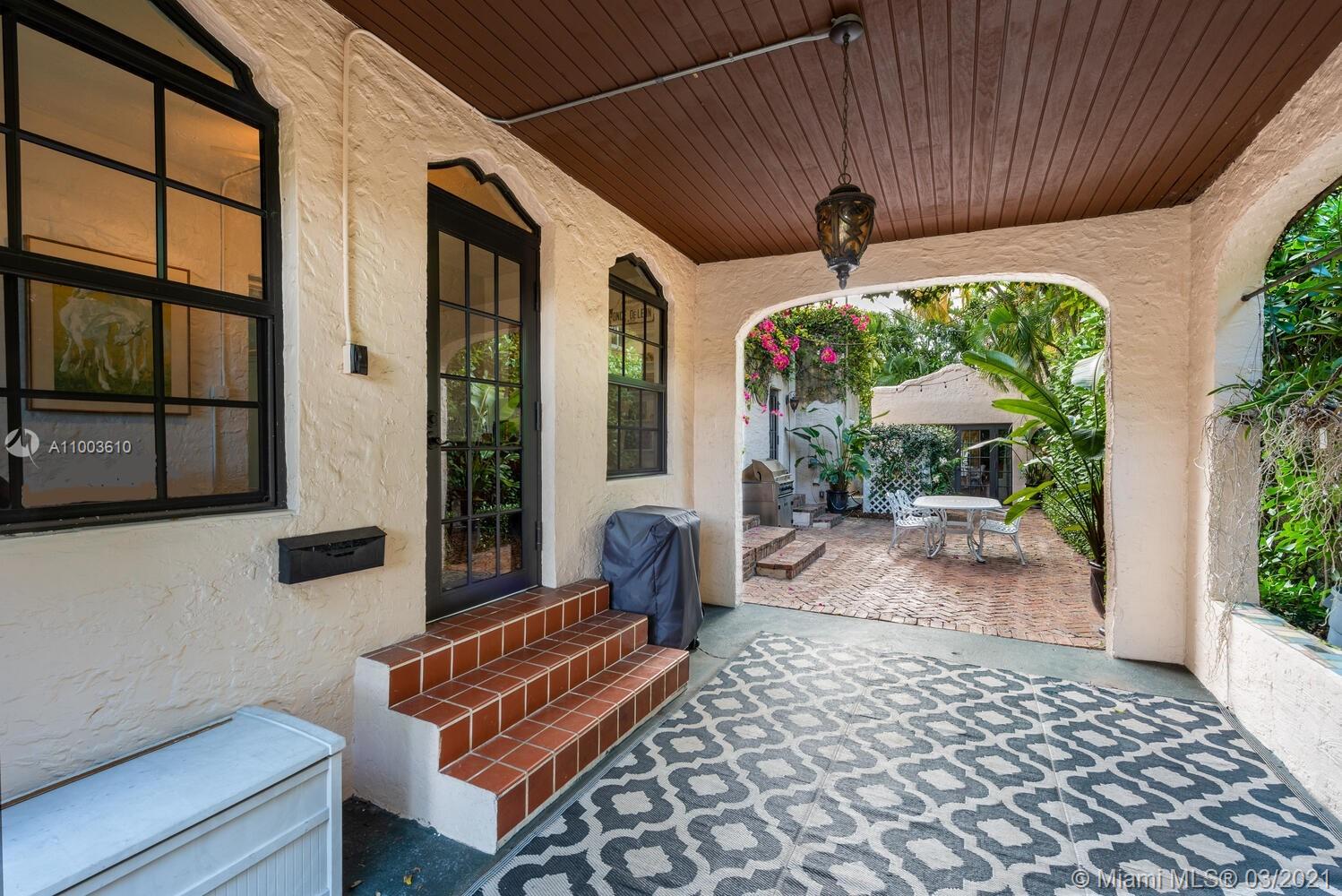 Situated on one of Coral Gables beautiful tree-lined streets & meticulously maintained & renovated. This 1926, Old Spanish, 3 bedroom 2 bath home has a detached 1/1 guest house, 2023SF total area & sits on a 5,000 SF lot. Fall in love with a charming outdoor space filled with lush landscape of ivy & orchids, a Porte-a-corchere, brick pavers & BBQ area great for family entertaining. Enter into an open space living area w/ beautiful Dade County Pine wood floors, wood-burning fire place, bonus room, large dining with French doors leading to the exterior & an updated kitchen w/ quartz countertops & newer s/s appliances. Arched IMPACT windows & doors allow lots of natural light flow through this home. Quiet street with no through traffic. Walking distance to Miracle Mile shops & restaurants!