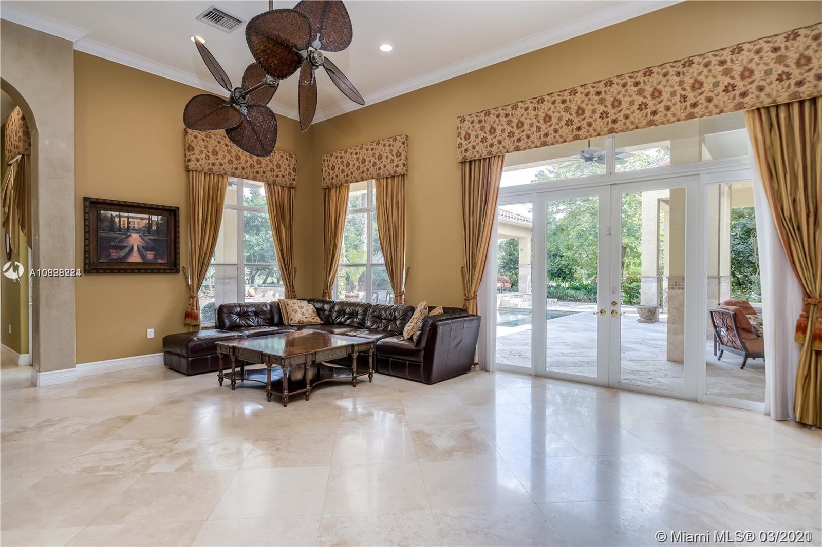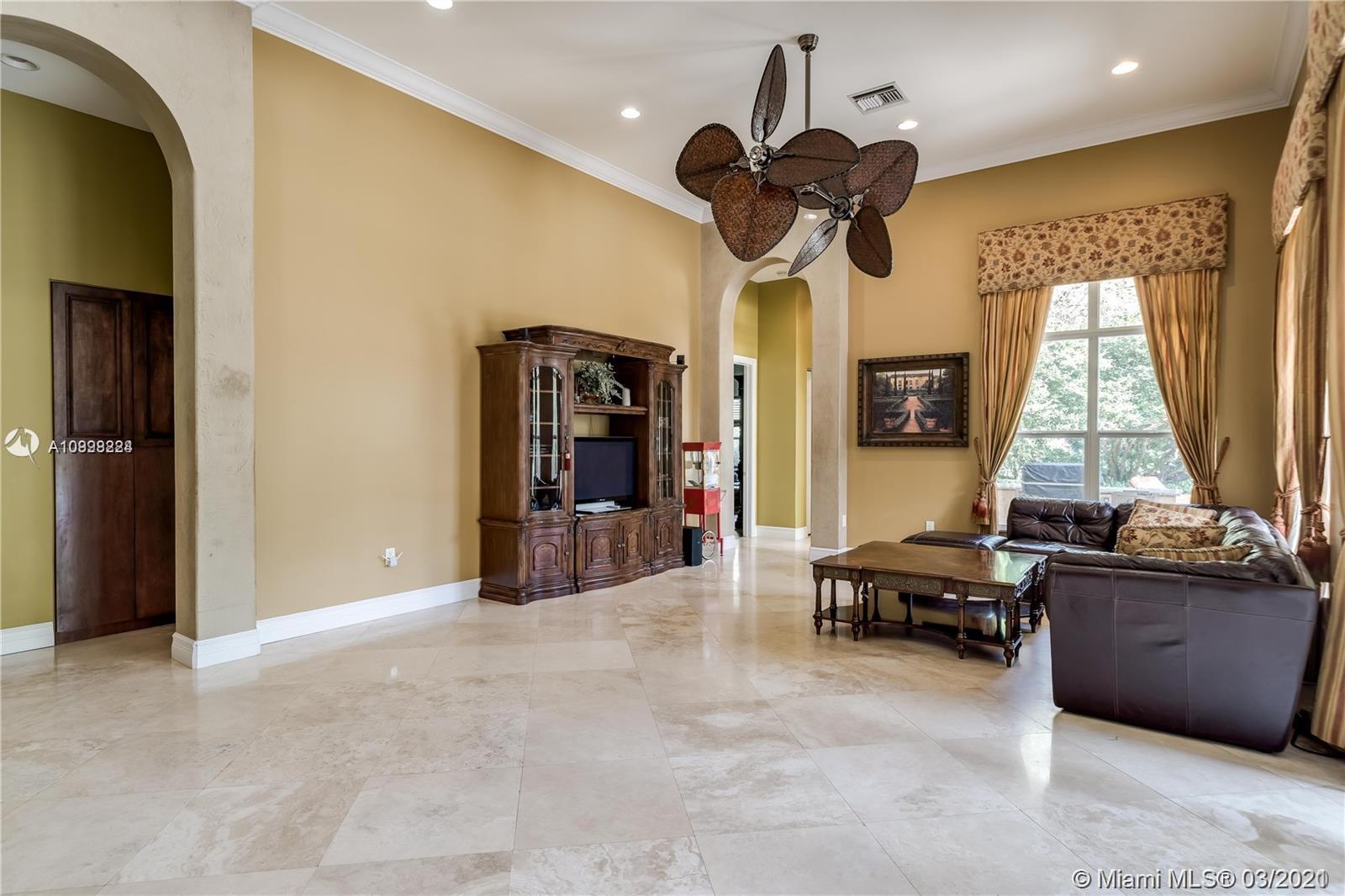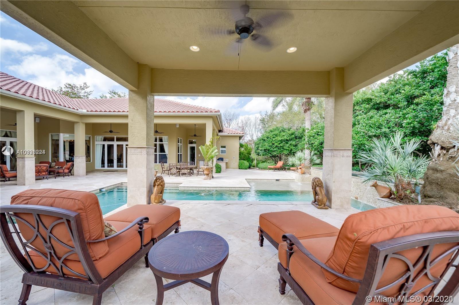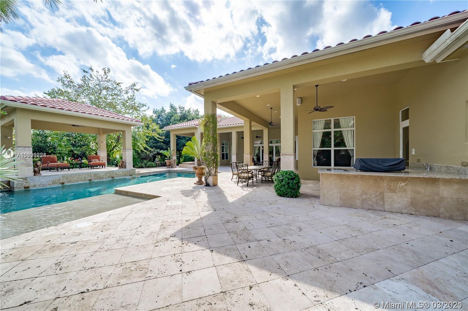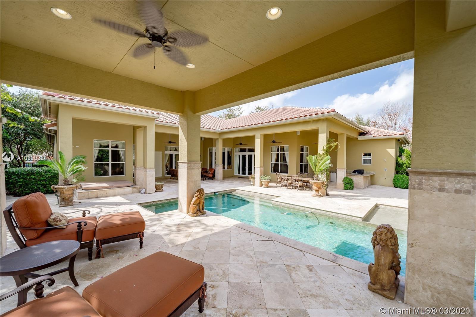 Enjoy class and elegance in this custom built triple split 6/5.5 + an office in the exclusive gated community of Paradise Pines. Soaring Ceilings and exquisite marble floors in all living areas, and wood in all bedrooms. Expansive master suite w/sitting area, two walk-in closets, and grand master bath w/roman spa shower. Gourmet kitchen featuring Viking gas stove, double over overlooking the sprawling family room. Tuscan pool w/cascading waterfalls, marble gazebo, summer kitchen, and spa. Impact windows, Porte-Cochere, and the list goes on.