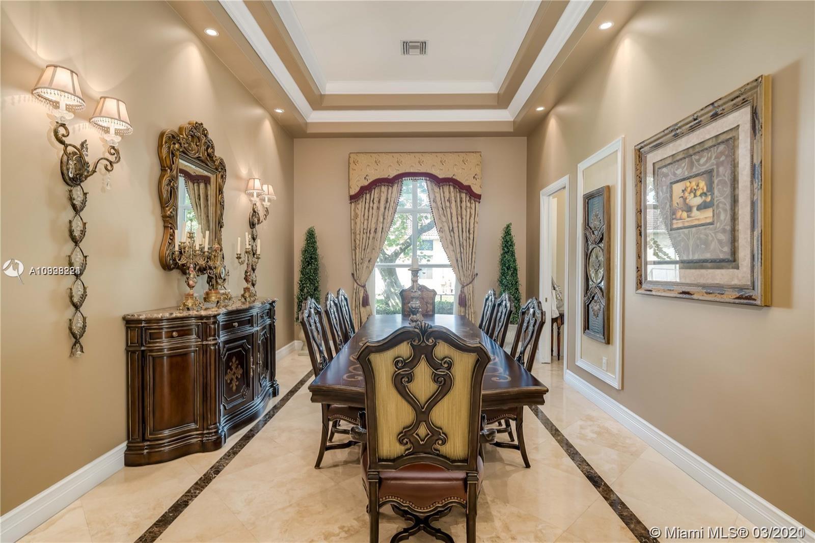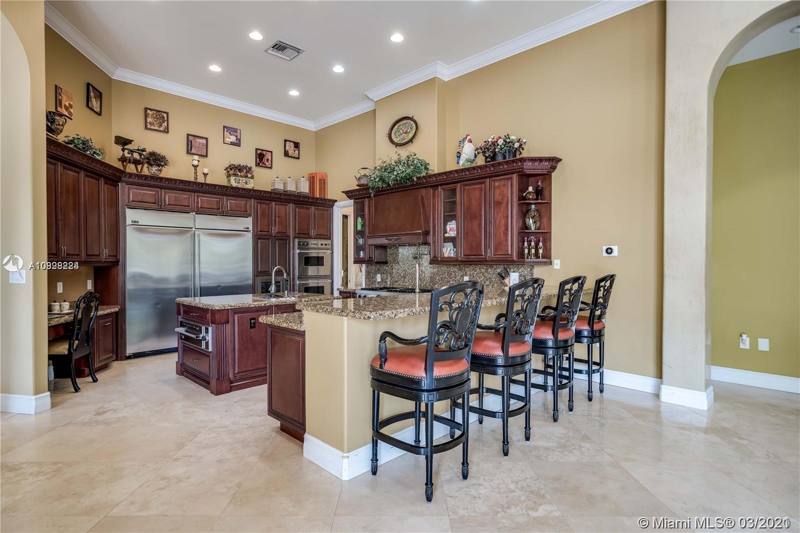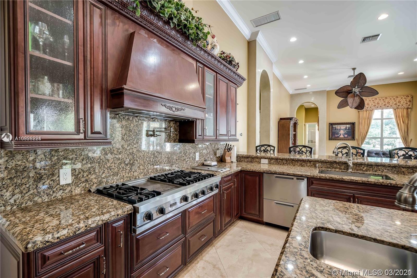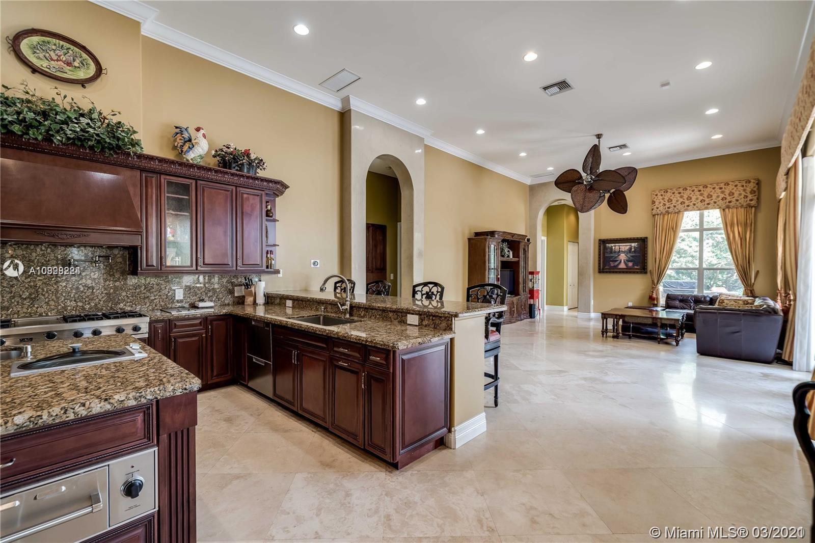 Enjoy class and elegance in this custom built triple split 6/5.5 + an office in the exclusive gated community of Paradise Pines. Soaring Ceilings and exquisite marble floors in all living areas, and wood in all bedrooms. Expansive master suite w/sitting area, two walk-in closets, and grand master bath w/roman spa shower. Gourmet kitchen featuring Viking gas stove, double over overlooking the sprawling family room. Tuscan pool w/cascading waterfalls, marble gazebo, summer kitchen, and spa. Impact windows, Porte-Cochere, and the list goes on.