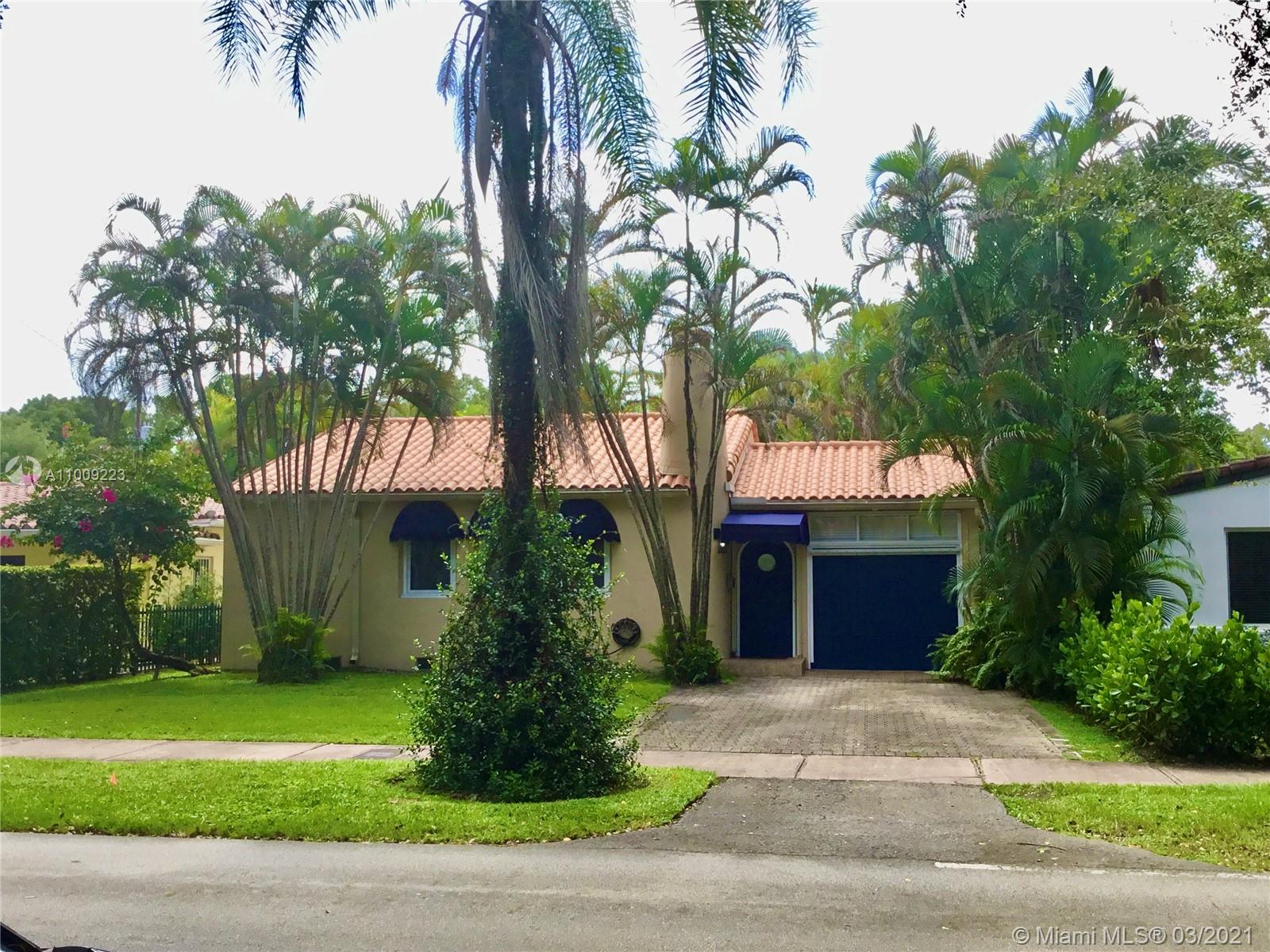 This 1,325 sf (per appraisal) beautifully updated 1937 Old Spanish Deco style Home is located in the highly desirable neighborhood of Coral Gables. Spacious, open concept great room (living/dining) features 17-foot vaulted/exposed pecky cypress wood beam ceilings, a stunning wood burning fireplace with marble mantle/floor accents & refinished original hardwood floors. Bedrooms have ample walk-in closets. Renovated kitchen includes an oversized pantry & has French doors that open unto a garden patio ideal for morning coffee. A set of French doors welcome a sunroom/office overlooking a sizeable terrace perfect for outdoor entertaining & a lush-green backyard with plenty of room for a pool or future expansion.