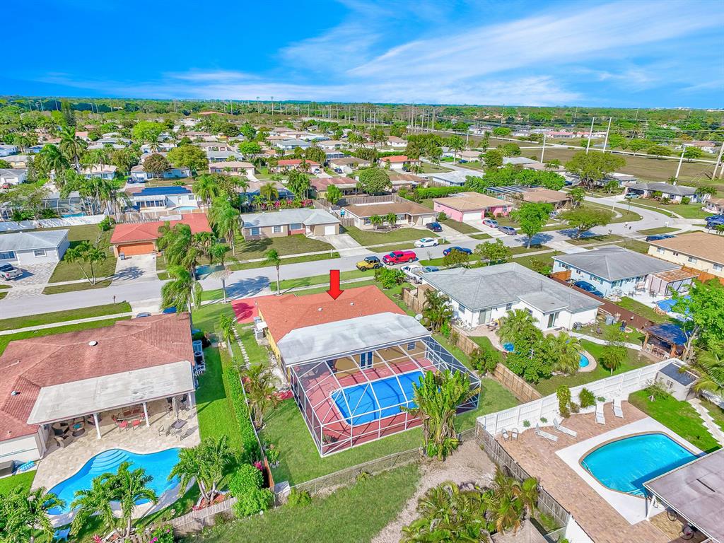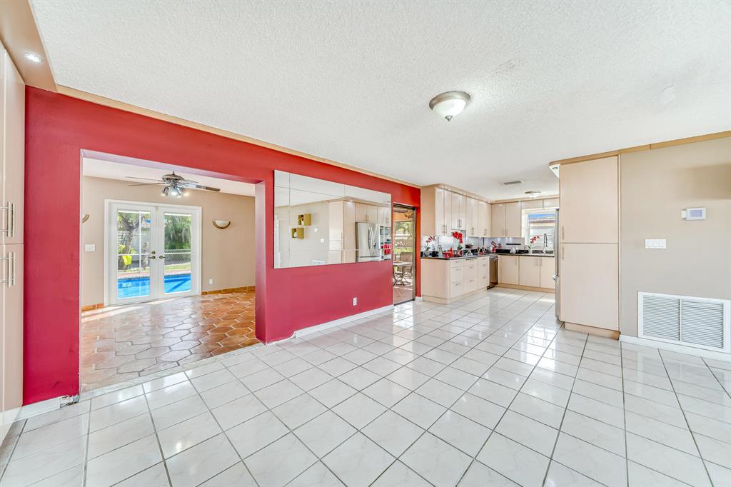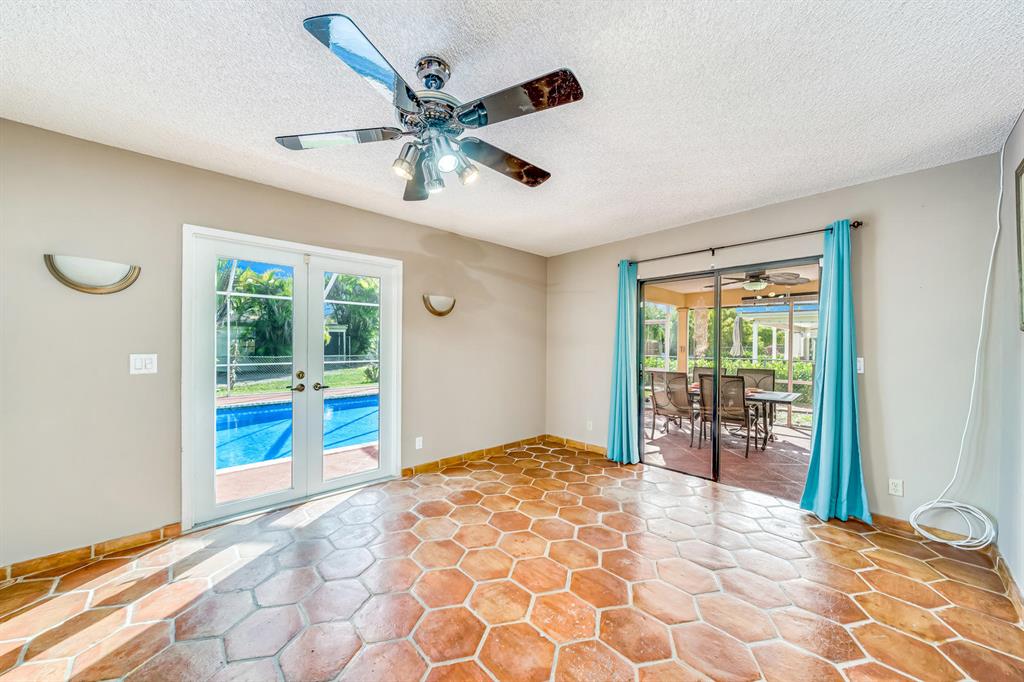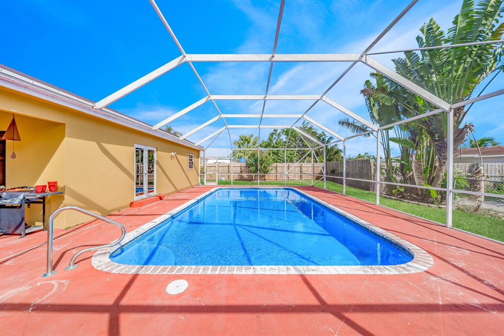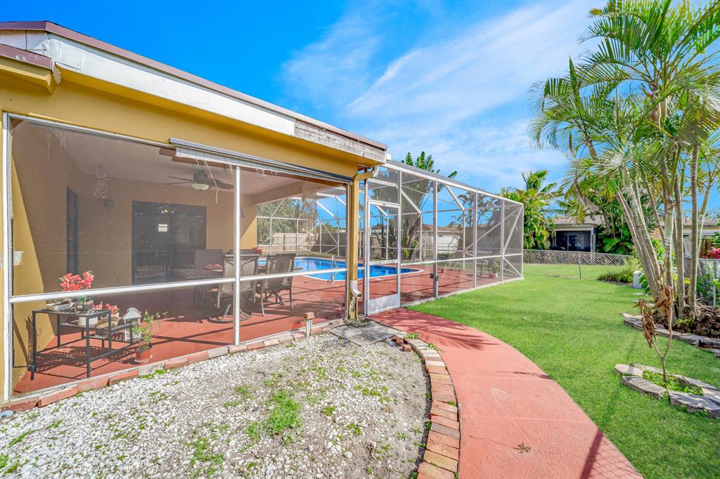 Spacious & open 3 bedroom plus big playroom/bonus space/den (could be 4th bedroom), 2 bath, POOL, 1 car garage with double wide driveway, huge backyard with covered & screened in patio with a huge sparkling swimming POOL that was just diamond brighted with the deep blue color called Azzure. New roof from 2018! Tile flooring in the living areas and laminate flooring in the bedrooms. Kitchen features granite counter tops and stainless appliances. There are tons of cabinets plus a wall of cabinets in the dining room! Large bonus room makes a great 2nd family room, playroom, man cave, office, gym etc. Move in Ready! A tropical paradise awaits you outside featuring a huge fenced in yard with mature trees including several mango trees & birds of paradise.