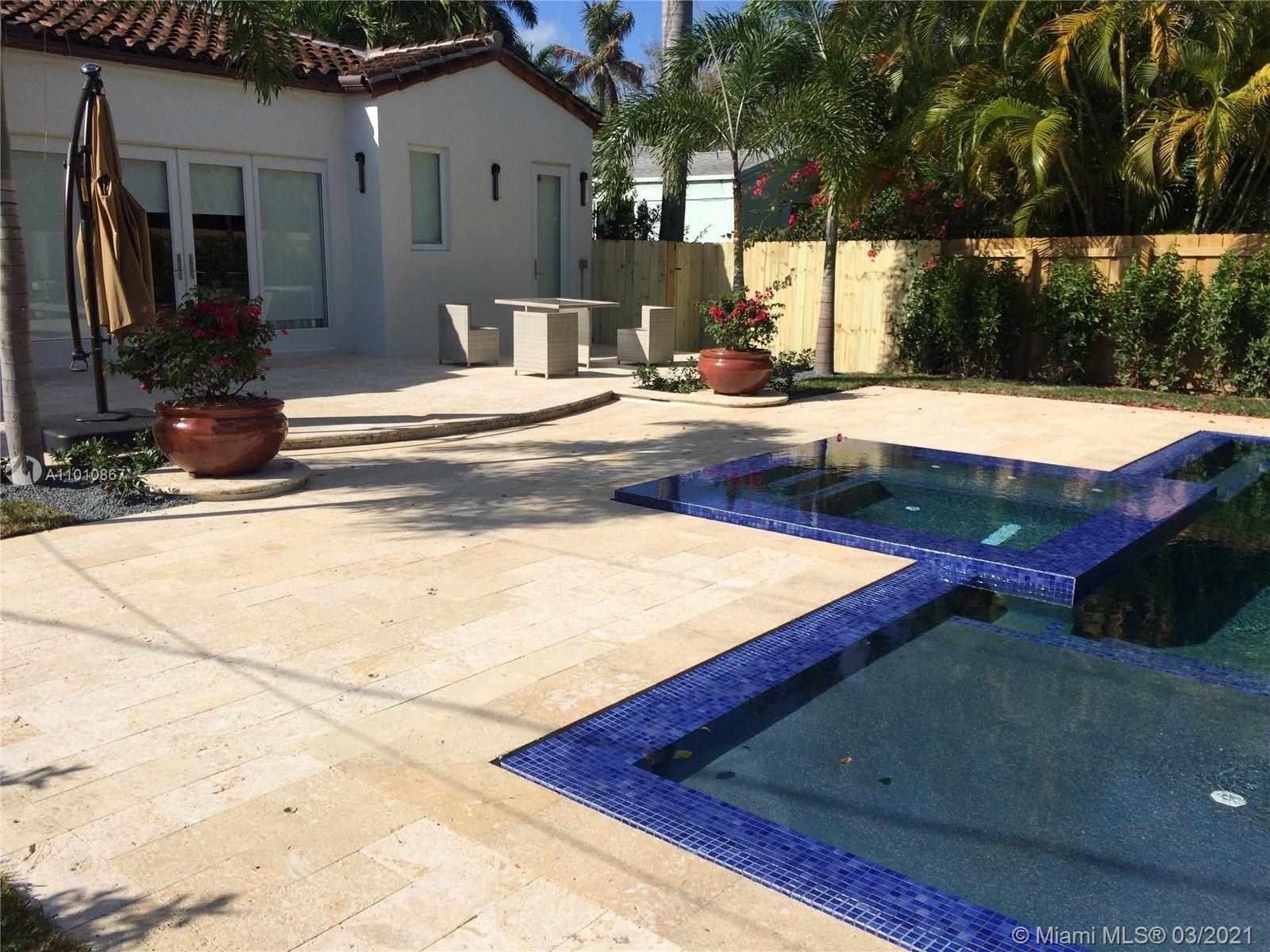 Spectacular, 4br/3bth completely remodeled in 2015. Contemporary inspired decor w/ all custom finishes. This 1 story beauty sits on a very private lush tropical garden w/ a gorgeous heated saltwater pool & spa and expansive space for entertaining. Interior features include: Expansive flow-through luminous space w/ chef’s kitchen, gas cook top w/ out flowing exhaust vent, Italian cabinetry, gray quartz countertops, sub-zero & wolf appliances, wine cooler. 9’5ft ceiling. 8ft doors. Oak wood floors imported from Holland. Sound system inside & out. Led lighting throughout. Impact doors & windows. Master suite offers custom walk-in closet & completed w/ a spa-like master bath w/ double sinks and jet, hand & rainfall shower. Owner spared no expense. SELLER MOTIVATED.