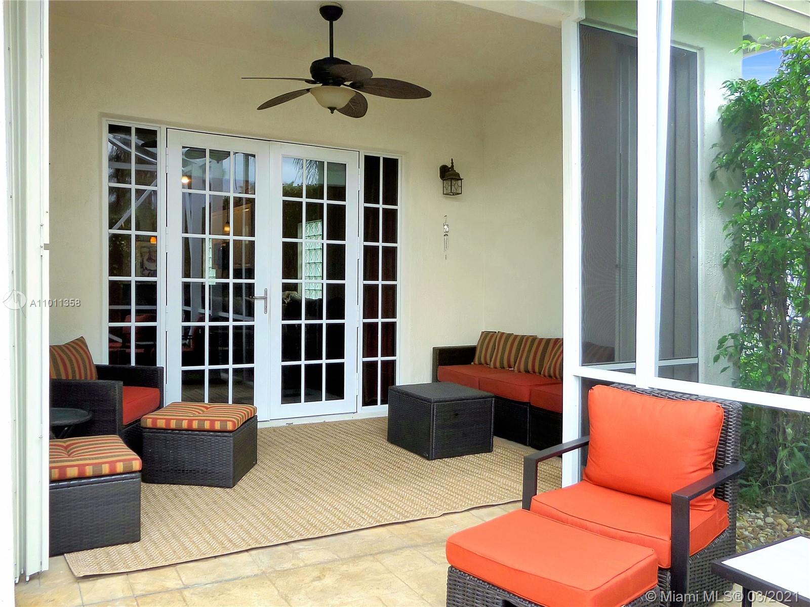 Amazing opportunity… updated 4 B/R, 2 bath ONE STORY home in one of the finest gated developments, Grand Palms - the only area golf course community (membership not required, sold separately). Generously-sized bedrooms, high ceilings add to spaciousness. Master and one bedroom off one hallway, and two bedrooms off another hallway. Dual-entry bathroom between the two hallways. Private screened porch and patio, with sizable L-shaped yard. Accordion shutters, plus impact french doors to the screened porch. White kitchen with darker granite counters and stainless appliances. Darker wood floors in living areas, tiled kitchen floor, travertine bathrooms, carpeted bedrooms. Newer A/C and water heater. HOA includes lawn and tree trimming, gate security and patrol, pressure cleaning, cable, alarm.