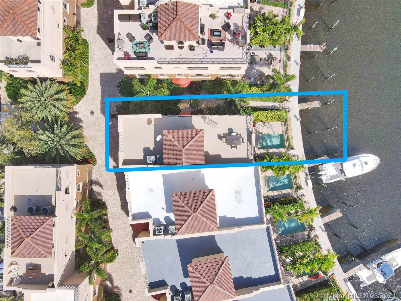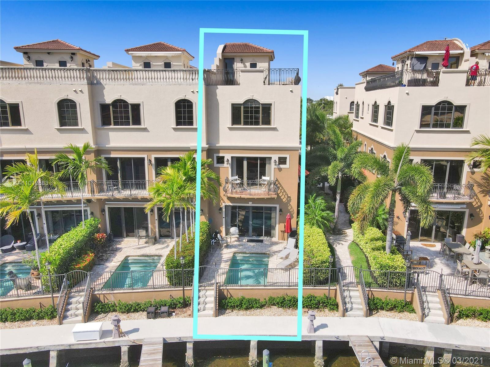 This 4 Story Townhouse is a boater's dream with its own dock making Lake Santa Barbara your backyard with ocean access & no fixed bridges. The 1st floor has a 2-car garage, foyer, bedroom/den, walk-in closet + full bath. Enjoy your private elevator that stops on every floor and the rooftop terrace. The 2nd floor perfect for entertaining with a large living room, dining area, kitchen, laundry room, pantry & guest bath. The 3rd floor includes the primary suite, 2nd bedroom with respective bathrooms & walk-in closets. The expansive rooftop patio terrace features 360-degree water and city views. This is 1 of Only 7 units in this community that has a private pool. This exclusive end unit has large windows, light filled rooms, expansive views & pet-friendly. Dreams do come true!