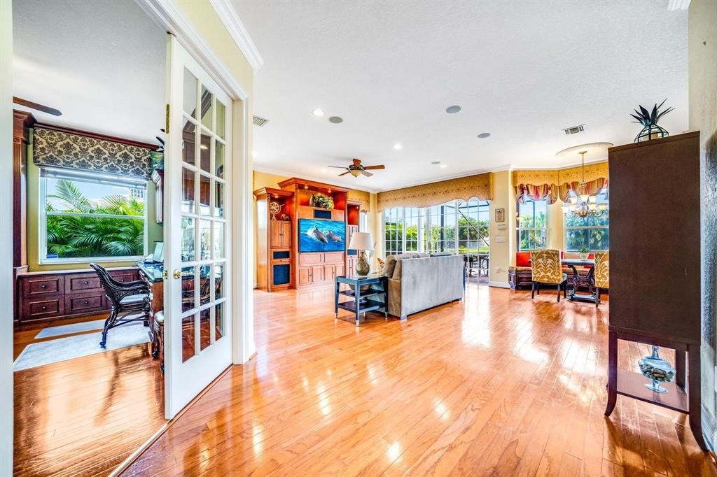 One of a kind opportunity to own a beautiful two story home with a pool and water view in the sought after community of Saturnia! Come see this spacious 5 bedroom, 4 bath Chateau Lafite model including a den off the master bedroom, and a 3 car garage. Gorgeous wood floors throughout the main living areas and carpet in the bedrooms. The gourmet kitchen features wood cabinets with plenty of storage, granite countertops, stainless steel appliances, including a double oven, and a built in custom breakfast nook along the bay window. Perfect for entertaining as the kitchen flows into the large enclosed veranda with new summer kitchen overlooking pool and lake! Surrounded by lush landscaping, enjoy the privacy of being a corner home, while also walking distance to the clubhouse.