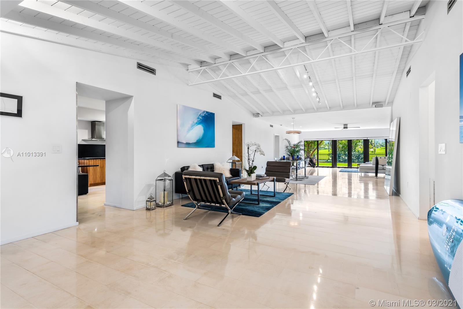 Enjoy premier views of the beach skyline & 11th Fairway on exclusive La Gorce CC greens from this totally renovated immaculate 5 bd/5.5 ba move-in ready home! From the moment you enter, be captivated by bright, airy & open plan boasting floor-to-ceiling complete impact glass & soaring vaulted ceilings. Fully upgraded kitchen sports Miele & Wolf appliances, 2 Sub-Zero refrigerators, wine fridge & breakfast nook. Relax in the spacious master w/ spa-like bath & direct access out to the lush yard overlooking pond & golf course. Attached 1/1 guest quarters w/ private entrance provides separate kitchen & laundry for office, in-laws or flex space. Kitchen & baths tastefully updated. Superior specs include: Lutron lighting, 2-car covered parking, & expansive outdoor wood deck/trellis!