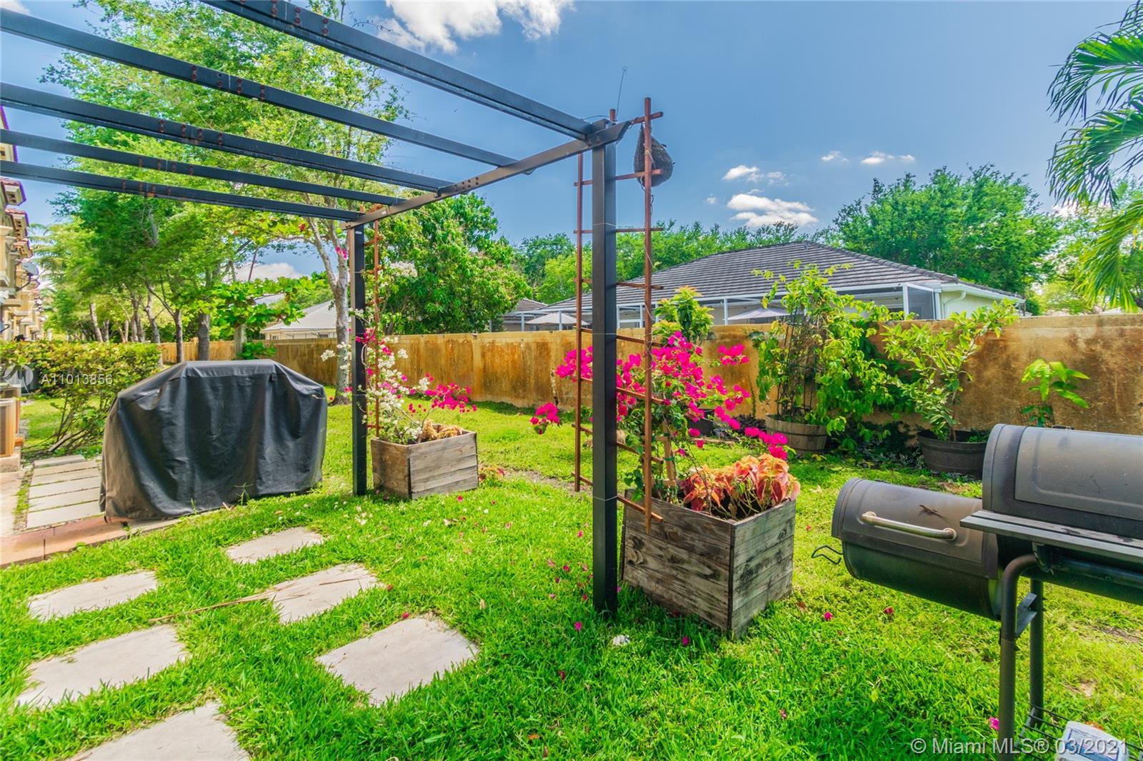 Home Sweet Home in Miramar a beautiful, bright and spacious 3 bedroom 2.5 bathroom townhouse on a corner lot. Open concept kitchen and living area with high ceilings. This home features a cozy outdoor entertainment area with covered pergola and landscaping. New wood look porcelain tile on the main floor and wood laminate in bedrooms and throughout. Newly renovated half bath, stainless steel appliances, front load washer and dryer, central AC and smart thermostat. Pet friendly gated community, close to parks, highways, shopping, entertainment and more. 2 parking spots with plenty of guest parking and of course, there is a pool. Contact free showing available, please click on links for virtual tour. In-person showings by appointment only, please contact listing agent. Masks req.