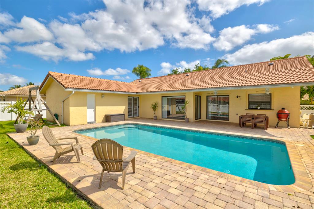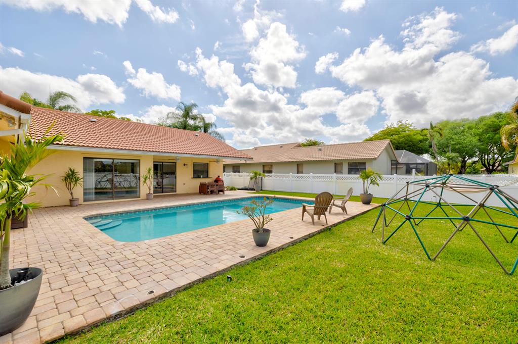 Beautiful updated pool home in the desirable Coral Springs Pine Ridge community. This 4 bedroom, 2 bath home has an open floor plan with vaulted ceilings. Tile floors throughout. Updated kitchen with pantry and laundry room. Master bath was beautifully renovated in 2021 and has a private pool access door. Master bedroom has his & her walk-in closets and plantation shutters. Large yard is fully fenced and the pool area has safety gate included. Sprinkler pump was replaced in 2020 as well as a new pool pump 3 yrs ago. The circular driveway & 2-car garage provide ample parking. Hurricane protection~panel shutters. Close to highways, great schools, shopping & restaurants. This house is move-in ready with too many features to list. Come see for yourself and bring offers. This one won't last!