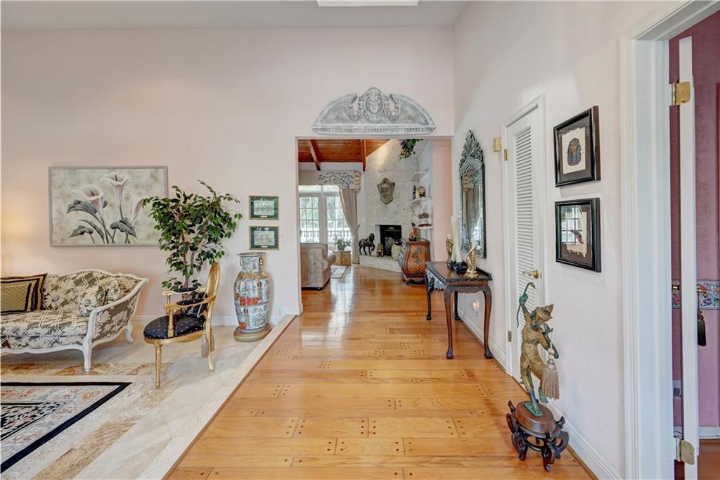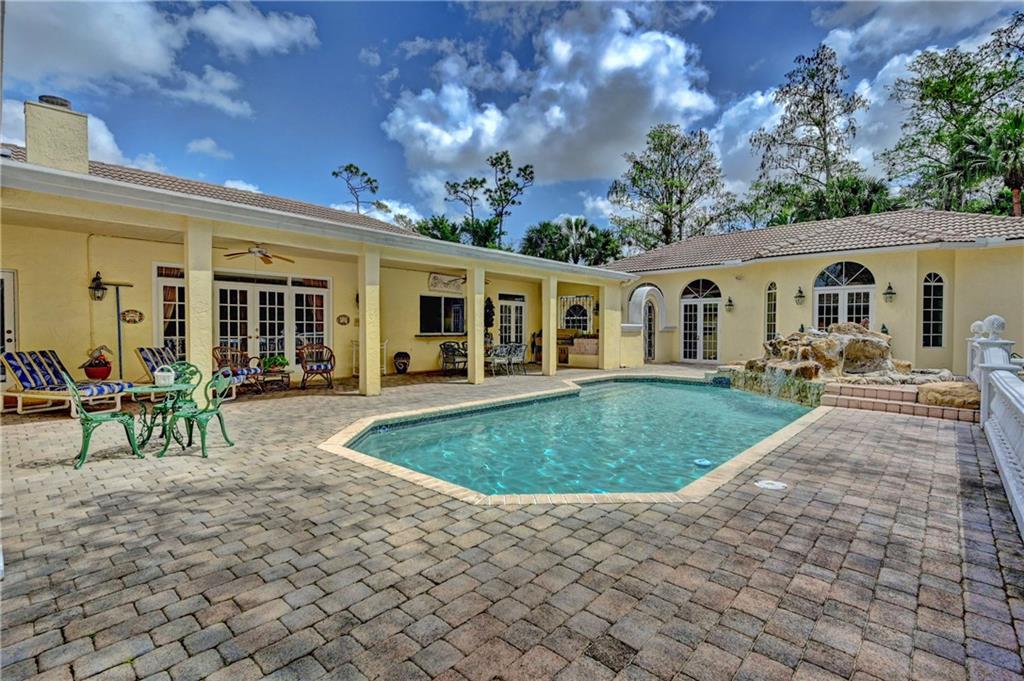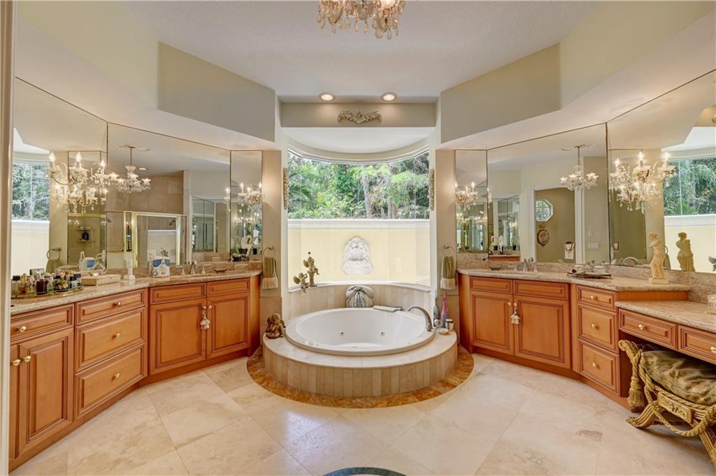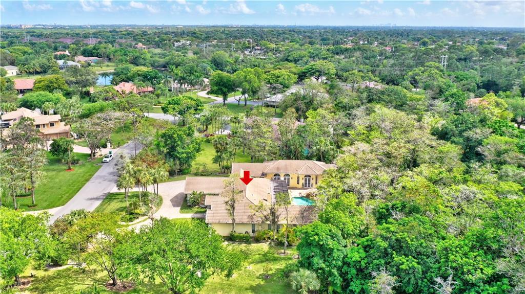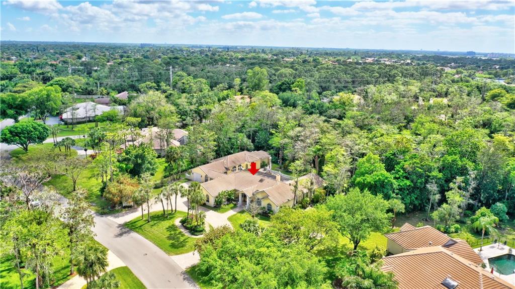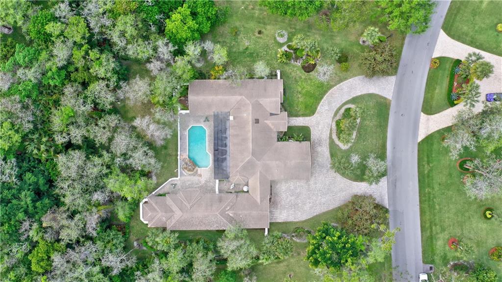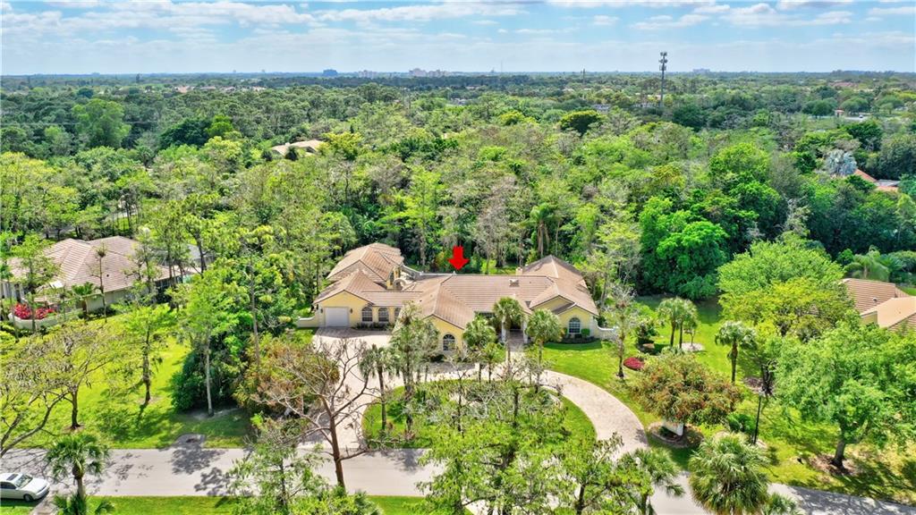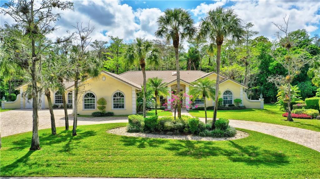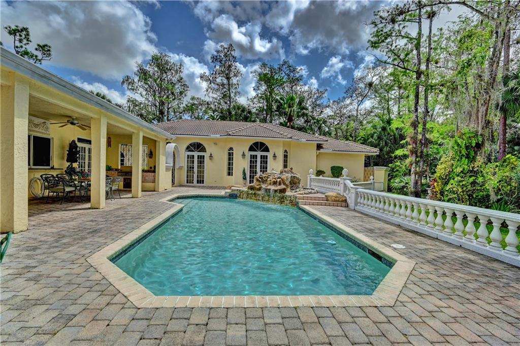 Spectacular 4/3 Estate home with added 1/1.5 guest wing situated on 1+ acres in the prestigious Whispering Woods. This sprawling pool home features: circular paver driveway, Saturnia Marble & Wood floors, vaulted ceilings w/recessed lights, crown molding, real wood-burning fireplace, formal dining/living room, family room, 5th bedroom is a den (no closet), eat-in kitchen w/granite, wall oven & cooktop stove, cabana bathrooms, spacious Master Suite boasts His/Her walk-in closets, dual sinks & walk-in shower. French doors open to a covered patio area w/lush landscaping surrounding the pool & built-in Summer kitchen. Beautiful Guest wing added in 2001 with hurricane shutters, 1 car garage, Marble floors, bar/kitchenette, expansive master bedroom w/walk in closets, separate AC & water heater.