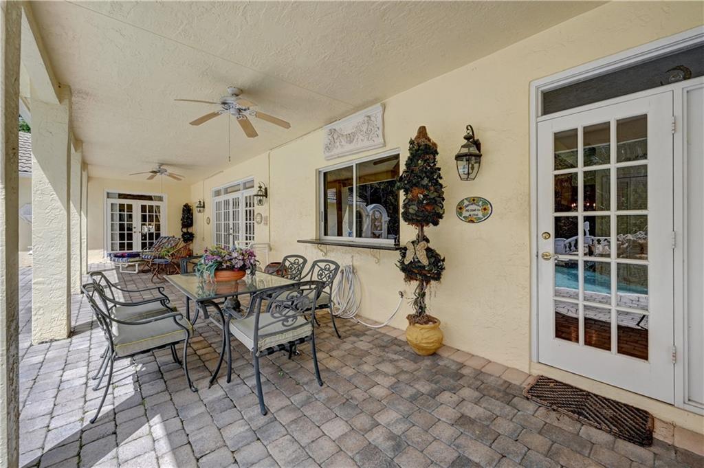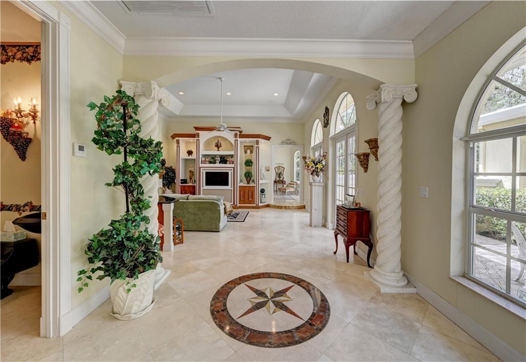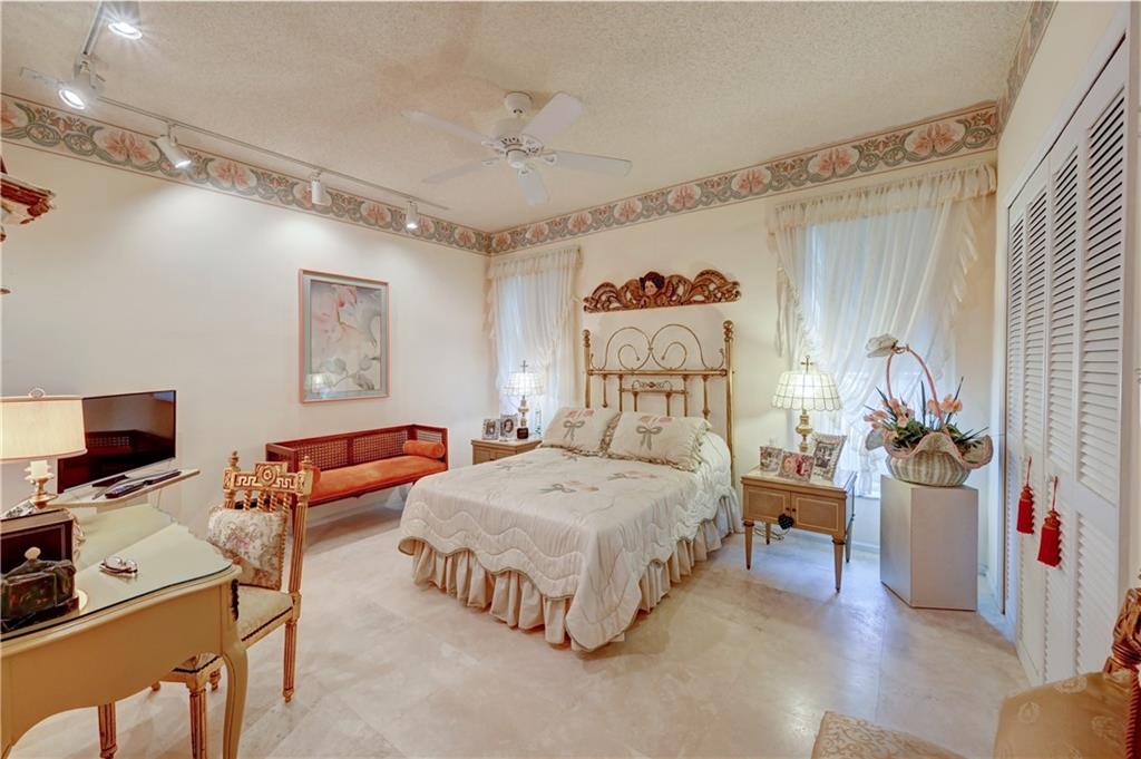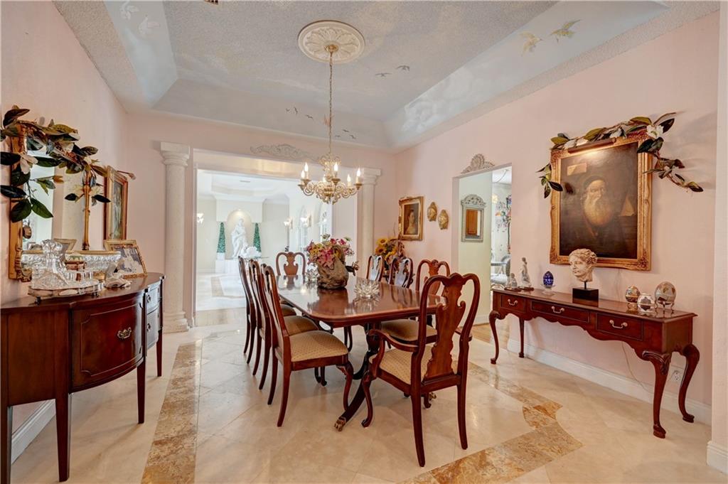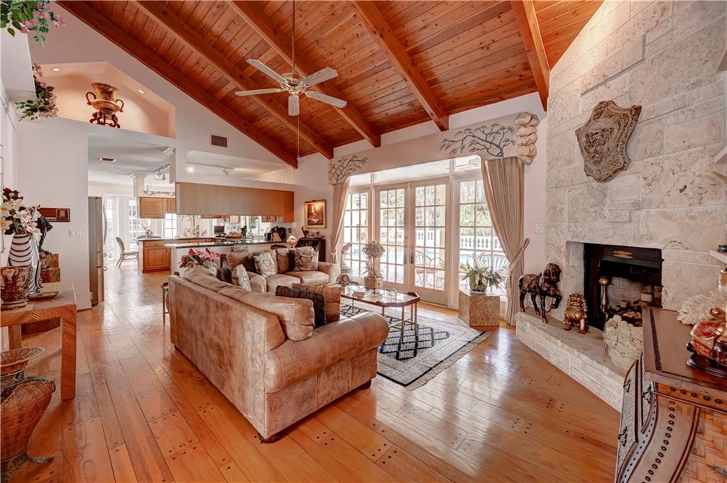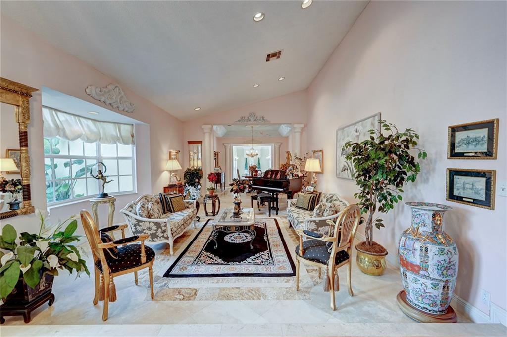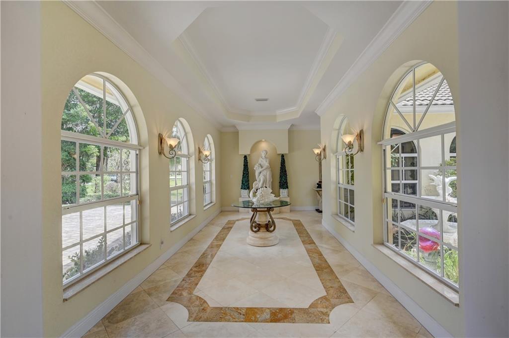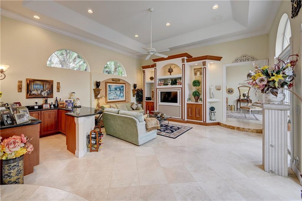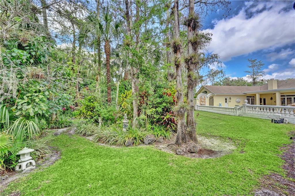 Spectacular 4/3 Estate home with added 1/1.5 guest wing situated on 1+ acres in the prestigious Whispering Woods. This sprawling pool home features: circular paver driveway, Saturnia Marble & Wood floors, vaulted ceilings w/recessed lights, crown molding, real wood-burning fireplace, formal dining/living room, family room, 5th bedroom is a den (no closet), eat-in kitchen w/granite, wall oven & cooktop stove, cabana bathrooms, spacious Master Suite boasts His/Her walk-in closets, dual sinks & walk-in shower. French doors open to a covered patio area w/lush landscaping surrounding the pool & built-in Summer kitchen. Beautiful Guest wing added in 2001 with hurricane shutters, 1 car garage, Marble floors, bar/kitchenette, expansive master bedroom w/walk in closets, separate AC & water heater.
