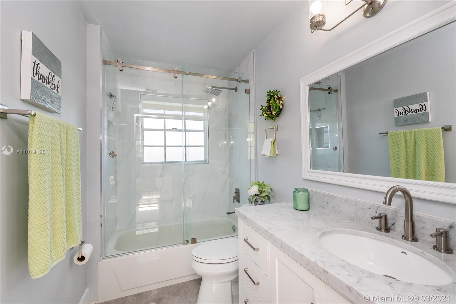 Completely remodeled spacious townhouse in the most desirable neighborhood - Doral Woods within Doral Park. 2,014 SF under A/C - 3 Bed/3 Bath w/ 1 bed & 1 full bath on 1st floor. Beautiful kitchen w/ quartz countertop, open to dining room, large pantry, breakfast area. All bathrooms remodeled, master w/ double sink, separate shower & modern bathtub. Spacious walk-in closet. New glass railing, all new floors: porcelain tile on 1st floor & beautiful wood-like vinyl on 2nd. Open patio, great for entertaining. 1 car garage & 2 parking spaces. Impeccable conditions, ready to be occupied. In addition to Doral Woods' pool, membership to Doral Park Country Club is included in HOA fee: pool, tennis, party rooms, gym, restaurant, golf w/green fee. HOA includes roof(20-25 yrs)/exterior paint(6-7 yrs)