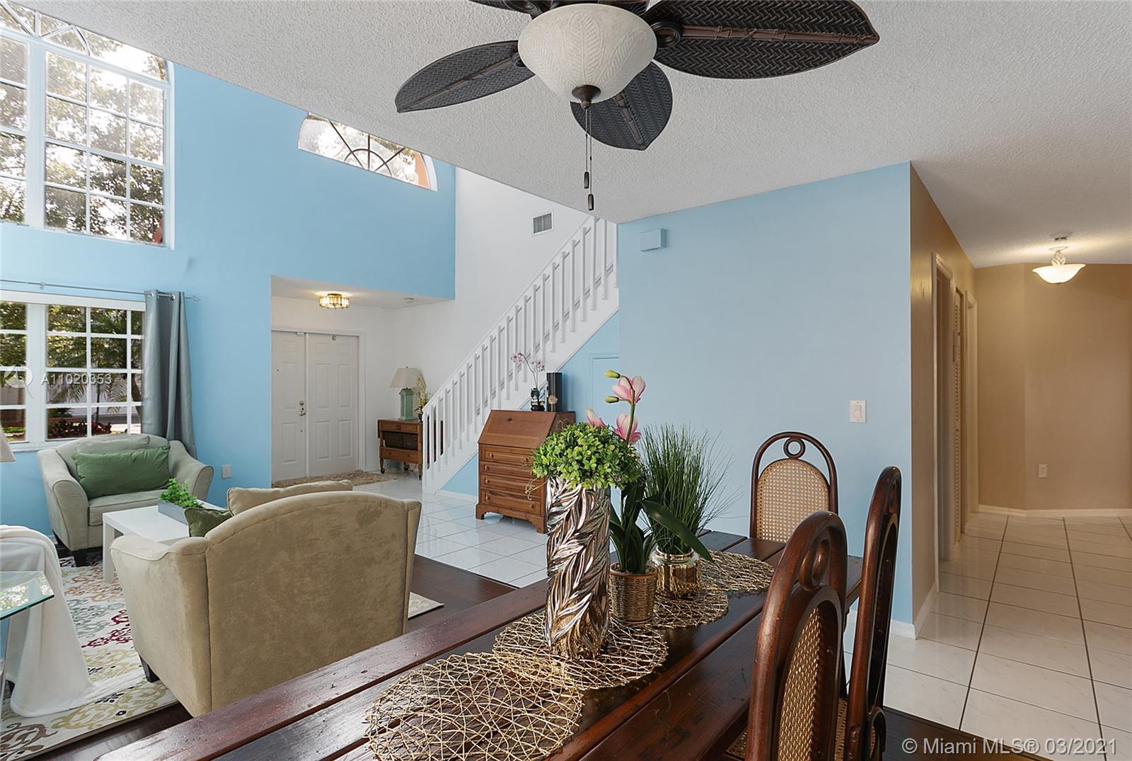 Feel instantly welcome as you enter this bright & airy 3 bedroom 2.5 baths home that boasts a total living space of 2678 sq ft, open floor plan with vaulted ceilings in both living & family room, charming dark laminate wood flooring on stairs, upstairs, formal living, formal dining and all bedrooms complementing white tile floor in other areas. Hurricane shutters throughout except for 1 window in the front. Kitchen features ample counter space, an L-shaped island, a breakfast nook & nice pantry that open up to the family room. Large sliding door from the family room leads you to a backyard oasis. Master en-suite downstairs with beautiful garden view & 2 bedroom upstairs with a loft on the 2nd floor landing can be used as an office, reading nook or a TV corner. Low HOA fees. See it today!!