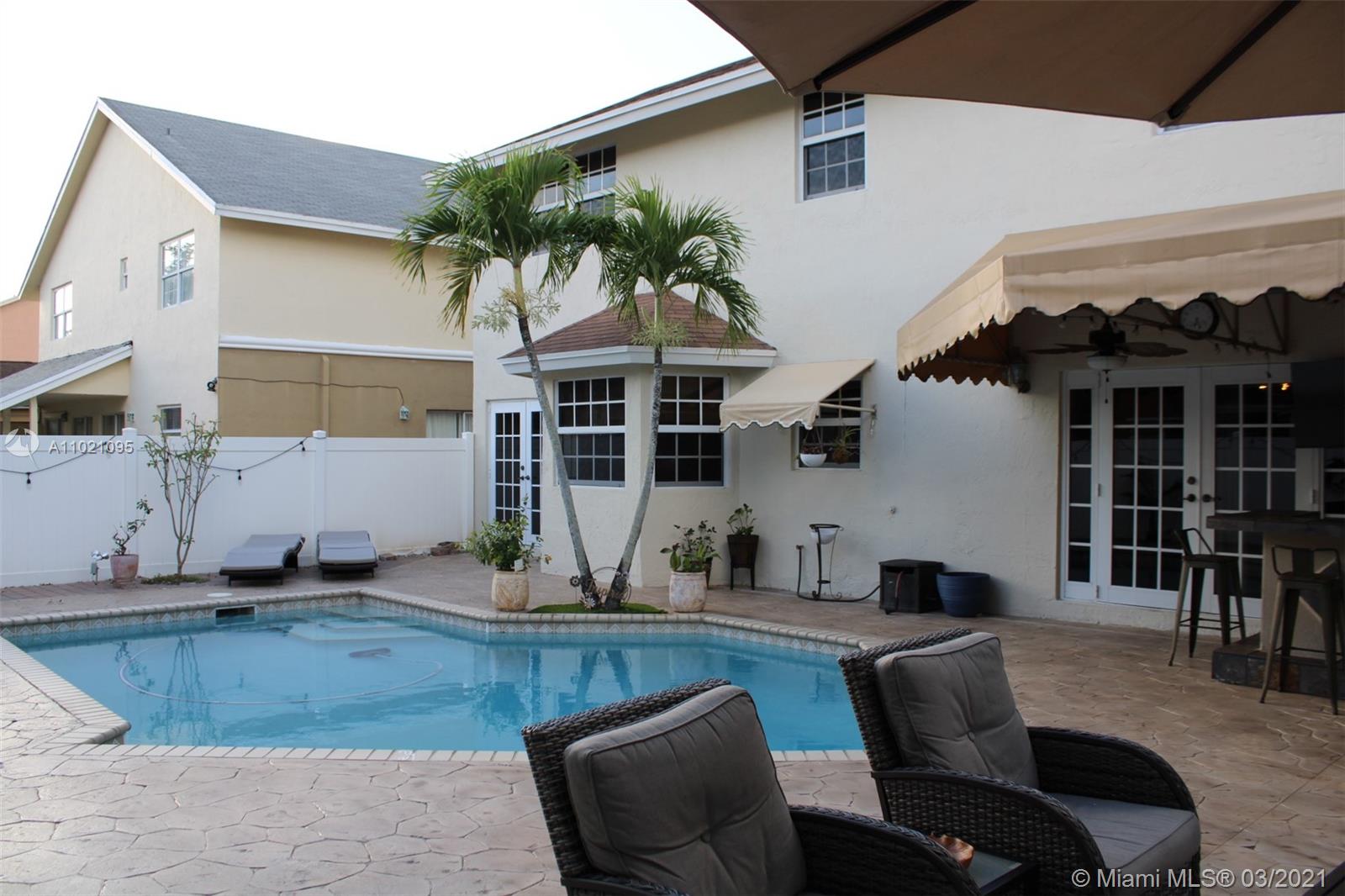 Dreamy two-story home centrally located within a quiet community in Pembroke Pines. Near Pembroke Lakes Mall, the Shops at Pembroke Gardens and close access to all major highways (I-95, turnpike, 826 and I-75). This beautiful home comes equipped with impact windows,new vinyl wood flooring throughout the second floor and stairs, a new 5 ton Rheem AC system and Nest thermostat, Ring camera/security system, new Bar/Grill for the hot summers by the pool, which was resurfaced 2 years ago along with color changing LED lights. The rear deck and front driveway were painted earlier this year in January and the house was freshly painted just last month. Open House this Saturday from 11am-2pm Agents submit a DU approval with your offers. POF or DU (with proof of down payment/closing cost suggested