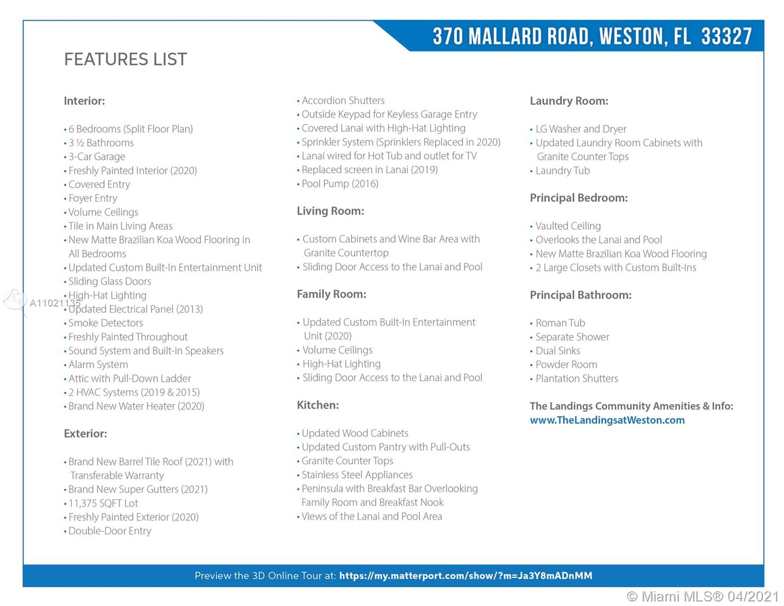 Spacious home in Mallard at The Landings features 6 bedrooms (triple-split floorplan), 3 ½ bathrooms (including a Cabana Bath), 3-car garage, expansive screened lanai and pool area, brand new roof (2021) & super gutters, tile throughout main living areas, new matte Brazilian Koa wood flooring throughout all bedrooms, updated kitchen with wood cabinetry & granite counter-top, with peninsula and breakfast bar overlooking breakfast nook and family room with new custom built-in entertainment center, 2 HVAC units (2019 & 2015), freshly painted interior/exterior, volume & vaulted ceilings, formal living & dining rooms, laundry room and much more. Amenities include 24-hr guard-gated entrance, playground area / tot lot, & basketball courts. All A-Rated public schools. 3-D Tour Available Online.