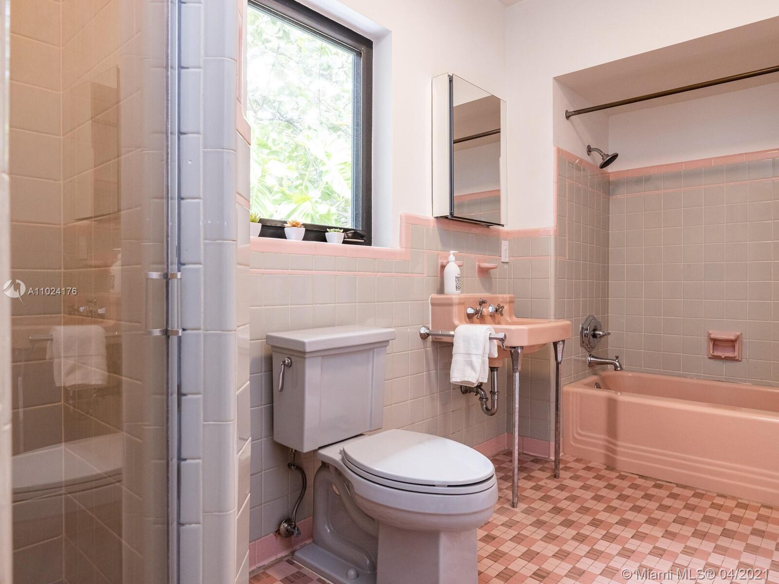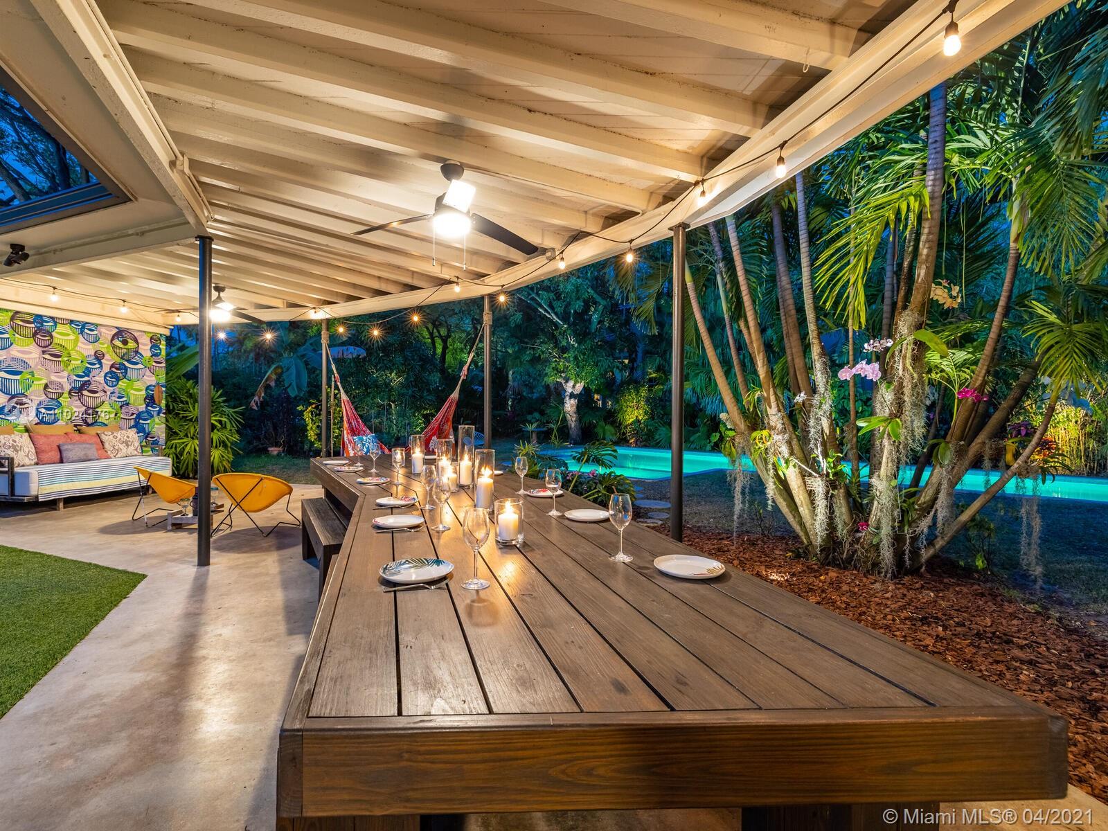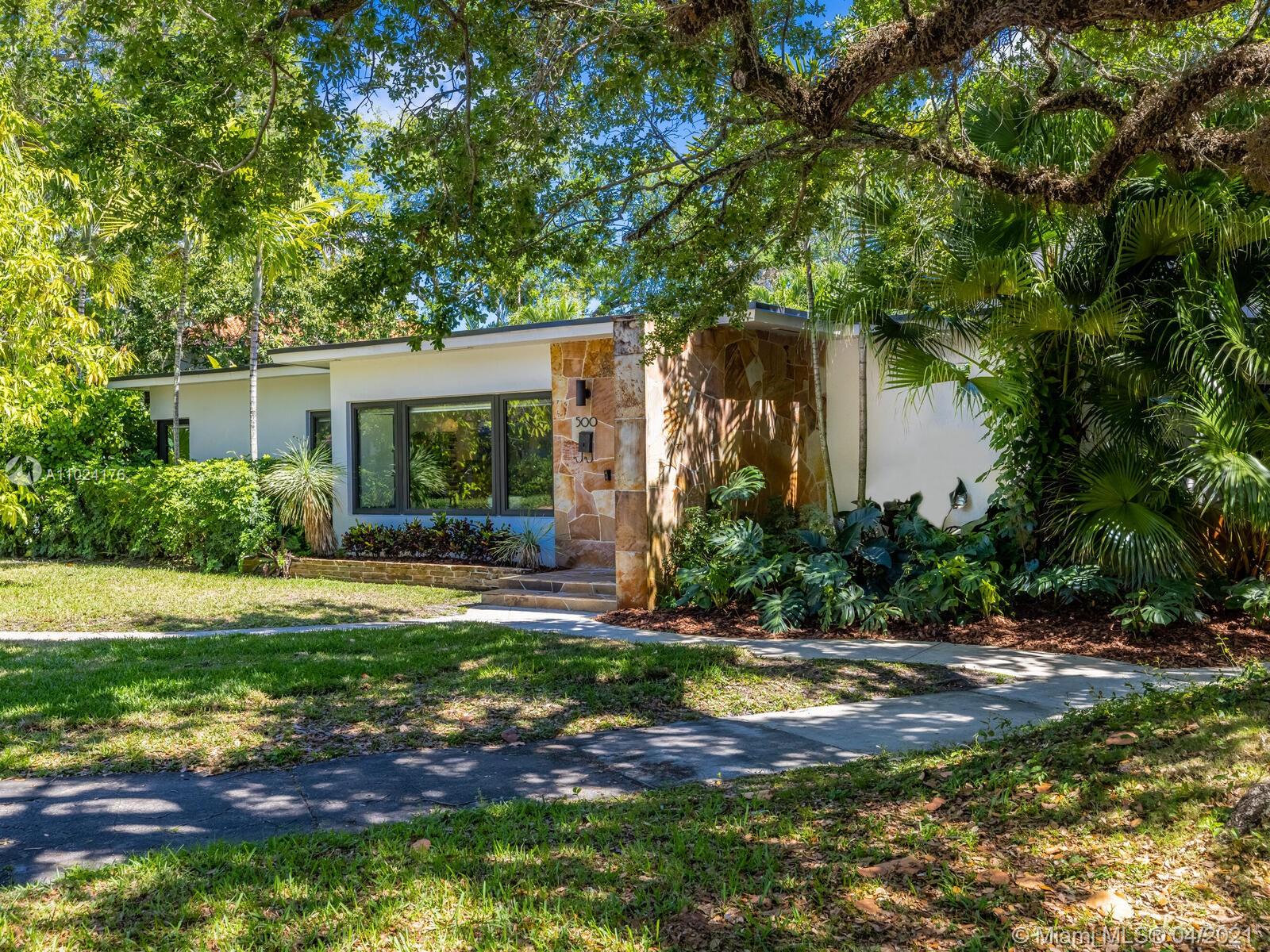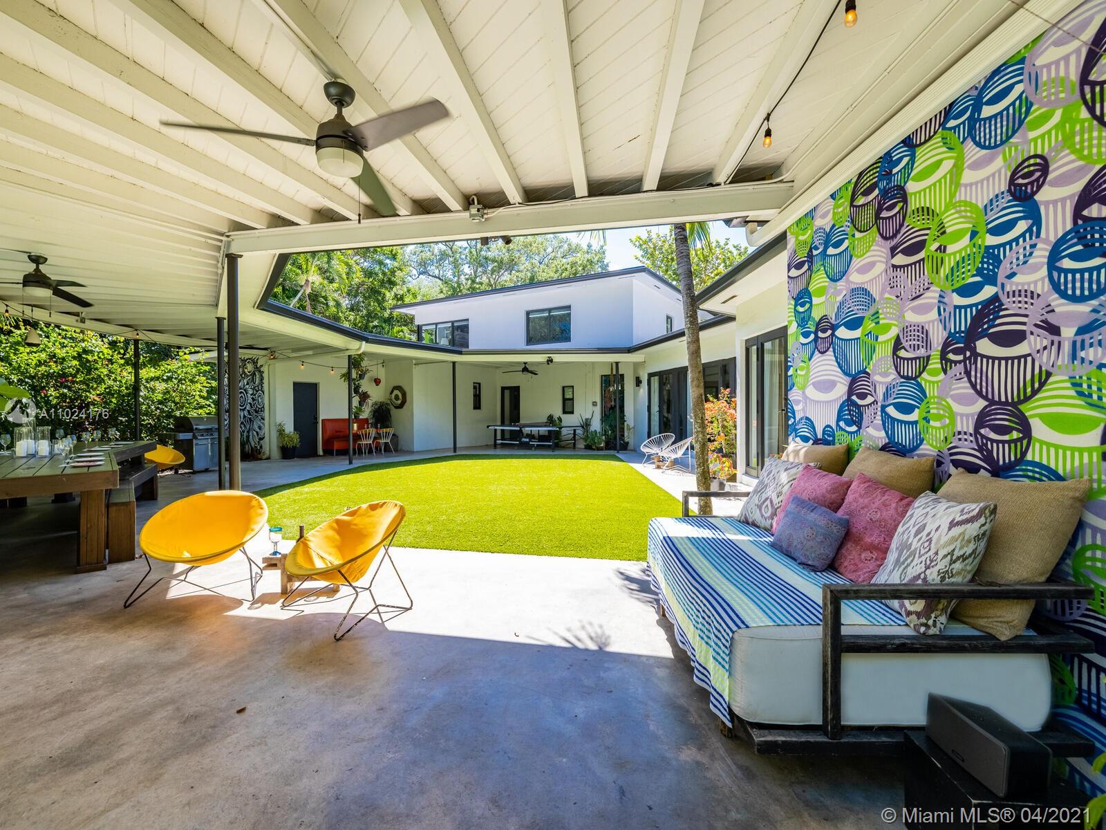 Welcome to The Panorama House! Recently renovated sprawling Mid-Century Modern marvel by noted architect, Joseph De Brita. Cleverly designed on a 1/2 acre corner lot, it wings out to an expansive hexagon-shaped loggia and stunning lush gardens with new sparkling 42’ pool with sun shelf. So much room to relax or entertain! Great layout and authentic character: eat-in Italian designer kitchen, split bedroom plan, new luxurious spa-like master suite retreat, plus preciously-preserved Instagram-ready vintage baths, a bonus guest suite and a 468 SF screening room! Feels like an exclusive boutique hotel with Andy Warhol wallpaper, Wynwood Walls-inspired custom murals by top artists and a forest of edible trees. New roof (2021). Experience your own private sanctuary in the heart of Miami Shores!