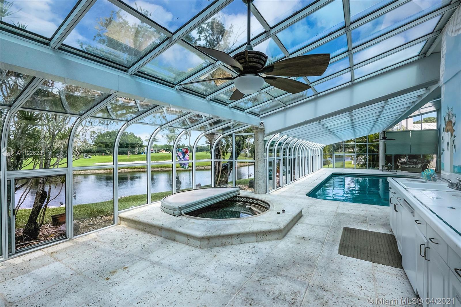 Home 4 sale in Jacaranda/Plantation. Over 4000sqft (perseller) 4/3 lakefront golf course home. Glorious outdoor entertaining area overlooks 2nd hole at Jacaranda Country Club. Beautiful mermaid mosaic diving size pool w/ new pump under a giant glass domed 1300sqft patio. Outdoor kitchen,refrigerator& huge covered seating area w/ AC for your outdoor pleasure. Huge super large bedrooms. 2 master suites. Sliders(but 1)are all pocket doors. Fabulous location on cul-de-sac dead end street. Xtra land purchased from golf course to water line. Access to golf course. New underground power lines, new AC w/ 10yr warranty, flat roof re-topped w/ 3yr warranty. Roof 12 yrs. Copper plumbing, floor safe, hurricane shutters, inside laundry room. Locking screen doors for entire garage. Some tlc needed.
