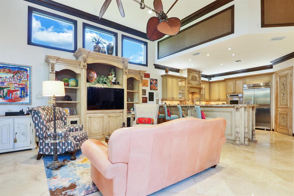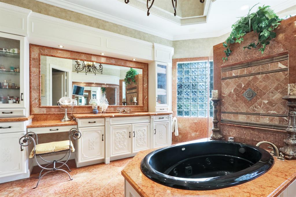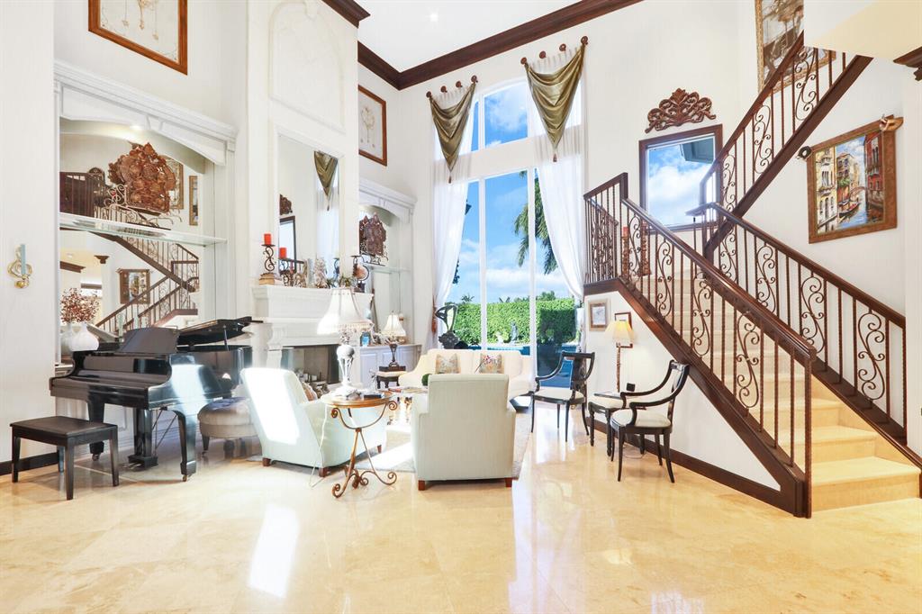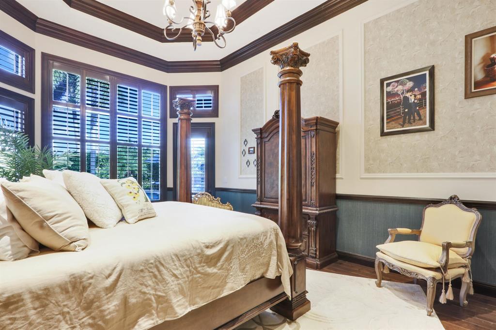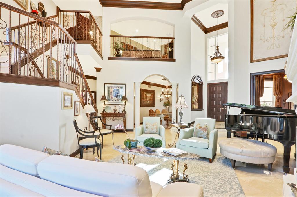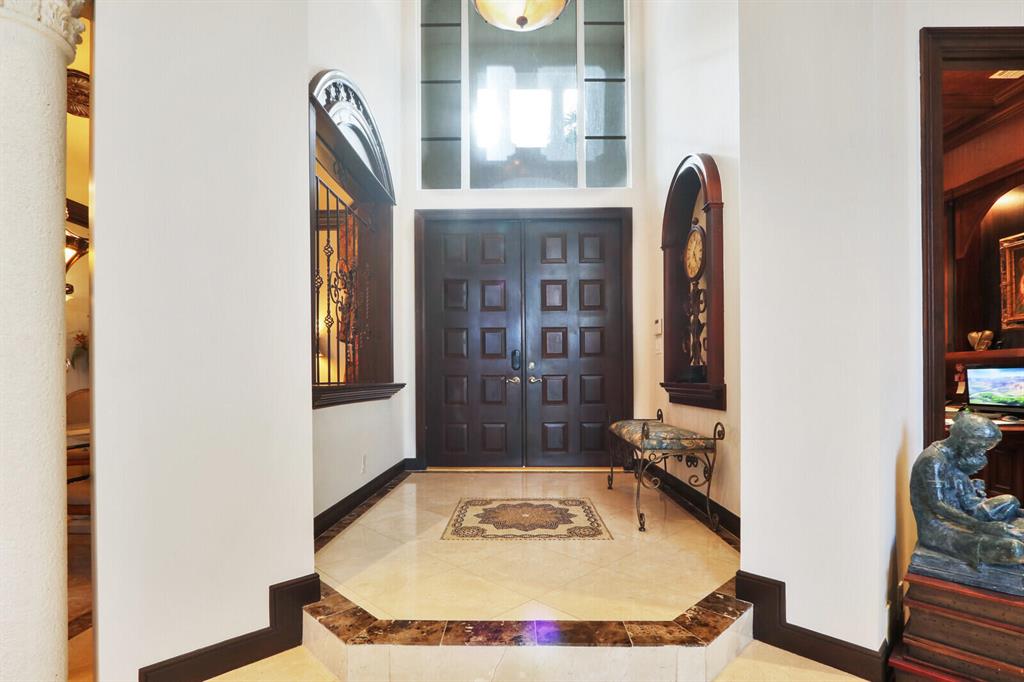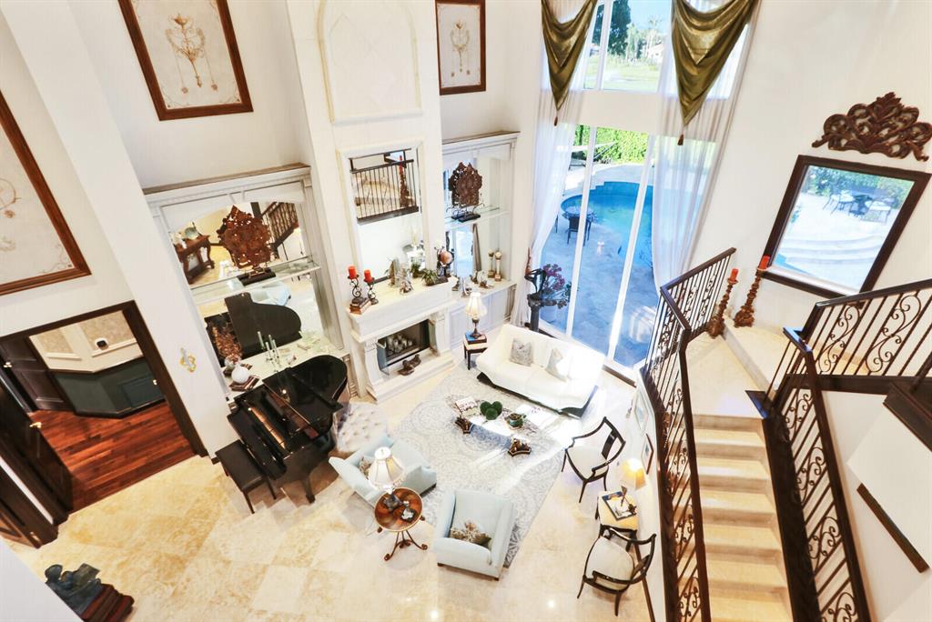 This upgraded and immaculate 5BR/5.2BA+Den estate boasts numerous recent improvements including a $130,000 pool and patio renovation. The dramatic two-story living room features a fireplace with refinished cabinetry, a wood and wrought iron staircase with polished marble flooring leading you upstairs to three bedrooms, two baths, and a versatile loft space. The main living areas feature oversized polished marble flooring in a light, creamy color. The master bedroom features new, upgraded wood flooring. Every room in this home features luxurious upgrades and custom details, adding sophistication and opulence. The freshly painted interior features moldings, elegant built-ins, custom designer window treatments and luxurious touches throughout.