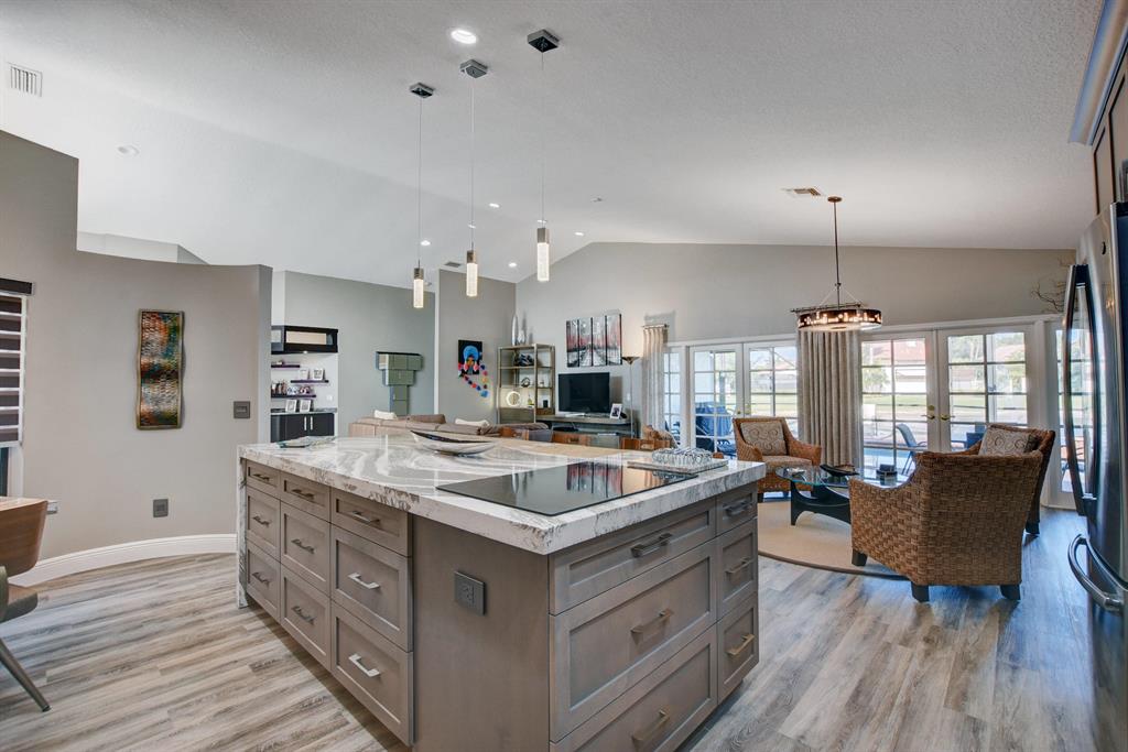 Wow! This one story 3/2.5, pool home with spectacular lake views has it all! Totally updated with custom finishes in the last 4 years including new roof, flooring, kitchen, baths and so much more! Kitchen is open to living and dining areas, waterfall Quartz Island, built in table, stainless appliances, and new cabinets. Huge master bedroom with custom walk in closet, dressing area and master bath with updated vanity and shower enclosure. Floor plan features two other bedrooms with large closets, cabana half bath, and large living and dining area. Beautiful pool and patio. Entire screen structure replaced 2015. Accordion storm shutters throughout. . Being sold partially furnished with top of the line furnishings.