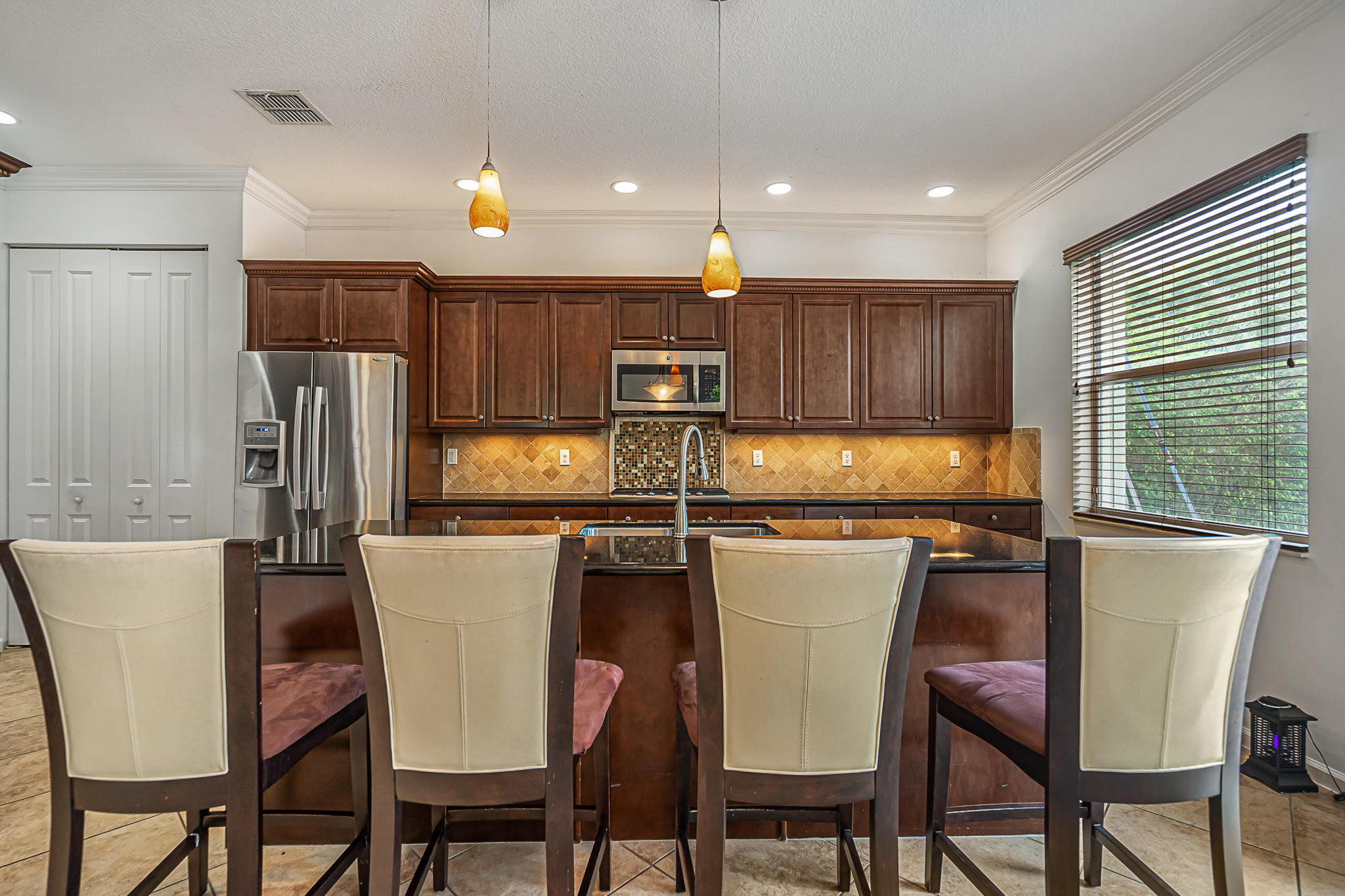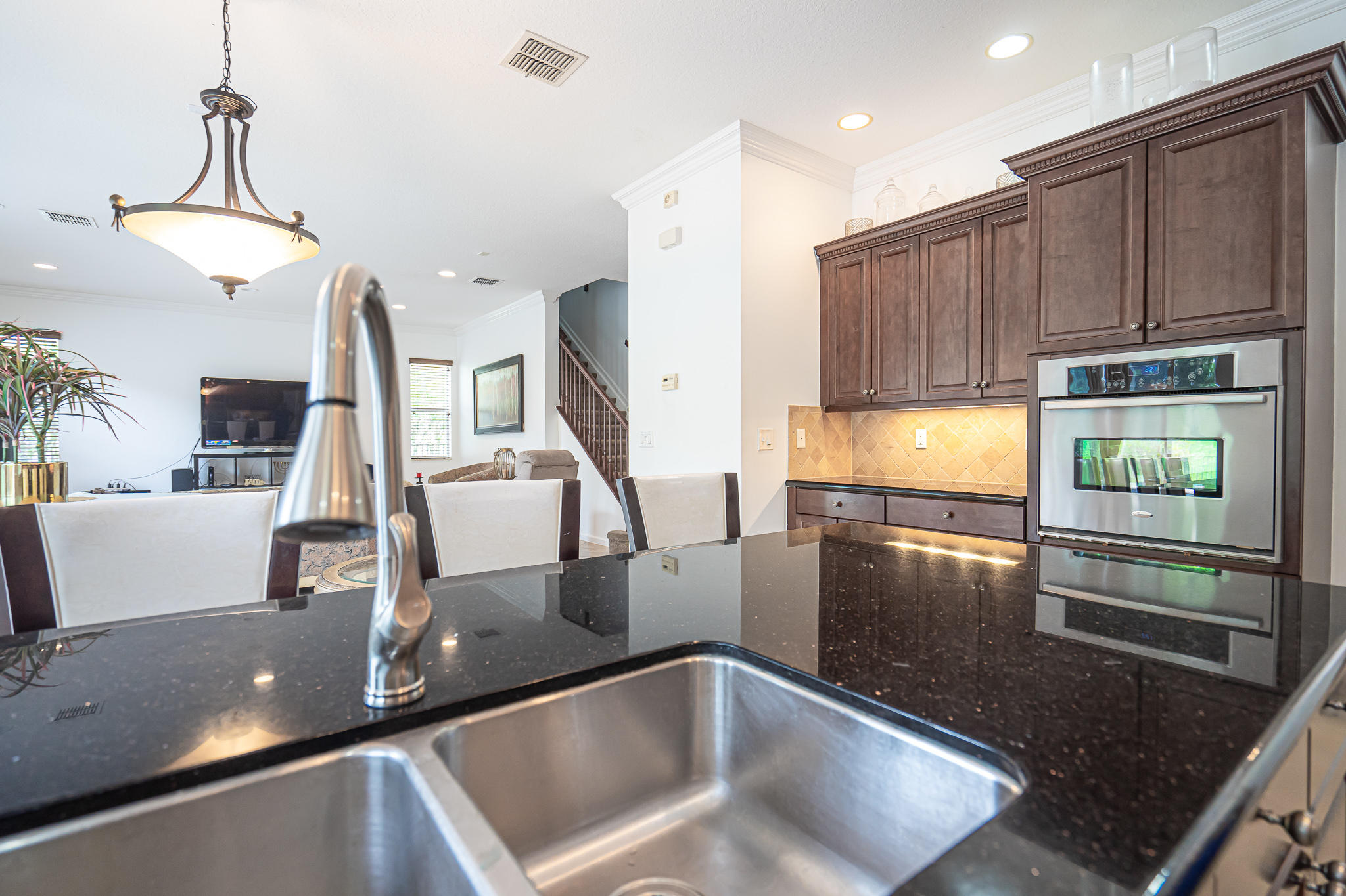 Wonderful 4 bed, 3 ba with loft Waterfront Pool Home in Portosol! Prepare to be dazzled by the spacious layout and stunning pool view as you enter the foyer. The high-end crown molding continues downstairs. The formal dining room is elegant and includes a butler's pantry, making it ideal for entertaining and hosting dinner parties