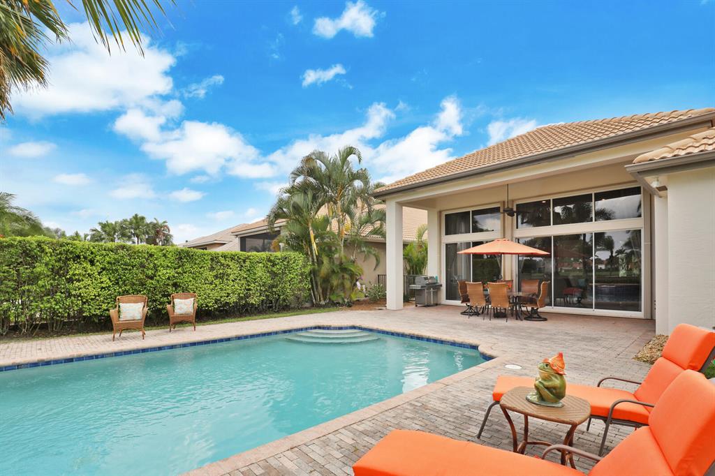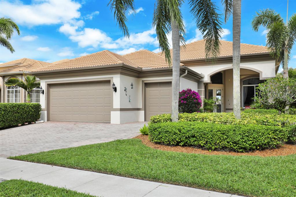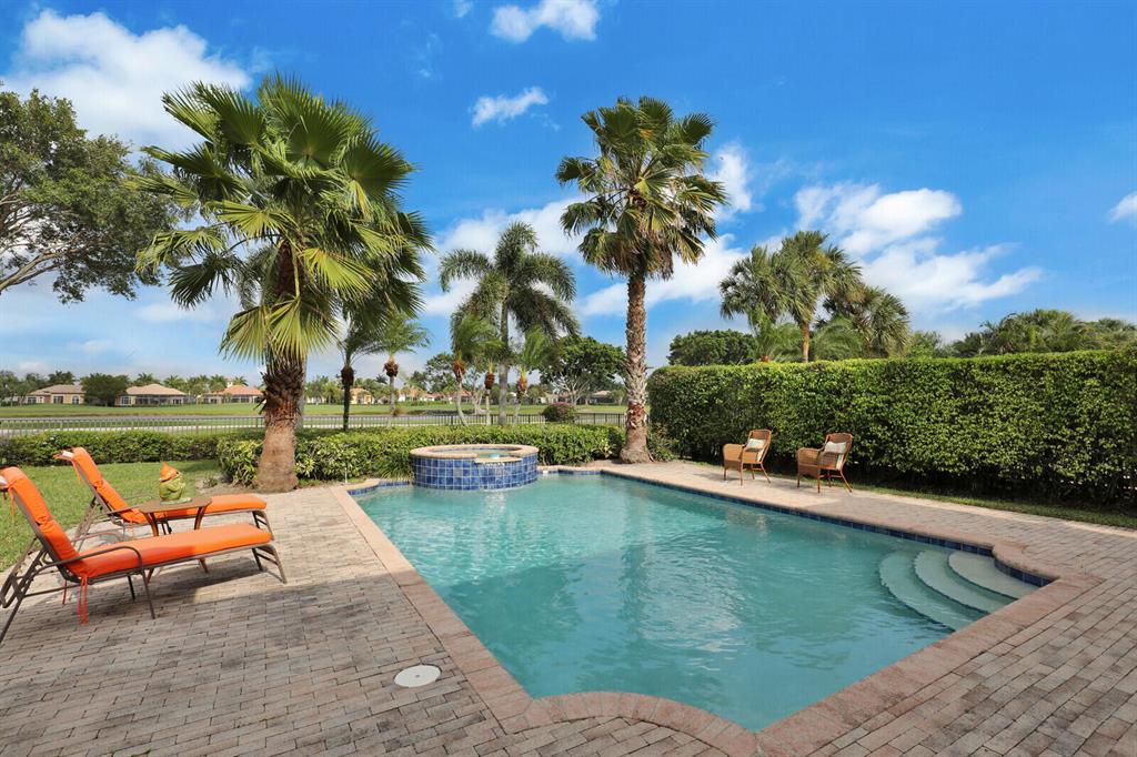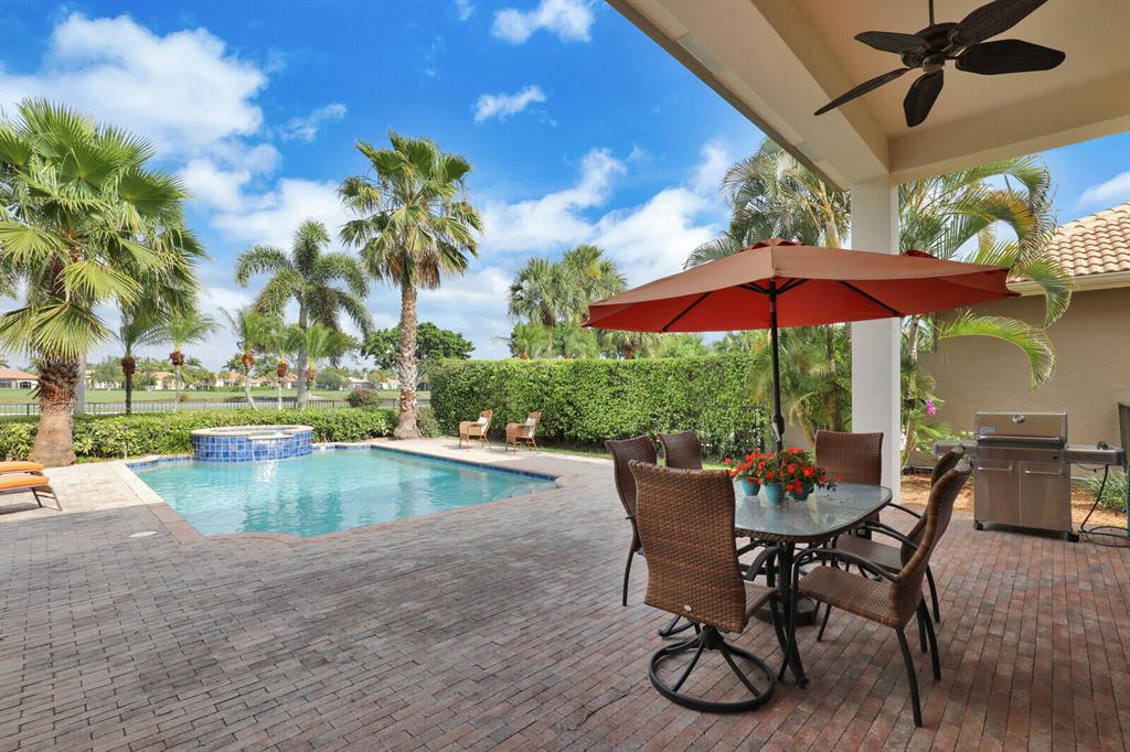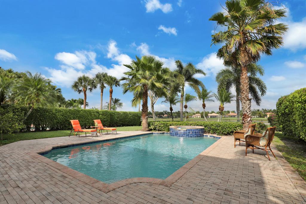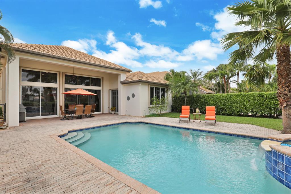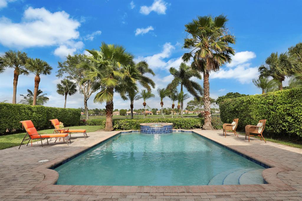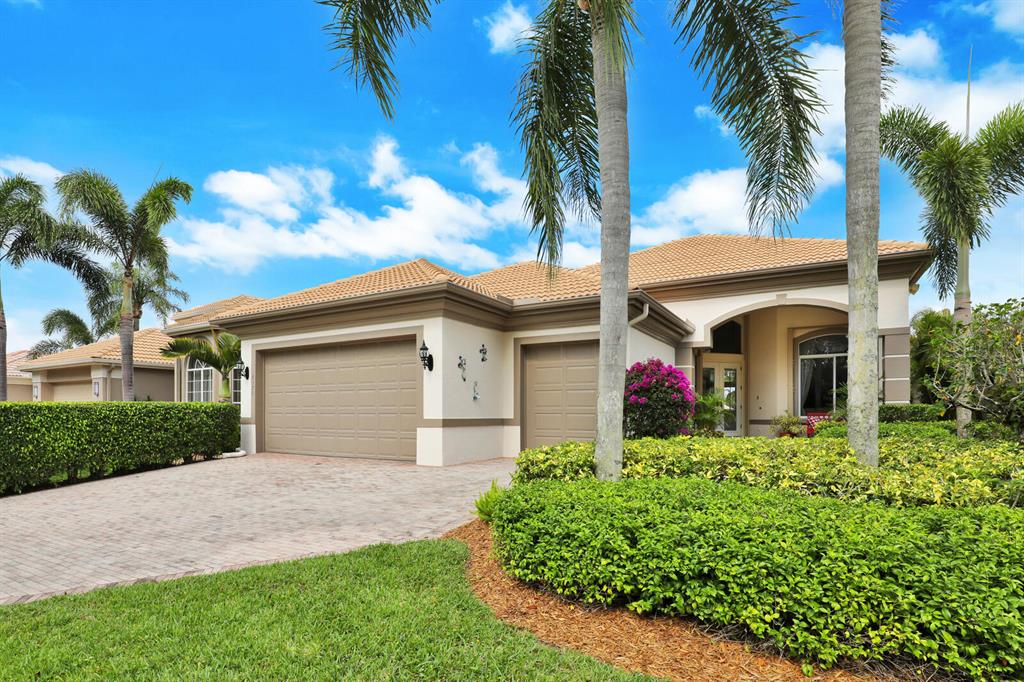 This former builder's model is located on a premium golf and water lot with dramatic views of the Legend #17. The large back yard has a resort-like feel with a large and dramatic pool and spa, and plenty of room for relaxation, with the picturesque water and golf views in the background. There is also a side yard, perfect for the pet owner. This 3BR/3BA+Den, 2.5-car garage features lovely upgrades including: Accordian hurricane shutters, marble floors with elegant inlays in the entry, granite counters tops in the kitchen and marble counter tops in baths, solid 8-foot doors, office built-in, and more. The Cambridge floor plan offers soaring ceilings, and a versatile floor plan with a great room off the open kitchen, formal living and dining spaces and a gracious foyer.
