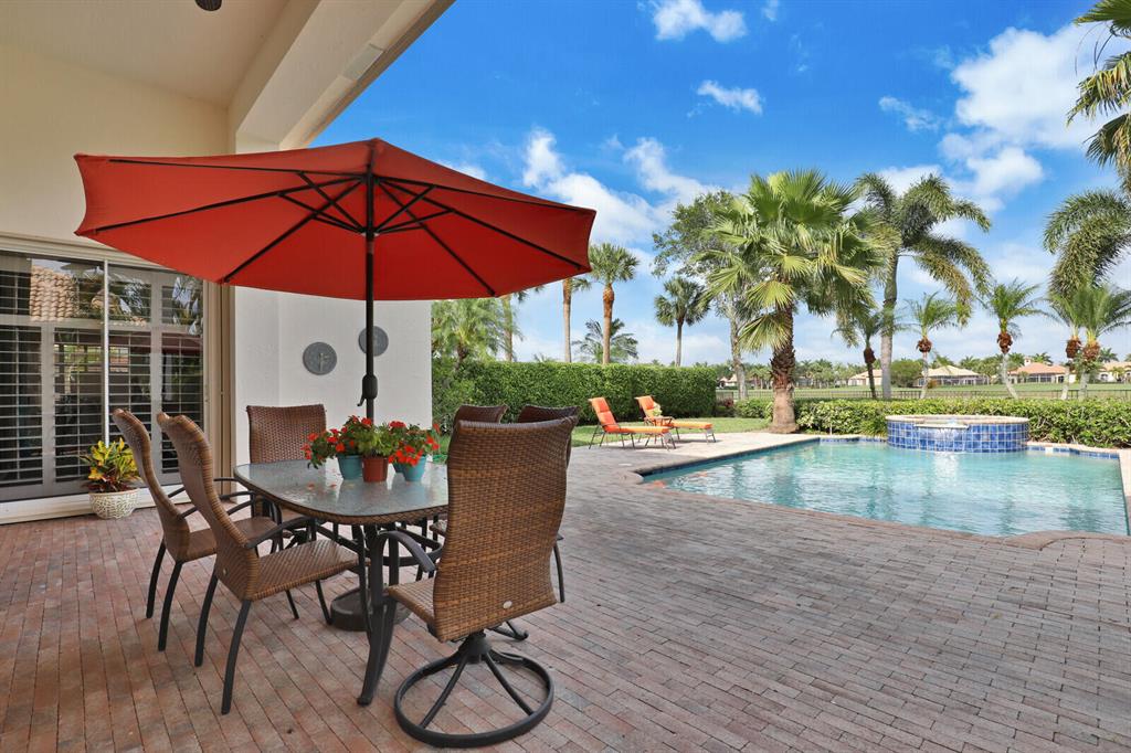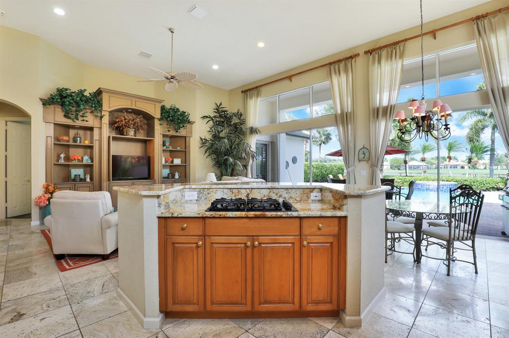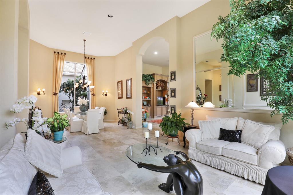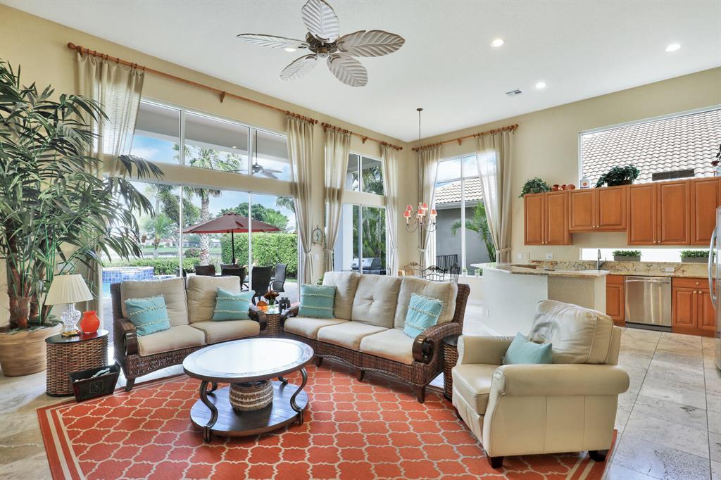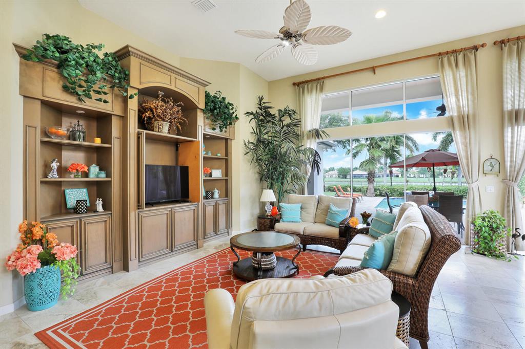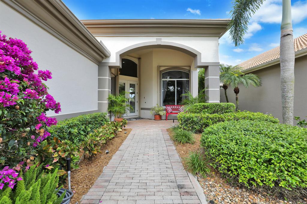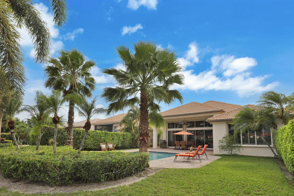 This former builder's model is located on a premium golf and water lot with dramatic views of the Legend #17. The large back yard has a resort-like feel with a large and dramatic pool and spa, and plenty of room for relaxation, with the picturesque water and golf views in the background. There is also a side yard, perfect for the pet owner. This 3BR/3BA+Den, 2.5-car garage features lovely upgrades including: Accordian hurricane shutters, marble floors with elegant inlays in the entry, granite counters tops in the kitchen and marble counter tops in baths, solid 8-foot doors, office built-in, and more. The Cambridge floor plan offers soaring ceilings, and a versatile floor plan with a great room off the open kitchen, formal living and dining spaces and a gracious foyer.
