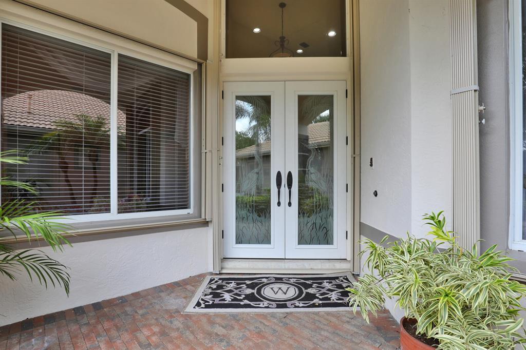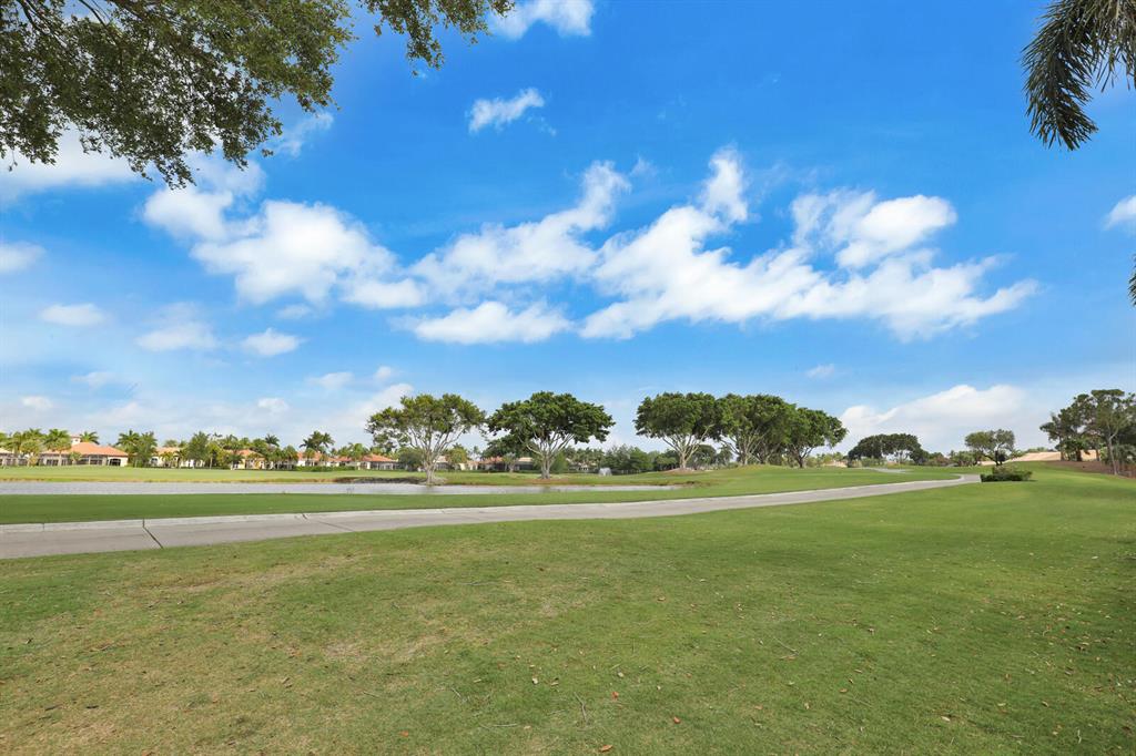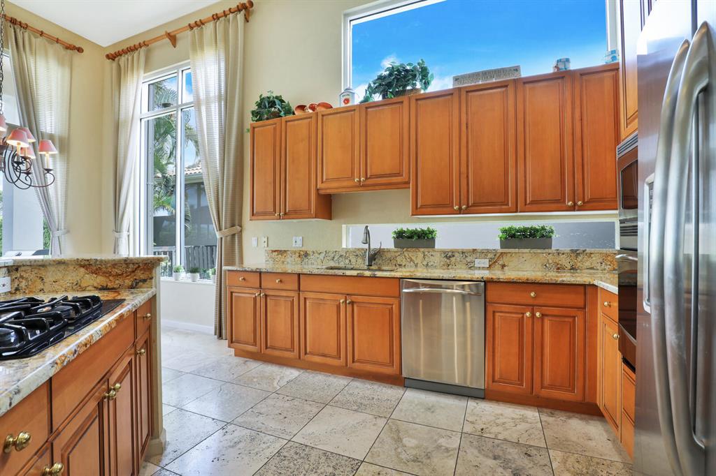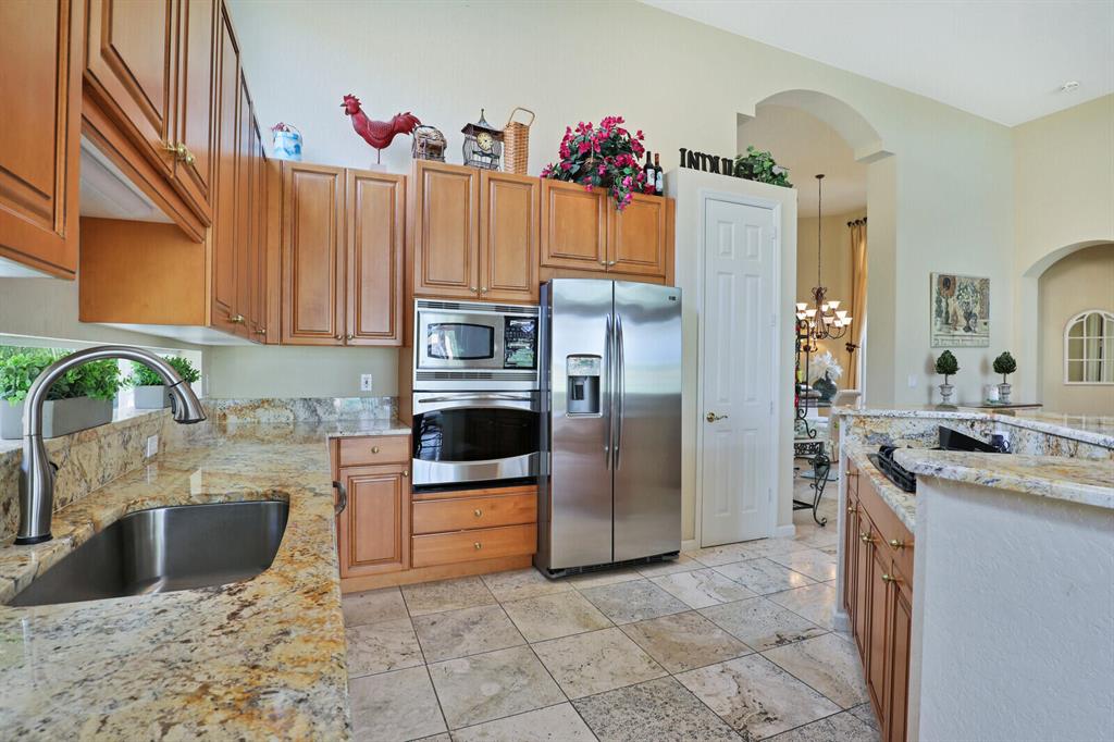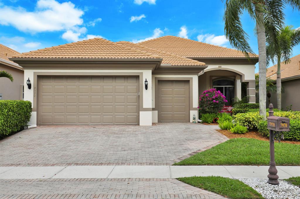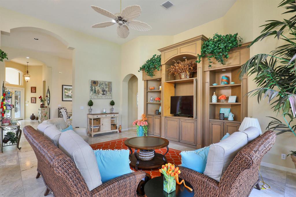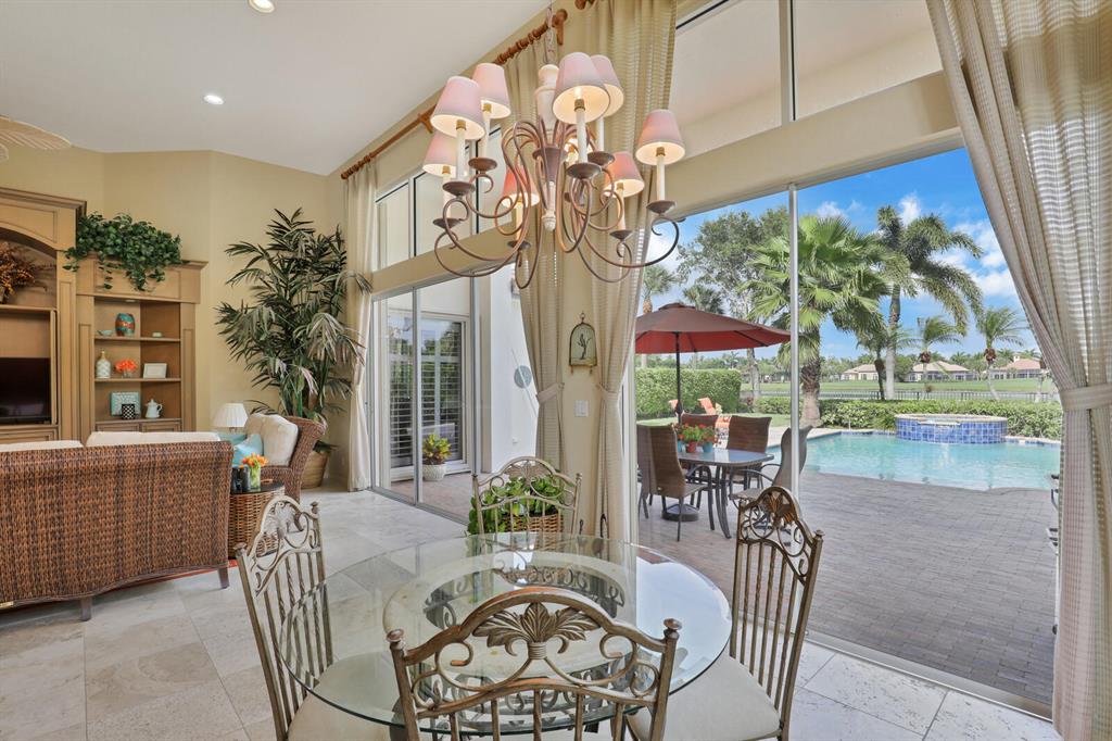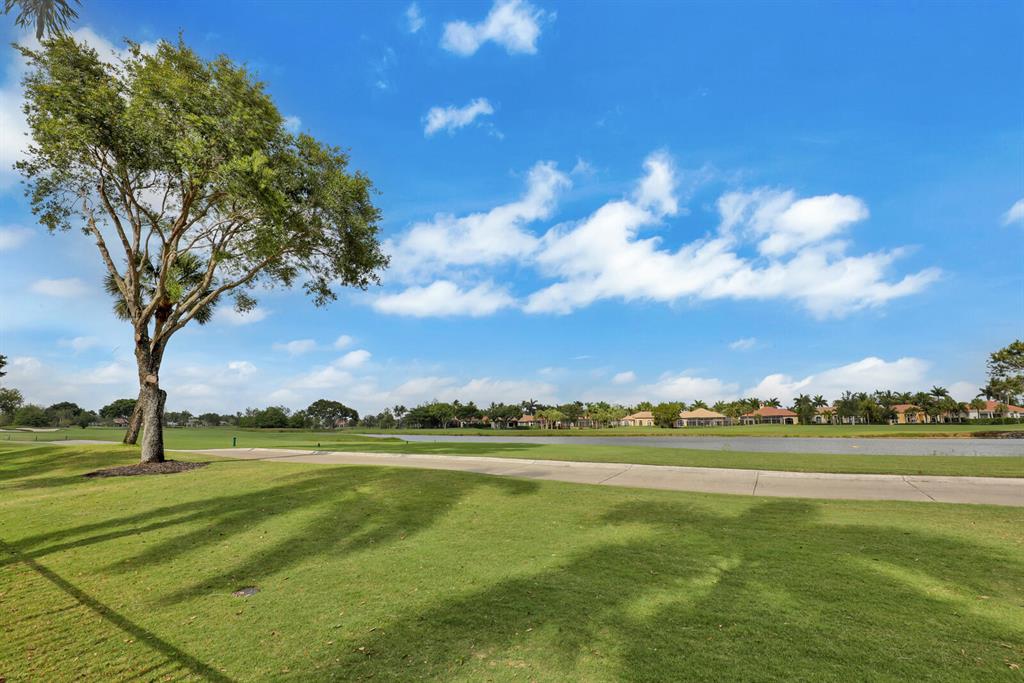 This former builder's model is located on a premium golf and water lot with dramatic views of the Legend #17. The large back yard has a resort-like feel with a large and dramatic pool and spa, and plenty of room for relaxation, with the picturesque water and golf views in the background. There is also a side yard, perfect for the pet owner. This 3BR/3BA+Den, 2.5-car garage features lovely upgrades including: Accordian hurricane shutters, marble floors with elegant inlays in the entry, granite counters tops in the kitchen and marble counter tops in baths, solid 8-foot doors, office built-in, and more. The Cambridge floor plan offers soaring ceilings, and a versatile floor plan with a great room off the open kitchen, formal living and dining spaces and a gracious foyer.