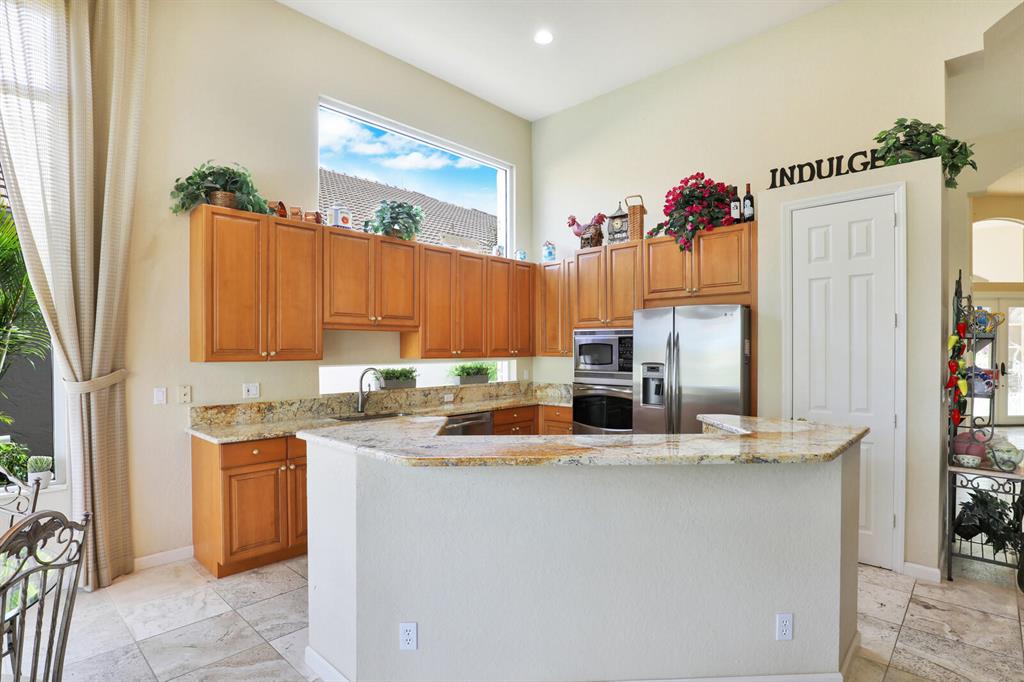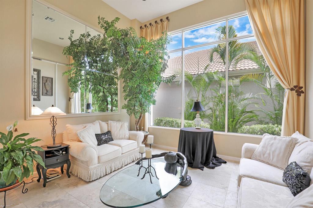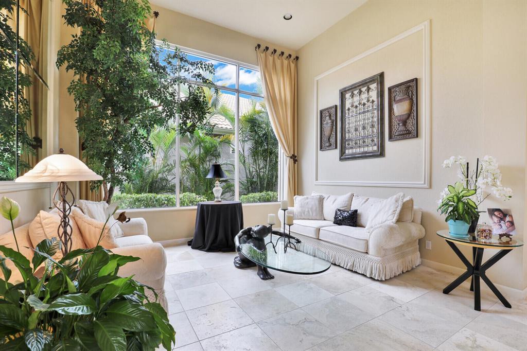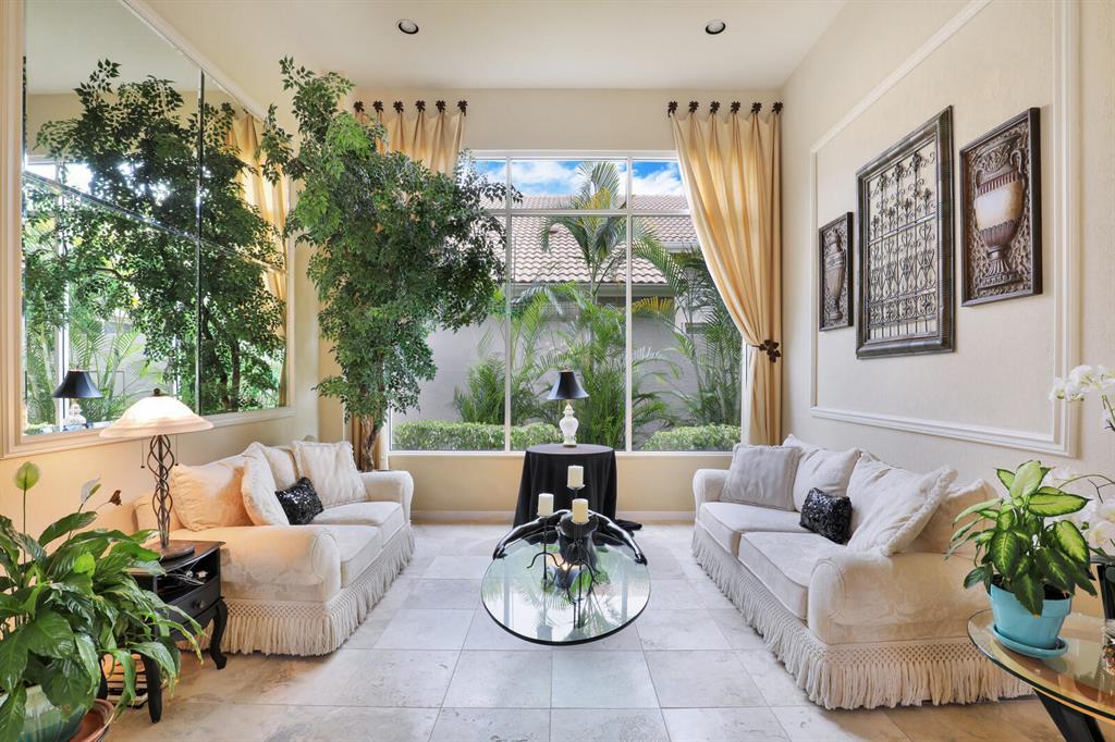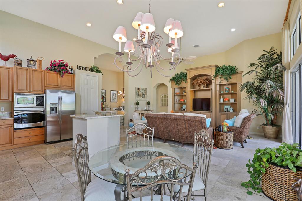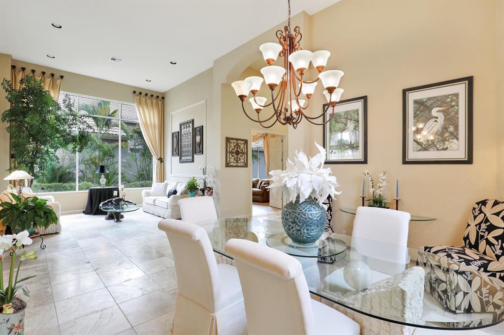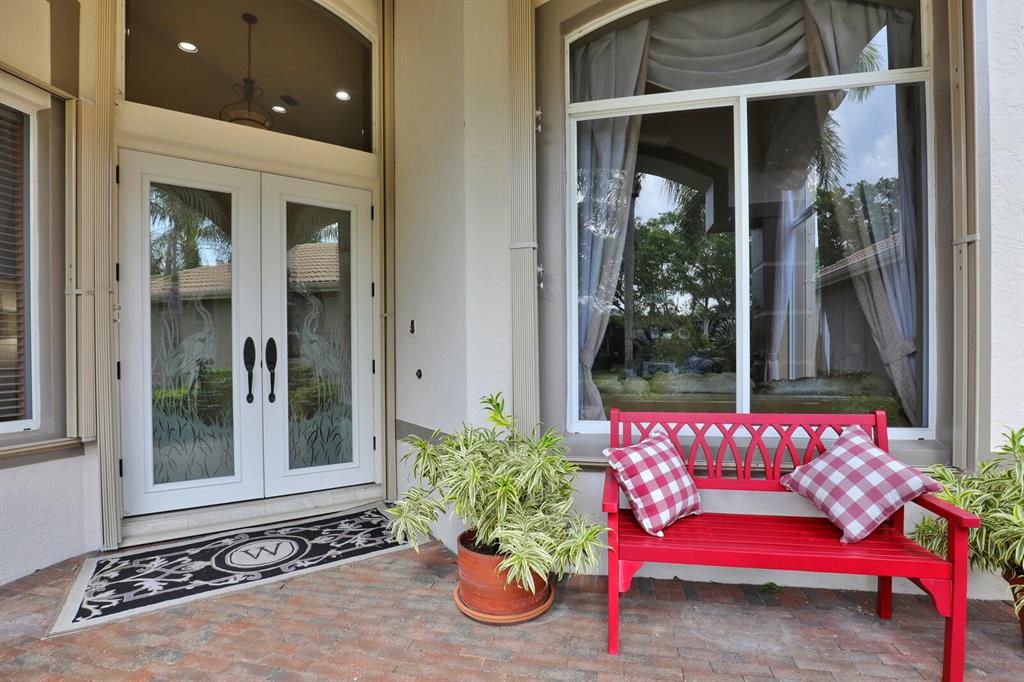 This former builder's model is located on a premium golf and water lot with dramatic views of the Legend #17. The large back yard has a resort-like feel with a large and dramatic pool and spa, and plenty of room for relaxation, with the picturesque water and golf views in the background. There is also a side yard, perfect for the pet owner. This 3BR/3BA+Den, 2.5-car garage features lovely upgrades including: Accordian hurricane shutters, marble floors with elegant inlays in the entry, granite counters tops in the kitchen and marble counter tops in baths, solid 8-foot doors, office built-in, and more. The Cambridge floor plan offers soaring ceilings, and a versatile floor plan with a great room off the open kitchen, formal living and dining spaces and a gracious foyer.