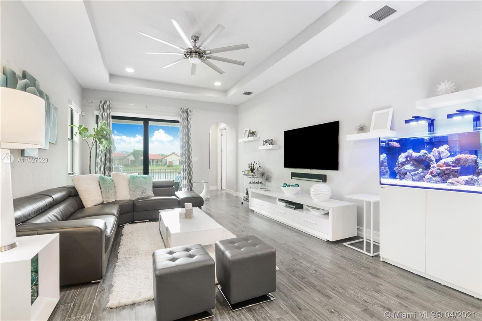Welcome to this immaculate modern home with countless highlights and a backyard with a lakefront view ready to relax and entertain.Bright and elegant customized 4 bedrooms, 2.5 baths plus sitting area & 2-car garage. Spacious living floorplan which features glass entry doors that welcomes you with 20’ cathedral ceilings and custom glass staircase.Gourmet kitchen opens to family room and dining area that is great for entertainment, upgraded with quartz countertops, KitchenAid stainless steel appliances, double oven and wine cooler. Master bedroom conveniently located downstairs with a master spa bath, modern tub and oversized shower with rain shower head. Step outside and enjoy the luxurious heated salt water pool, spill-over spa and fire sizzled waterfall a serene space to unwind and relax