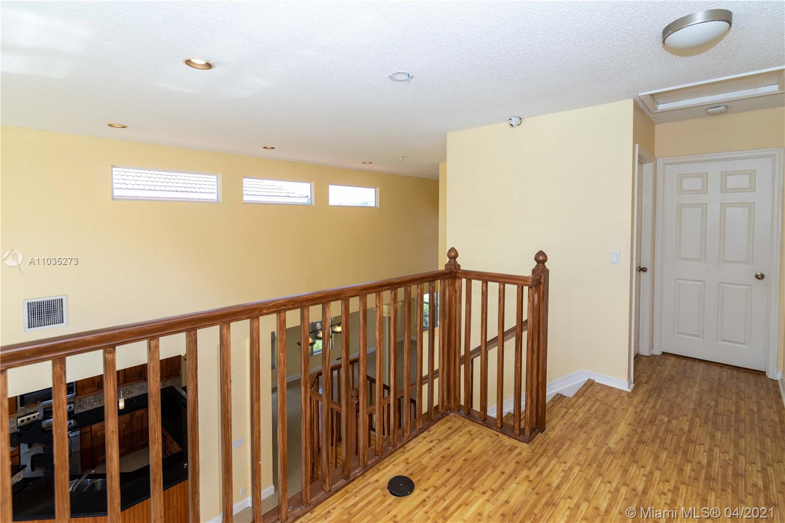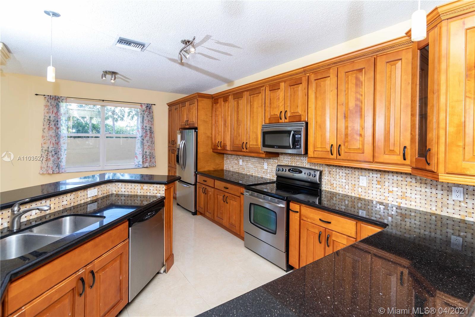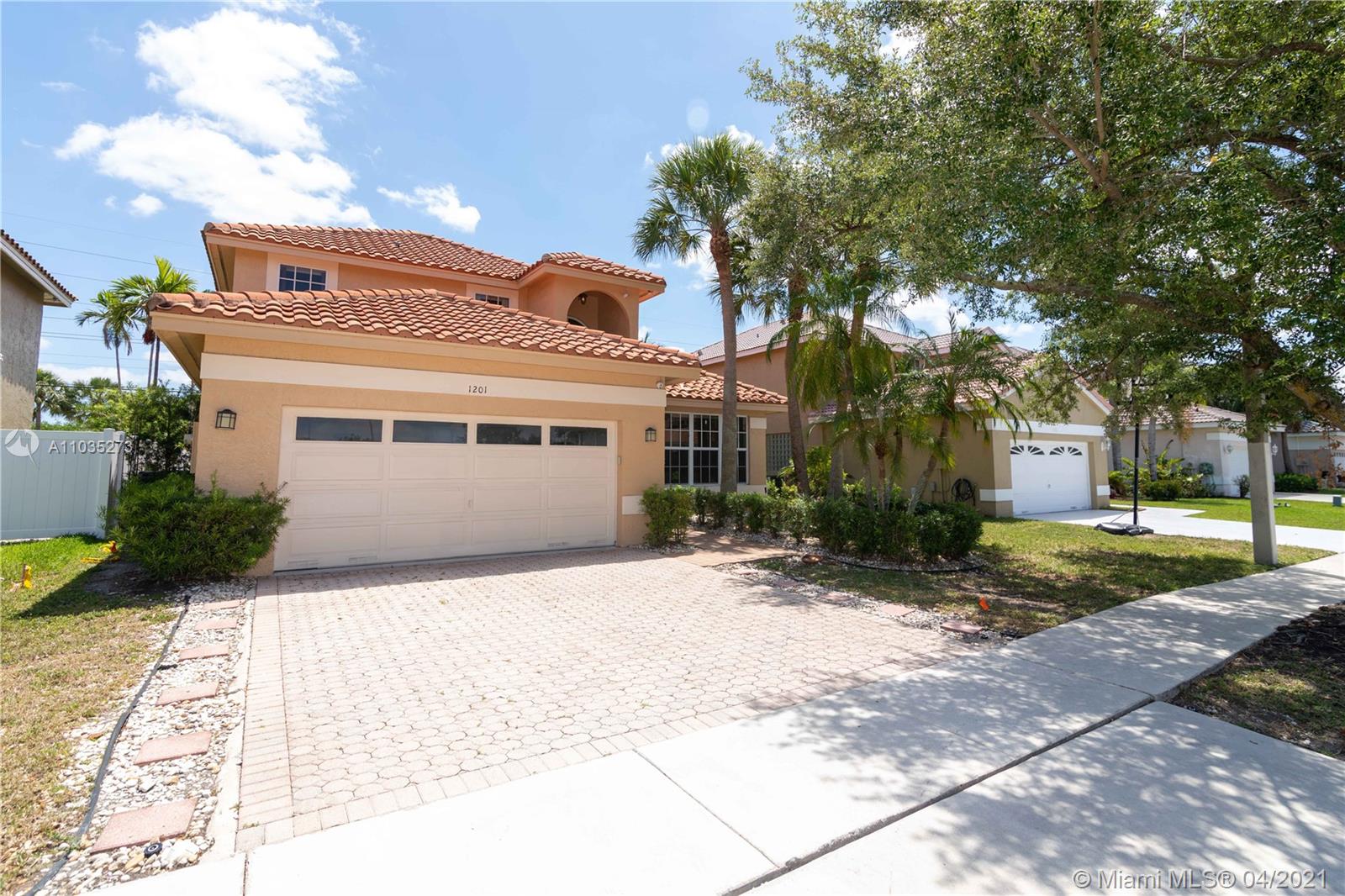 PEACEFUL AND HAPPY NEIGHBORHOOD WITH A-RATED SCHOOL ACROSS THE BOARD AT YOUR FINGERTIPS! You will be greeted by a 2014 ROOF, COMPLETE impact windows, and a BRAND NEW beautiful IMPACT front door! // Walk in to observe high ceilings and a large open space. // Ceramic marble-like tiles throughout family living space with mosaic details at entrance. Bamboo wood floors upstairs and laminate wood floor in master. // Kitchen has sleek black GRANITE countertops with tiled backsplash and wood cabinets. // Half bath is remodeled and upstairs bathroom has a BRAND NEW double-sink vanity installed April 2021. // 2017 A/C system with Nest Thermostat and SHINY NEW DUCTS installed Nov 2020. // SECURITY CAMERAS included with complete DVR system. // Backyard is a blank canvas ready for your outdoor oasis!