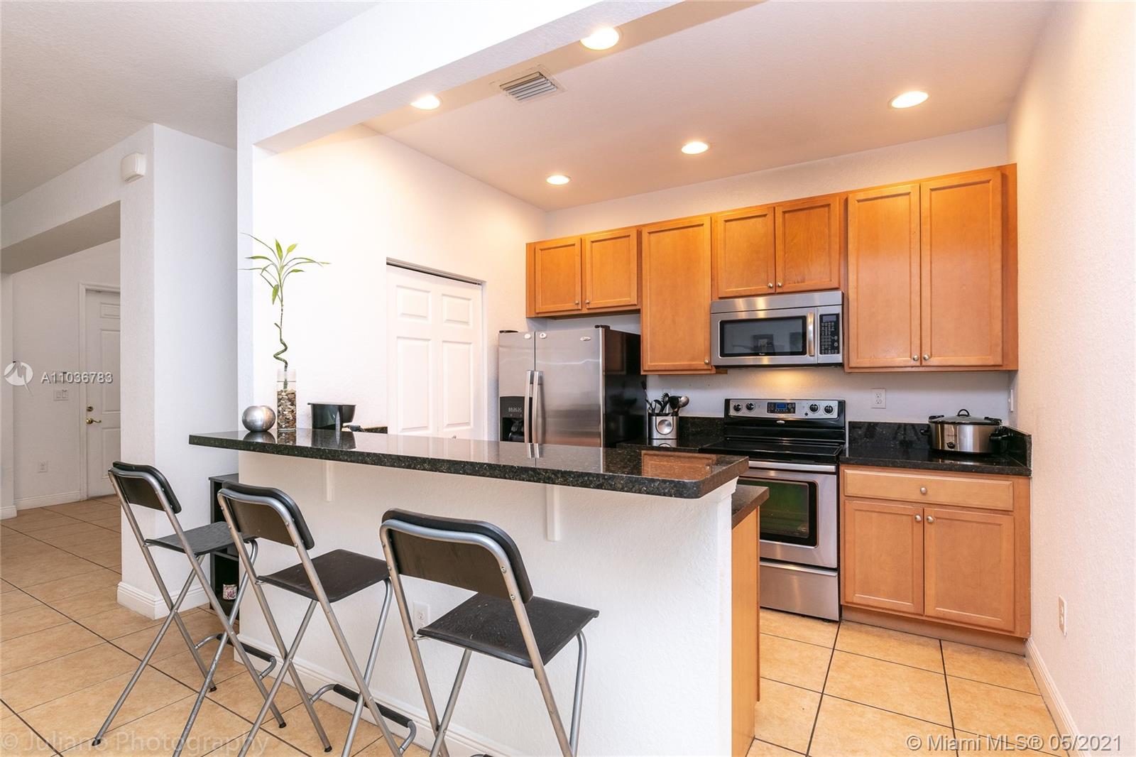 Gorgeous townhouse 3 bed 3 baths plus loft converted in additional bedroom, in Cobblestone. High ceilings. Granite countertop in kitchen & baths, SS appliances, hurricane impact windows, tile flooring on 1st floor & wood laminate on staircase & upstairs. Master bed w/ large walking closet, master bath w/double sink vanities, shower & enclosed toilet room. Loft closed & converted in full bed w/large balcony w/view of the preserve. No properties in front. One bed & a full bath are located on the first floor. Patio w/rear entry. 2 car garage. Gated community w/security 24 hrs. Amenities: pool, gym, playground & clubhouse. Great location A+ Schools, next to I-75, Whole Foods, Pembroke Gardens & Pembroke Lakes Mall & Restaurants. Association payment includes cable, internet & security system