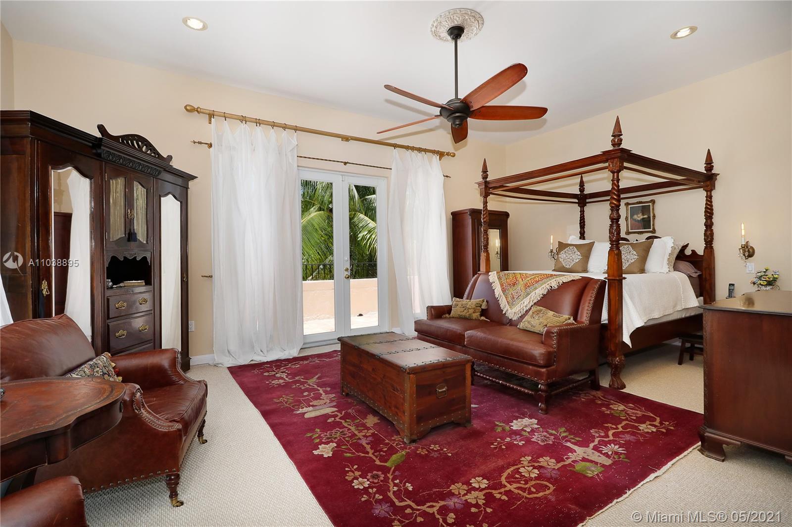Tucked away on an ultra-lush 25,700 SF lot in guard-gated Hammock Lakes, this Art Deco-style 5 BR, 3.5 BA home is a wonderful opportunity! Designed for entertaining inside & out, it includes a foyer entry that leads to large formal liv & din rooms, the kitchen has gorgeous garden views, center island w/ gas range, & breakfast area, & is open to the spacious, sunlit fam rm. The formal & informal living spaces incl banks of French drs opening to covered patios, pool w/ fountains, & patio. 2nd floor primary suite is an oasis w/ sitting rm, large walk-in closets, marble BA w/ separate tub & shower, & private balcony. 2 more BRs upstairs & 2 down make this a true split plan. Sunset Elementary district, 2-car garage, laundry rm, roving security, circular drive, impact glass, & more!