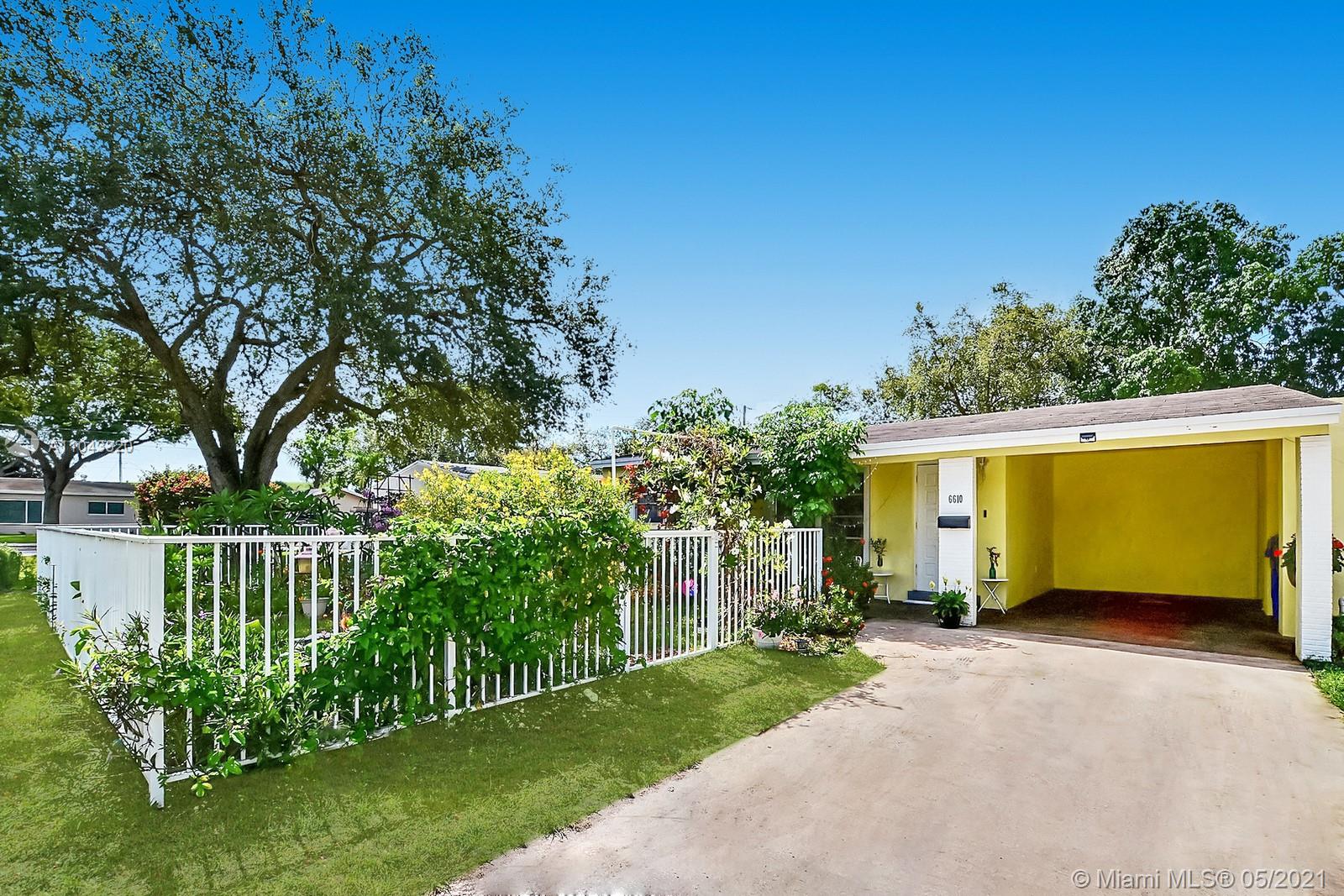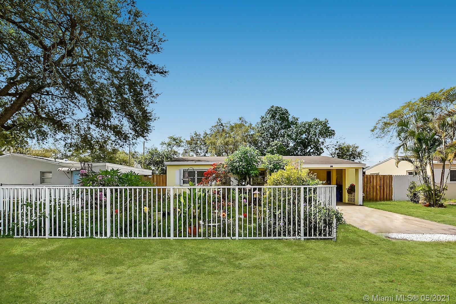 ABSOLUTELY CHARMING 3 BEDROOM 2 BATHROOM HOME EXUDES CURB APPEAL. A WELCOMING FRONT ENTRY IS LINED BY A SPECTACULAR FENCED GARDEN OF COLORFUL FLOWERS AND MATURE TREES. LIGHT AND BRIGHT INTERIOR OFFERS TILE THROUGHOUT AND NEUTRAL DECOR. KITCHEN FEATURES STYLISH WHITE CABINETS, GRANITE COUNTERS, AND STAINLESS STEEL APPLIANCES.THE LARGE FULLY FENCED YARD IS PERFECT FOR ENTERTAINING AND ALLOWS ROOM FOR A POOL. FOR CONVENIENCE THE HOME ALSO FEATURES A CARPORT FOR PARKING AND A DEDICATED LAUNDRY ROOM. THE SPACIOUS PRIMARY SUITE HAS AN ENSUITE BATH AND A PRIVATE ENTRY. FANTASTIC CENTRAL LOCATION IS MINUTES FROM THE TURNPIKE, SHOPS, RESTAURANTS AND THE HARD ROCK HOTEL.