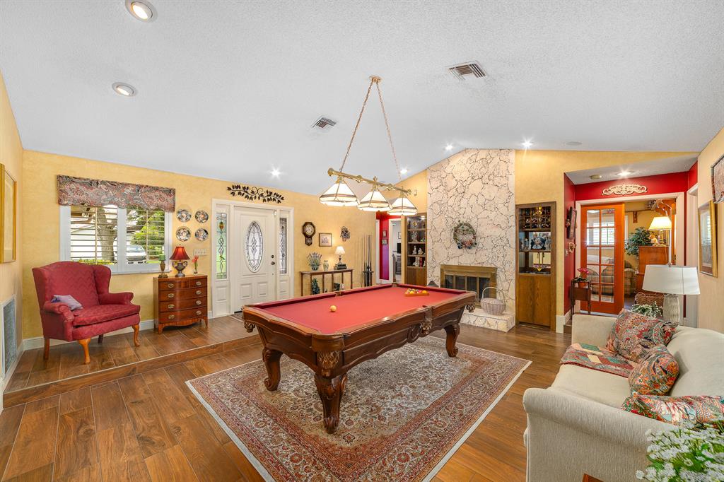 FIRST SHOWINGS TO BEGIN AT OPEN HOUSE 5/22 FROM 1PM-4PM. Welcome home! This Coral Springs property has it all. Huge corner lot with beautiful landscaping and oak tree lined streets. As you enter, your view flows through the formal living room with functional fireplace out to the massive patio, pool with screened enclosure and expansive backyard. The wood themed tile flooring covers the majority of the home. The kitchen has been updated featuring stainless steel appliances and opens to the large family room for ease of entertaining. Plantation shutters cover most of the windows. The home has a stacked bedroom floor plan with large rooms. The primary suite has vaulted ceilings and a terrific pool view. The one owner home exemplifies pride of ownership throughout.