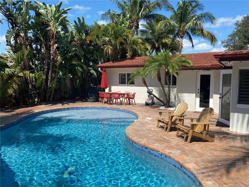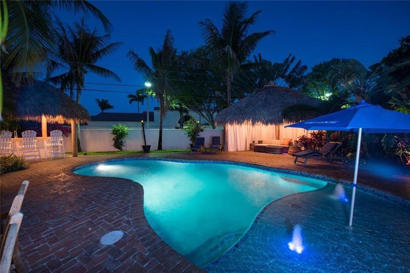 3 Bedroom 2 Bath pool in east Boca, 1 mile to the beach. Backyard is a tropical Paradise with 2 custom tiki huts, saltwater heated pool with a sun shelf. Inside you will find a nice open split layout with a large custom kitchen with granite, wine fridge, wood, and Limestone Marble floors throughout, tankless hot water system, large size laundry/utility room, plantation shutters, outdoor bar/kitchen counter with kegerator. Impact windows and doors. Brand new washer and dryer, refrigerator and pool heater. The driveway has plenty of parking. The home is located close to Mizner Park and a short ride to Delray Beach. Come see this one today before is gone.