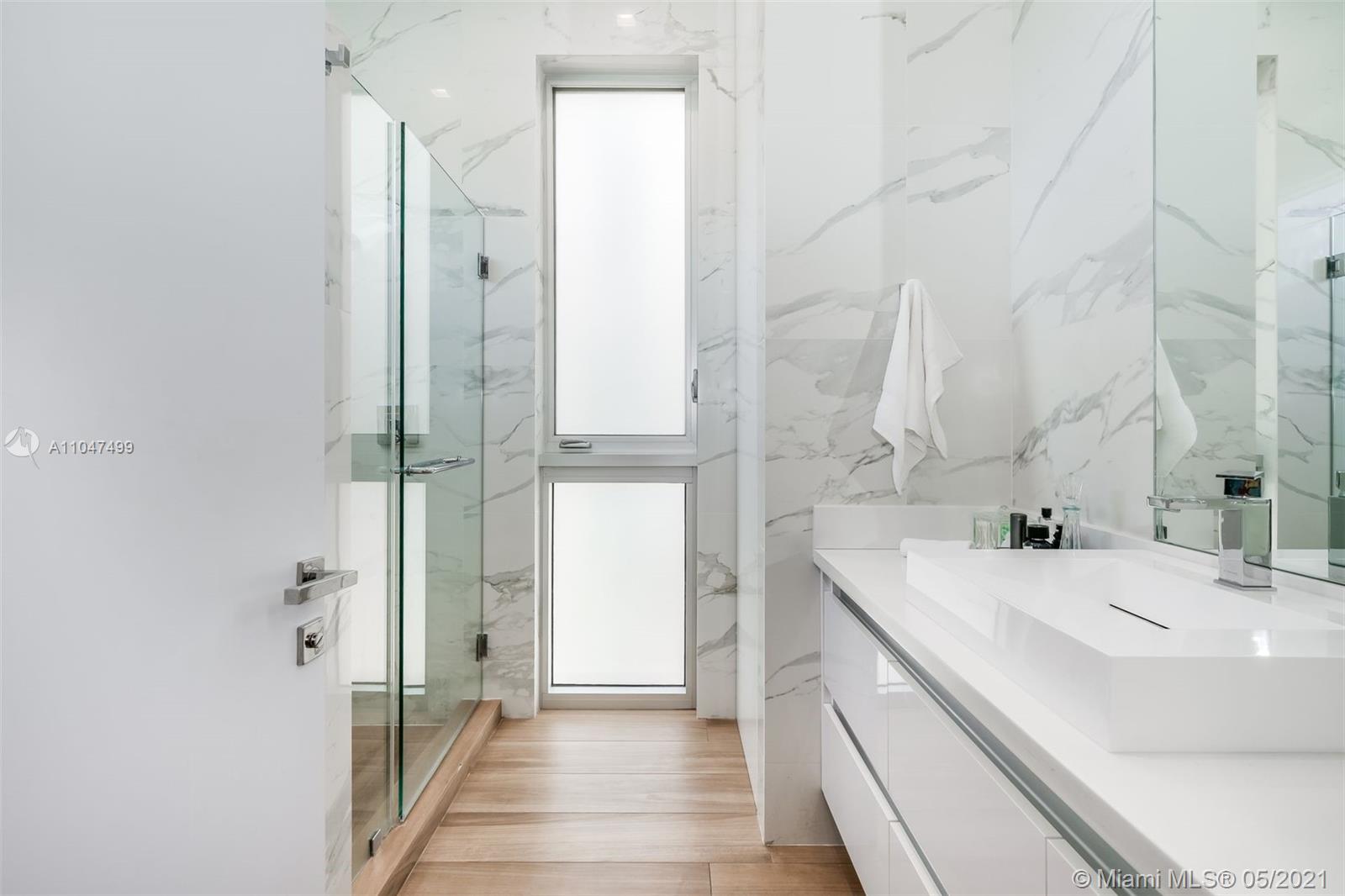 The architecture and execution of this contemporary waterfront masterpiece are truly unmatched. Located on secluded Atlantic Isle across from a deeded private beach lot, this modern custom-built residence boasts 10', 12' & 14' high ceilings and an abundance of windows offering natural light throughout. The currently features 4 bedrooms, large upstairs den, 5 1/2 baths, library den, a laundry room (can be second kitchen), and a garage with adjacent full bath currently used as a gym. Bold red exterior staircase leads to a rooftop terrace that could be build out as a 3rd level. Dock can accommodate 60' vessel, custom-designed infinity pool by VanKirk, surrounding home IP cameras, professional basketball hoop, custom-designed electric security gate, front area can accommodate up to 6 cars.