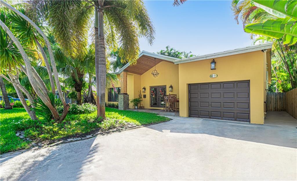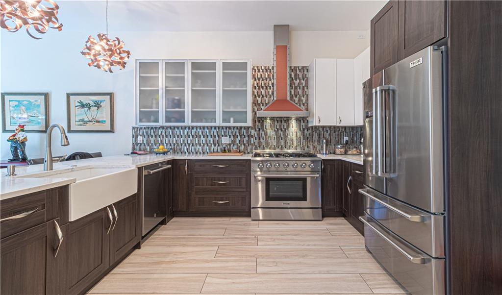 Newly Built 2 bedroom 2 bath pool home w/ garage on a tropically landscaped private lot. A lofty covered front entrance w/ glass double doors welcomes you into this finely appointed home designed by an interior decorator. The expansive living areas offer heightened ceilings, natural light & plenty of room for entertaining. A chef’s delight, modern kitchen equipped w/ Thor appliances including a 6 burning gas range, deep farm house sink, mix of dark & light cabinetry tied together w/ mosaic tiled back splash & solid stone countertops w/ waterfall edge. Impact windows & sliding glass surround the living area, leading out to the private tropical back yard, heated pool, bbq area & covered gazebo! Modern bathrooms featuring rainfall glass enclosed showers, custom closets & beautiful fixtures.