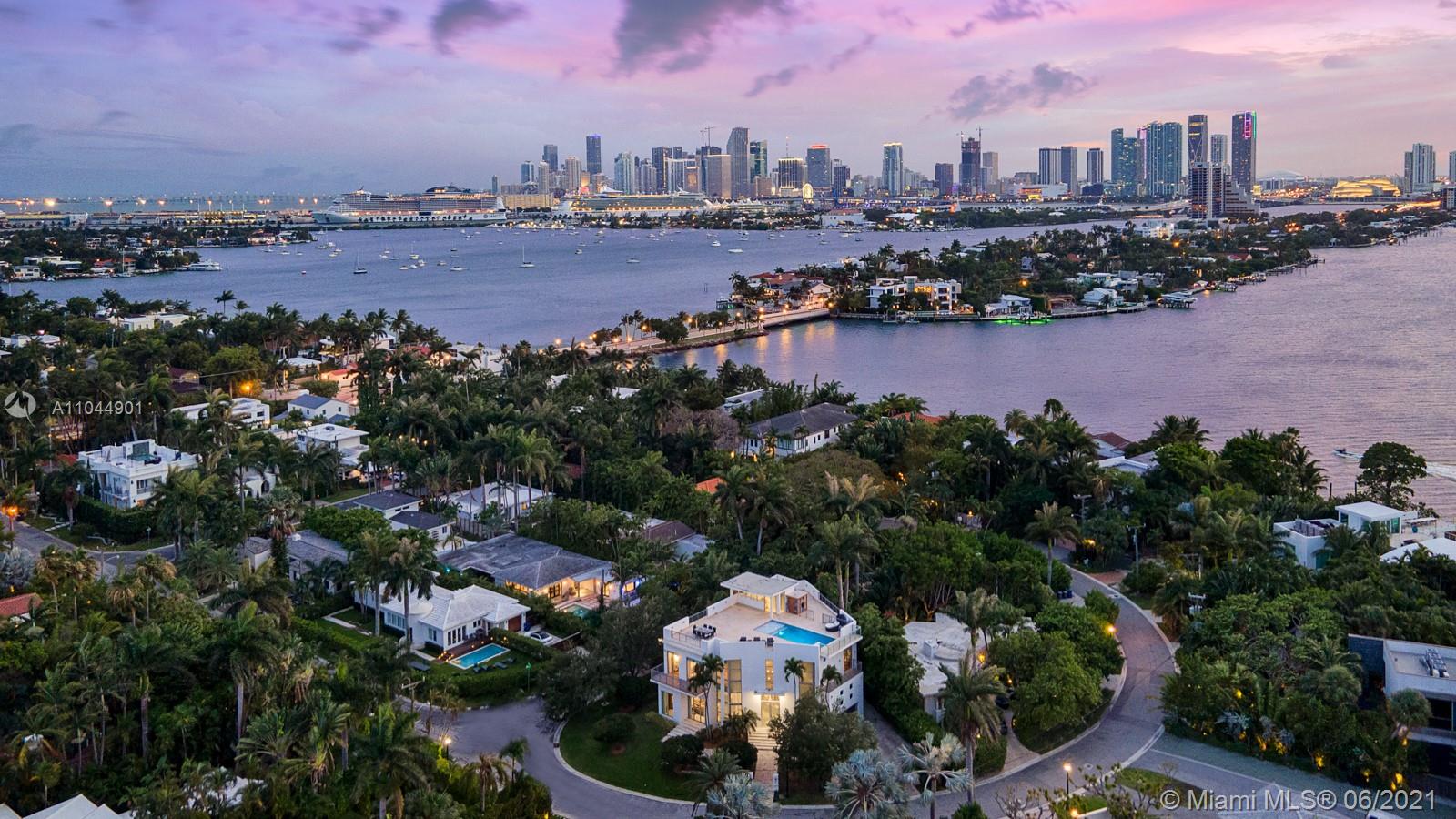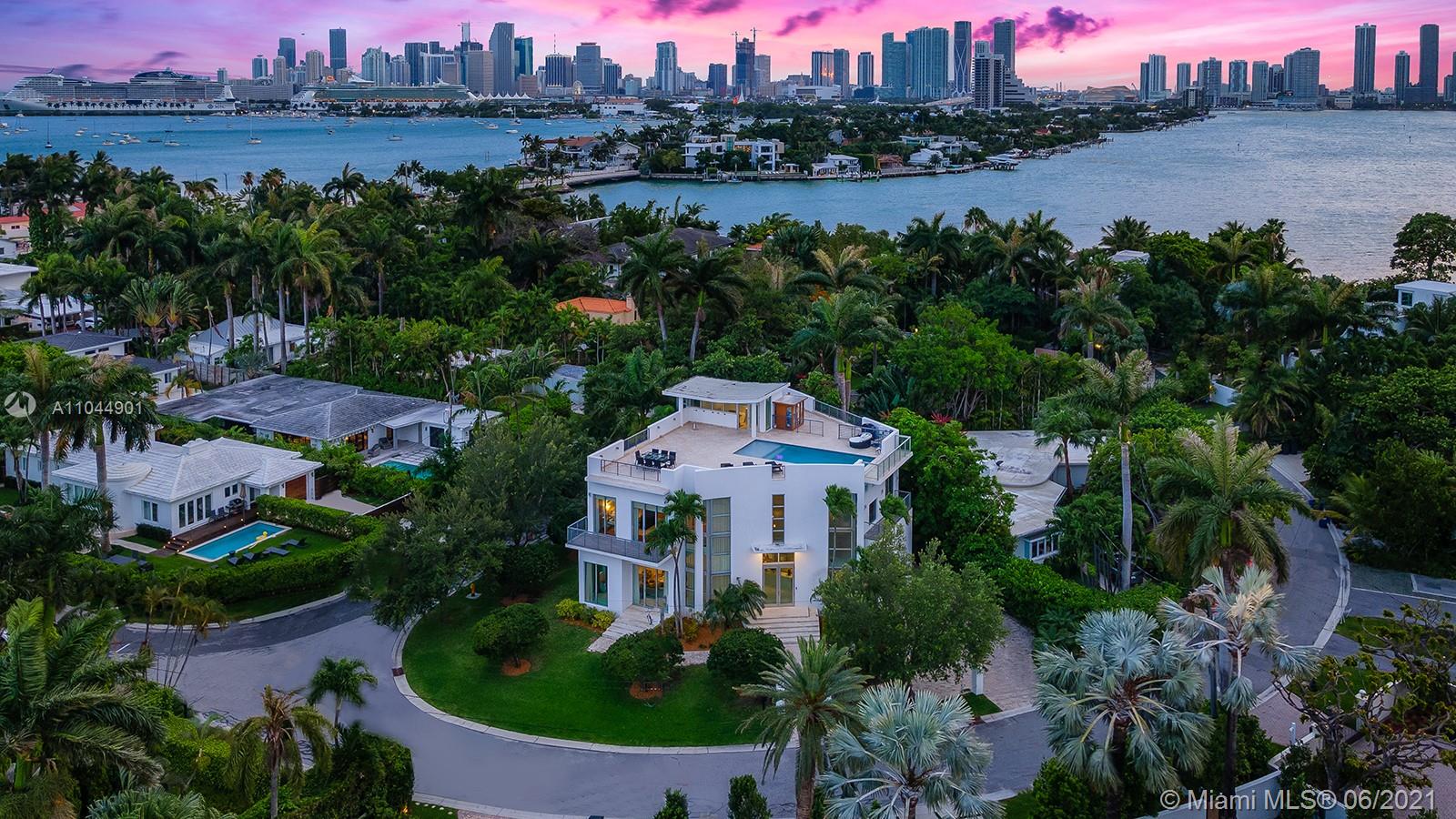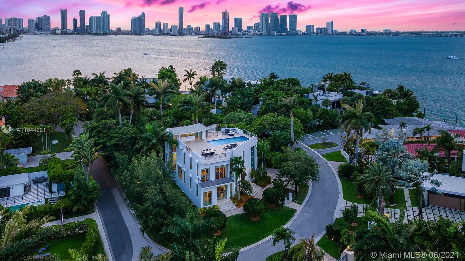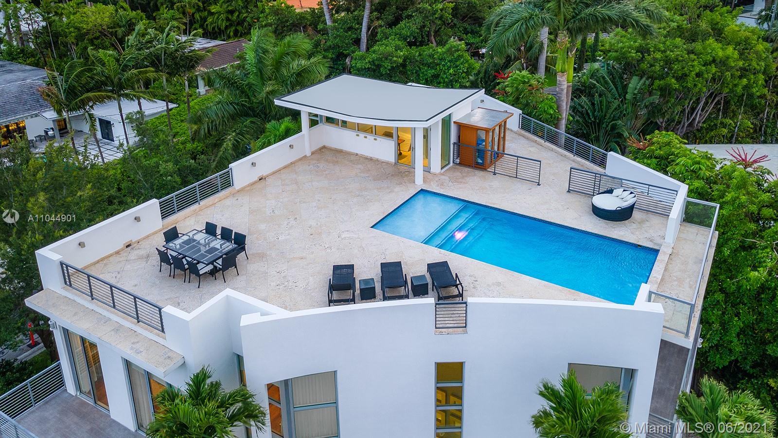 One of a kind contemporary new luxurious home w/ gorgeous 1,900 sq ft rooftop pool terrace. Sitting on a 7,500 sq ft corner lot, boasting a 15 x 30 negative edge swimming pool w/ breathtaking 360-degree panoramic views of Biscayne Bay (incl. gas, water, elec. outlets for bar/bbq/jacuzzi). Welcoming you with a 10’+ ceiling height w/ double-height entryway, elevator to all 3 floors, smart touch (color panel) lighting system, tankless gas w/h, high-end plumbing and elec. equip. Deluxe master bath: spa, sauna, bidet, all bedrooms with en-suite baths, equipped w/ Kohler infinity soaker tub, etc. Spacious playroom room under the pool is fun for kids.