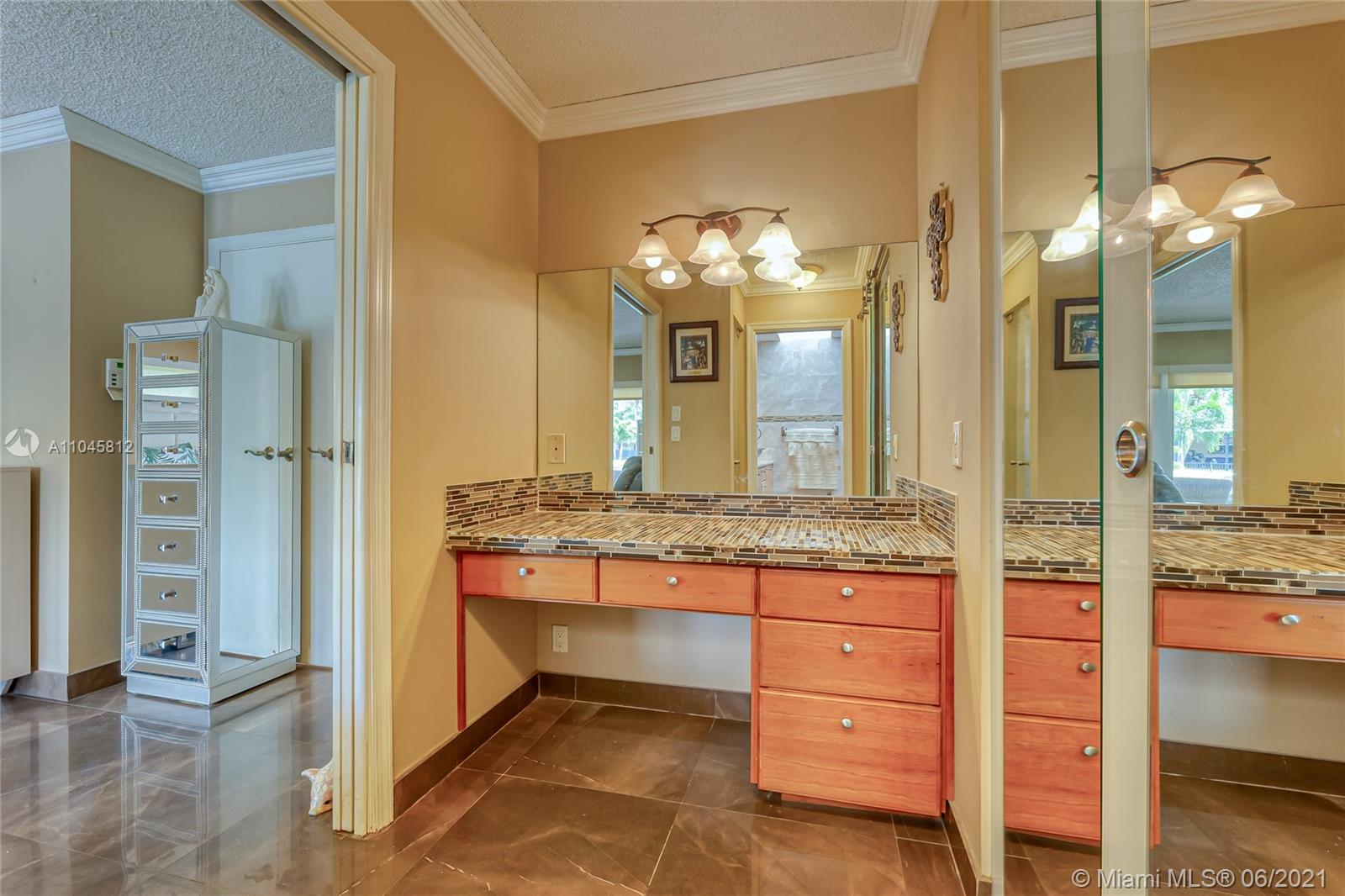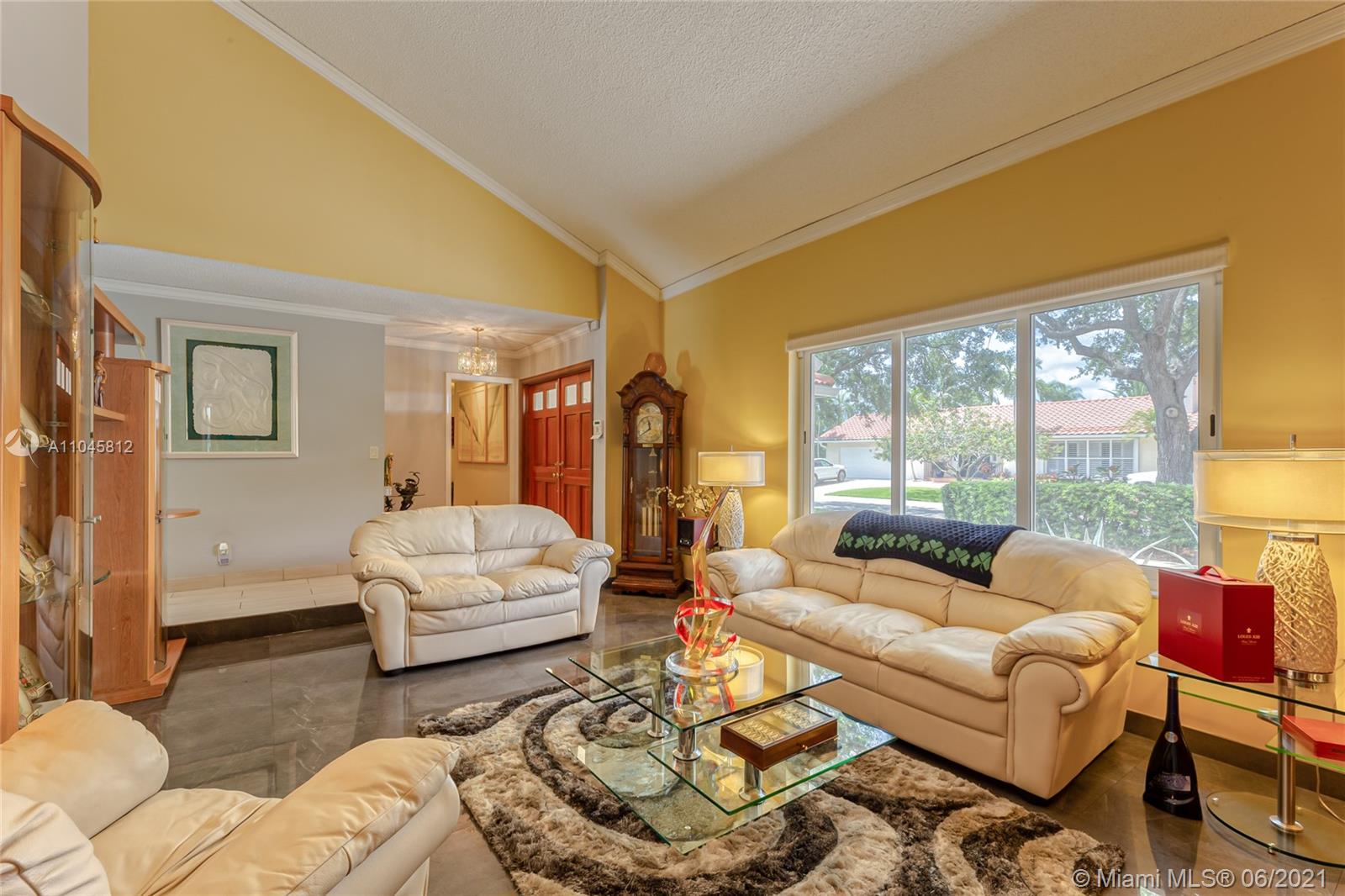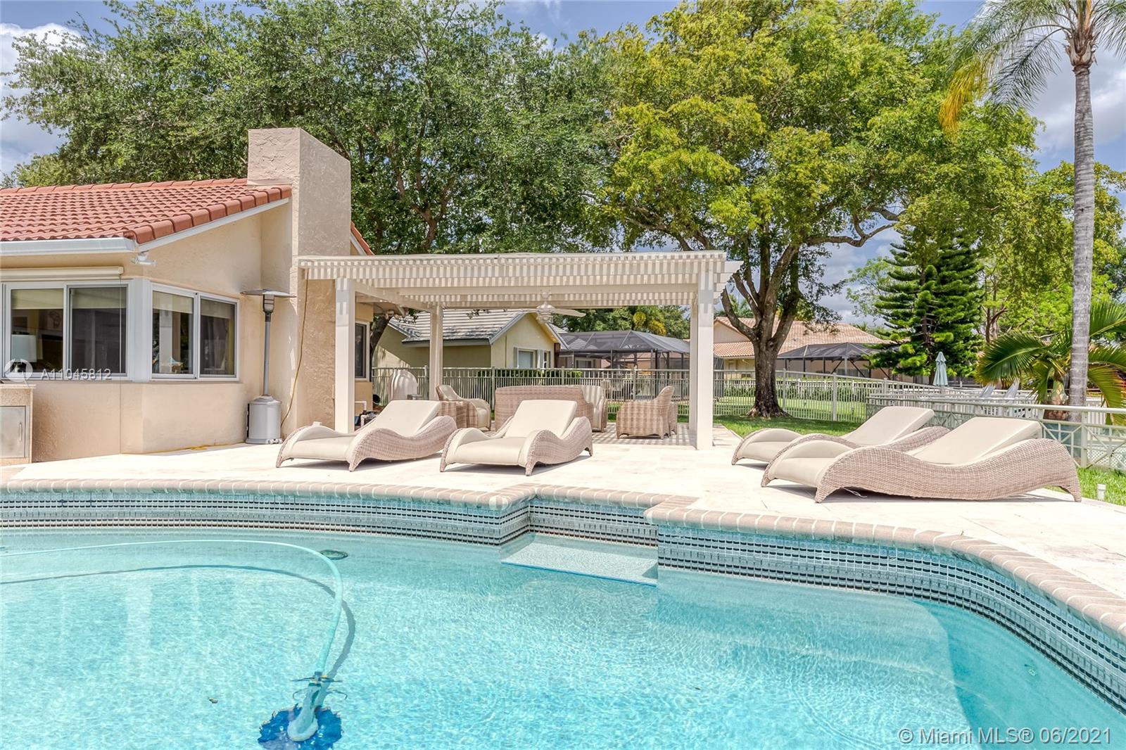 One of a kind in Lago Mar, Best Lot On Lake: 180* Lake View From Open Family Room With Impact windows, doors, and stone fireplace. Custom updated kitchen with Stainless Steel appliances including double oven, induction stove, and wine cooler. Spacious kitchen island for entertaining. Renovated baths. Incredibly organized garage with rectified porcelain garage floors and custom storage ($46,000). Full home generator. Tumbled marble travertine driveway and patio deck. Retractable shades. Full home security with cameras. Custom-designed fence with plexiglass, Two Air conditioning units. Glass closet doors. Private dock and gazebo for backyard fun. 24/7 Gated community. Low HOA. Minutes to I-595, I-75, Turnpike, and I-75, and FLL airport.