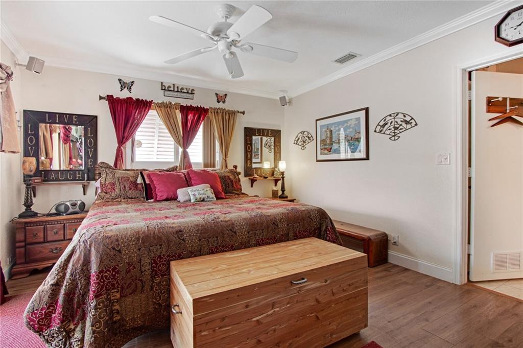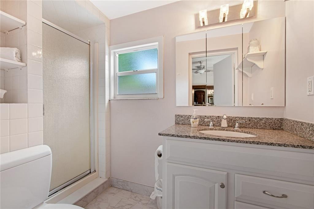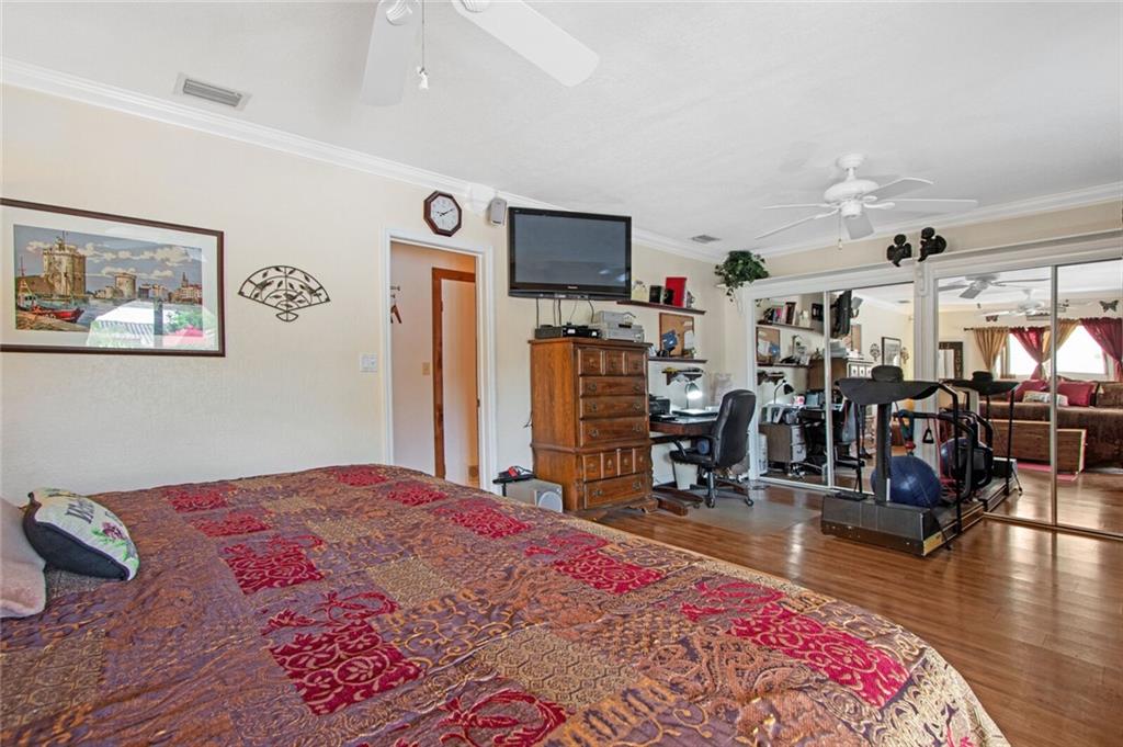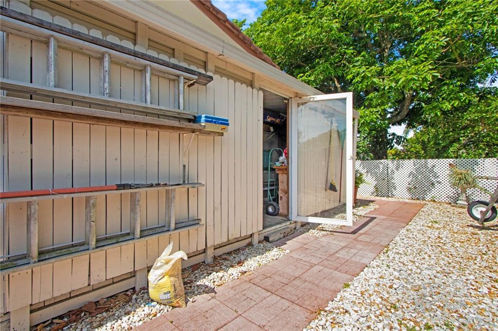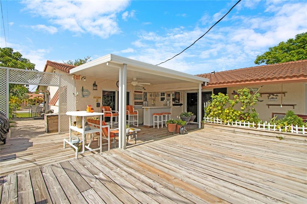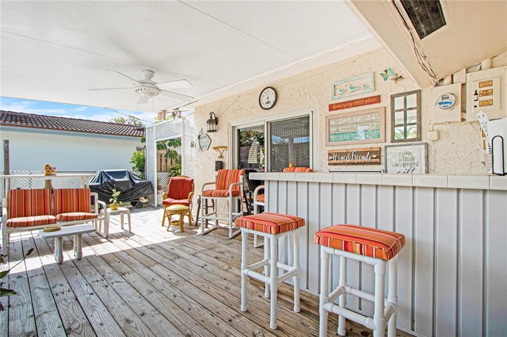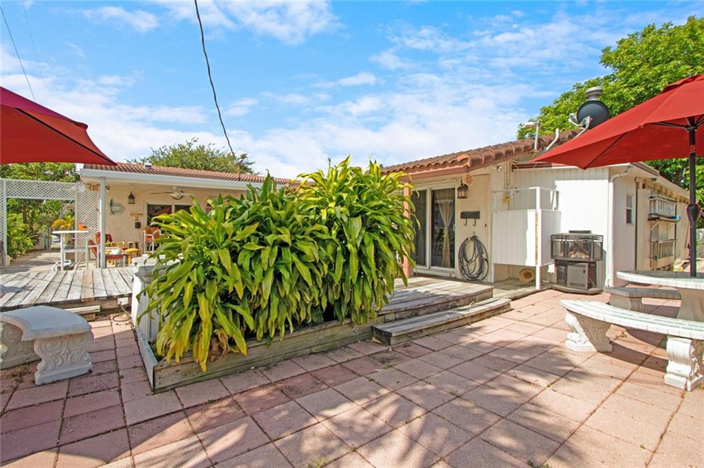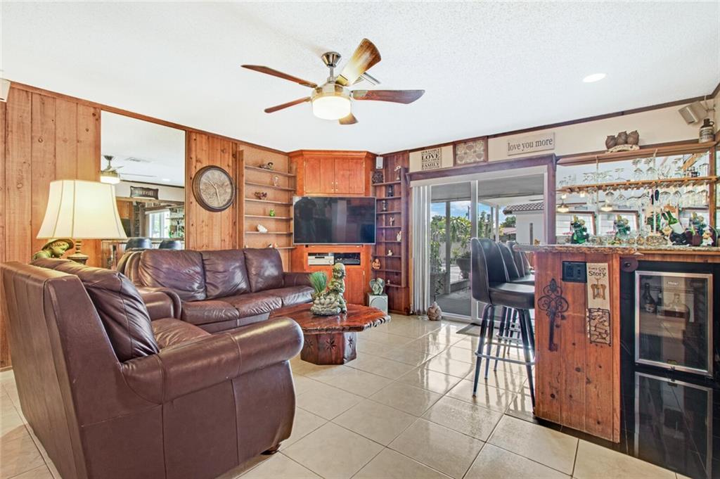 Large 4/3.5 home perfect for entertaining with tons of living space- large living room, family room w/bar & dining room. Updated kitchen has breakfast bar, granite counters, wood cabinetry, stainless steel appliances with tons of storage and counter space. Washer & dryer off kitchen. Split bedroom plan. Impact windows, new roof in 2007, one car garage and large circular driveway w/landscaping & sidewalk. Sit on the front patio and wave to neighbors or relax in your low maintenance backyard under the covered patio with outdoor bar. Large storage unit attached to rear of home. Largest bedroom has half bath inside- can easily be converted to a great master bedrooms space. Another large bedroom has a fireplace. 3 of 4 bedrooms have full glass doors leading to outdoors. No flood zone- "X".