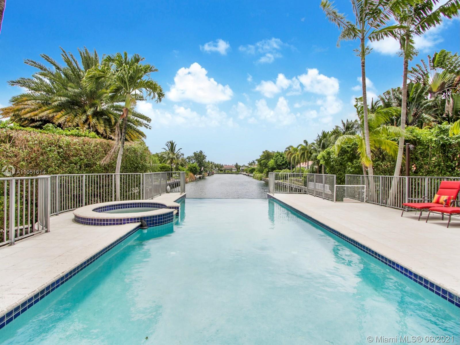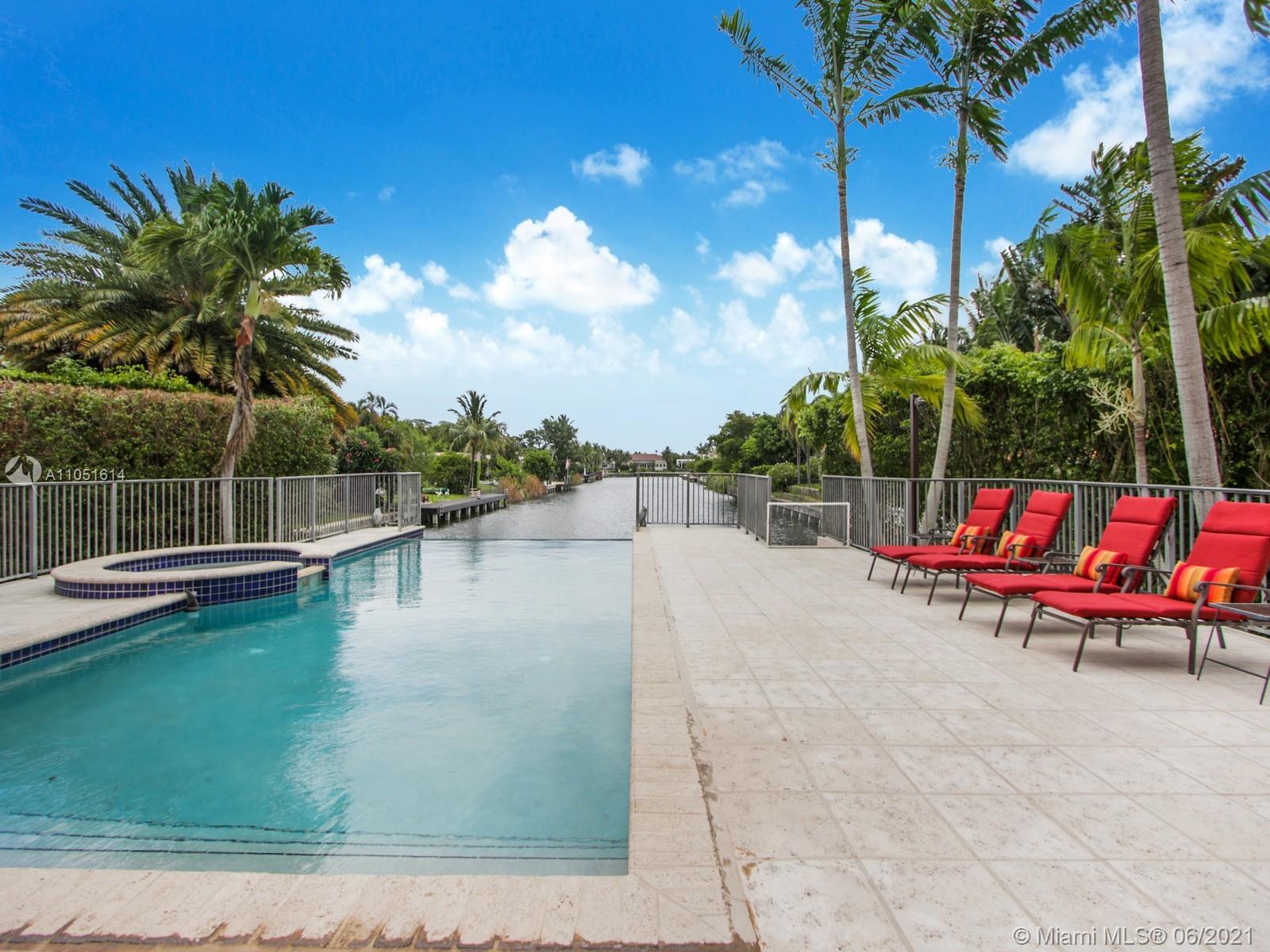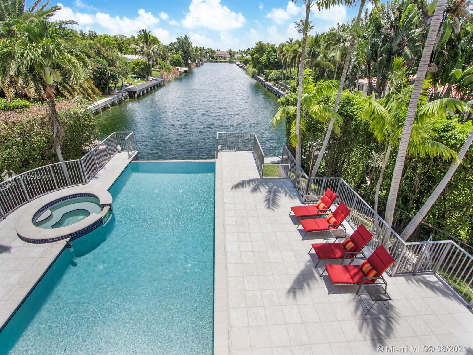 One of only a few end lot homes in Gables by the Sea, this grand 4,407 SF home sits at the end of the waterway with lush landscaping for the ultimate in waterfront privacy. At 12,500 SF, the lot is open and sunny, with water views in the backyard, a beautiful infinity edge pool, and large covered terraces both upstairs and downstairs for outdoor entertaining. Inside, the spacious home boasts 12 foot ceilings, a large eat in kitchen that connects to the family room, formal living and dining rooms, and a separate game room. Each of the home’s 5 bedrooms has its own en-suite bath, and an upstairs laundry room & kitchenette provide the ultimate in convenience. Gorgeous 2 story Mediterranean style home built in 2002 offers great frontage on Red Road w/quick access in & out of the neighborhood.