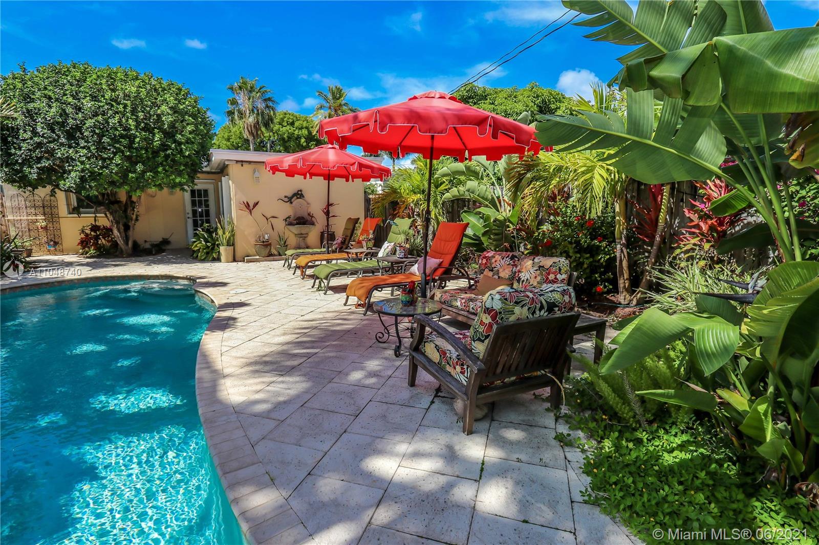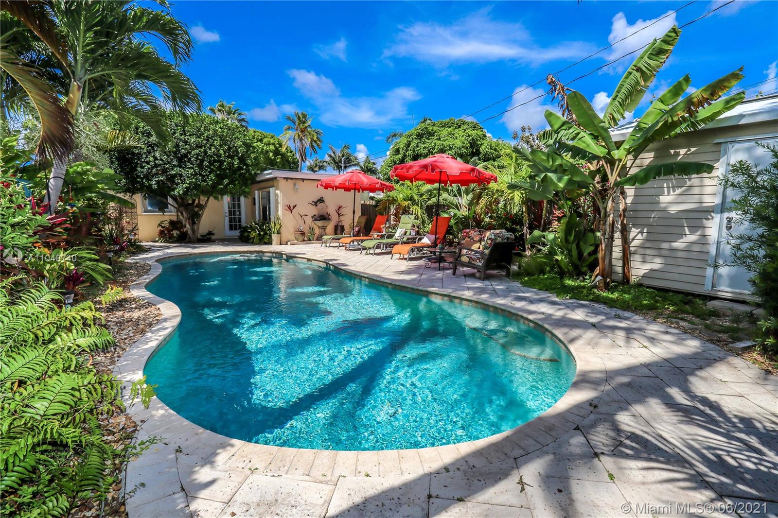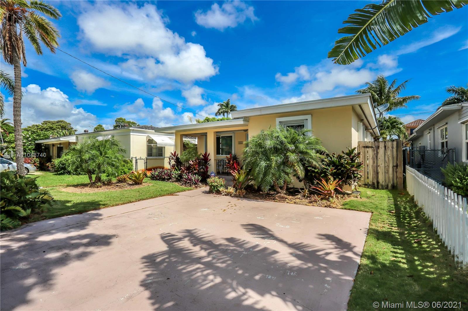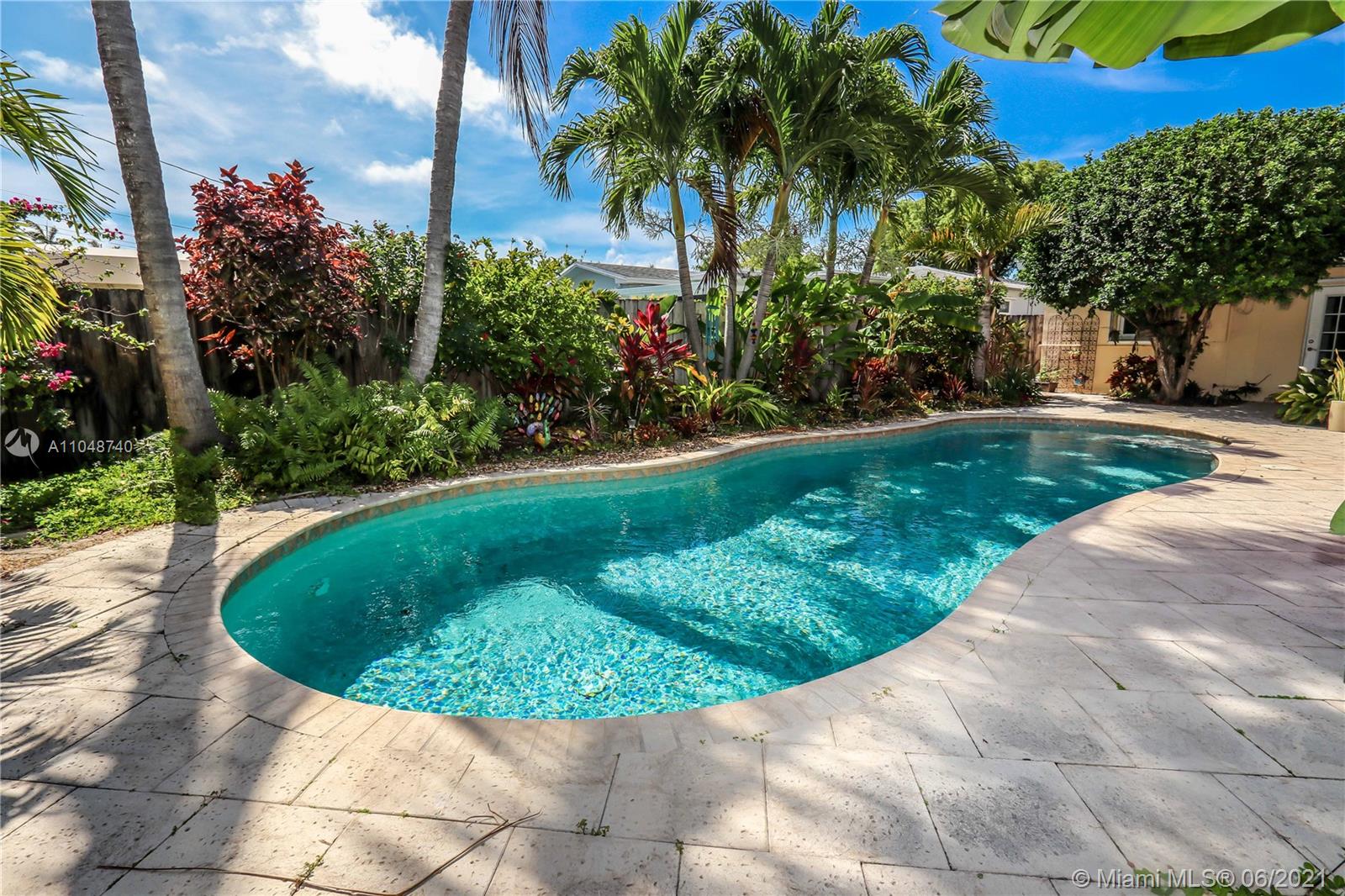Charming Home ~ Tropical Paradise! In Desired Neighborhood.....East of US1! 3 BD / 2 BA Home with a Pool ~ Features Tile Flooring Throughout. Open Kitchen with Stainless-Steel Appliances and Granite Counter Tops ~ Bright House with Natural Light ~ Spacious Living Room and Formal Dinning Room ~ Front Bath has a Pedestal Sink with Subway Tile ~ Spacious Closets ~ Beautiful Tropical Landscaping in the Backyard with Saltwater Heated Pool ~ Paver Patio ~ Covered Front Porch for Outside Seating Area ~ Most of the windows are high impact, others have shutters. Stackable washer & dryer. Category 5 hurricane proof Shed. Two car driveway. Newer Roof replaced 2019. Newer A/C Compressor and Pool Pump replaced 2020.