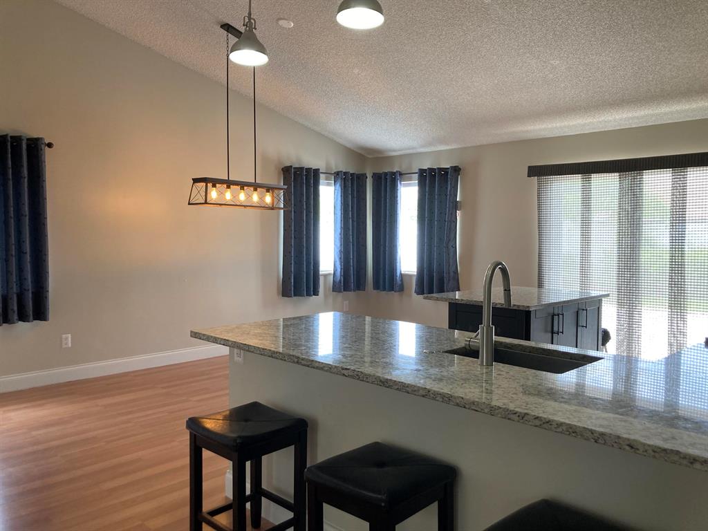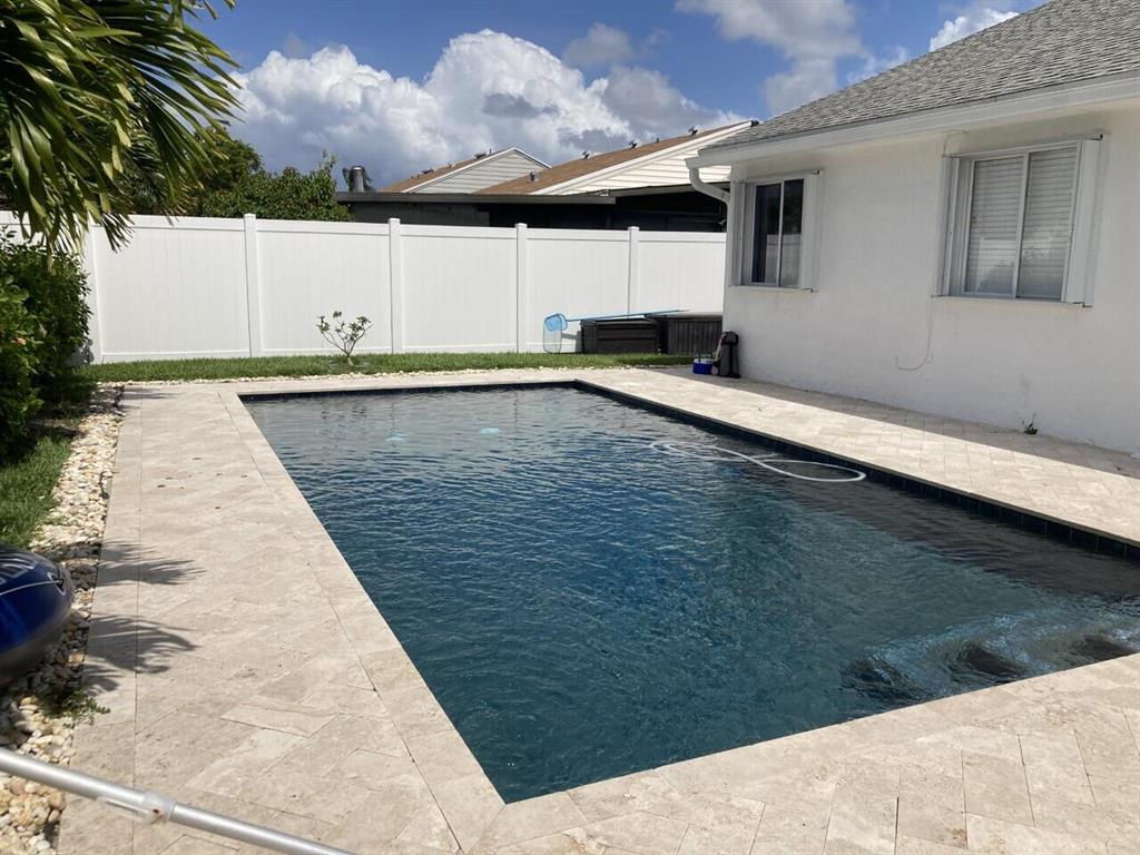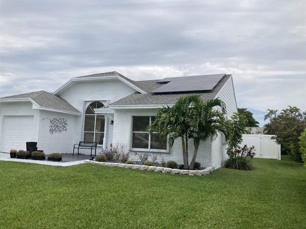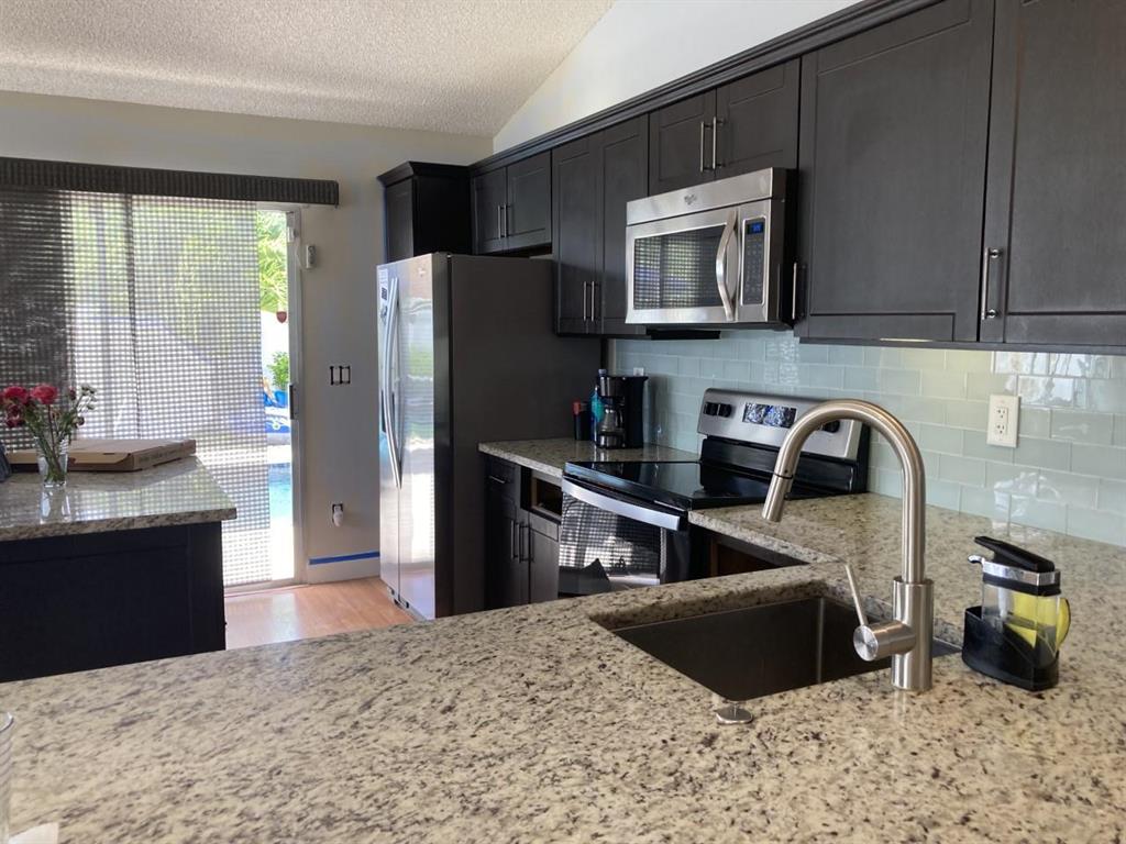 Bright, spacious, open-space concept and vaulted ceilings. 3 bedrooms, 2 baths, and epoxy-coated garage, over-sized driveway. Spacious dining room makes for a sweet space to entertain. Upgraded bathrooms and kitchen. Granite counter top, granite island, new range, stainless steel appliances. Privacy PVC fence, in-ground salt-water pool and travertine deck surrounded by beautiful Palms and hedges. Newer easy to use hurricane accordion shutters throughout all windows including slider. Energy-efficient Solar panels installed in 2018! Low monthly maintenance in an A district school. Before you decide, check this one out!