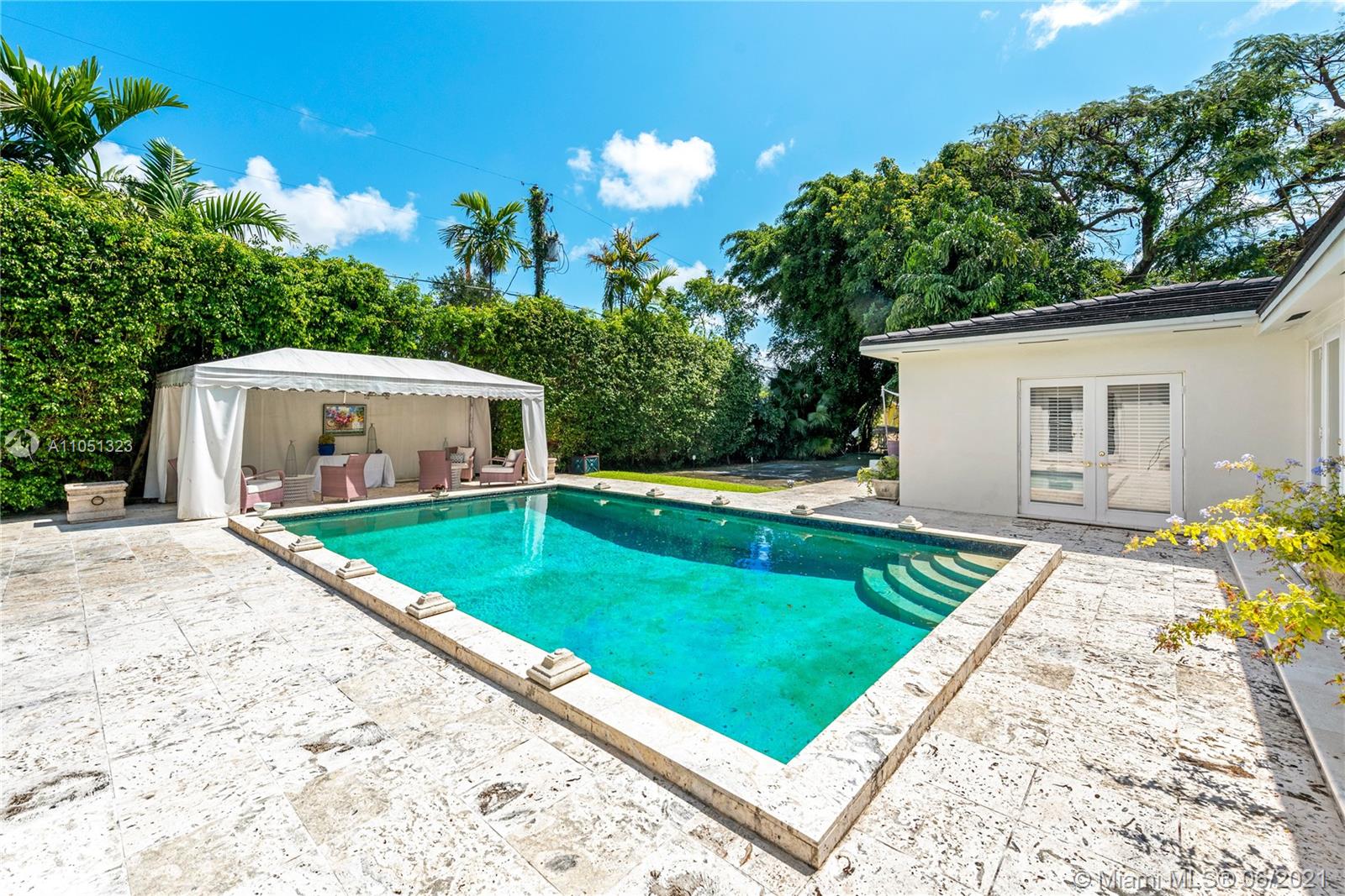 Rare, oversized lot in desirable Coral Gables neighborhood tucked away on a quiet street! Beautiful 1-story home with natural light throughout and panoramic views of the large backyard. This home features 3 bedrooms and 3 full bathrooms with an additional 1bd/1ba maid's quarters. Enclosed Den overlooks the large pool. The poolroom/family room with a full en-suite bathroom can be converted to another bedroom or office. Seldom seen 17,600+ sqft. lot complete with fruit trees.