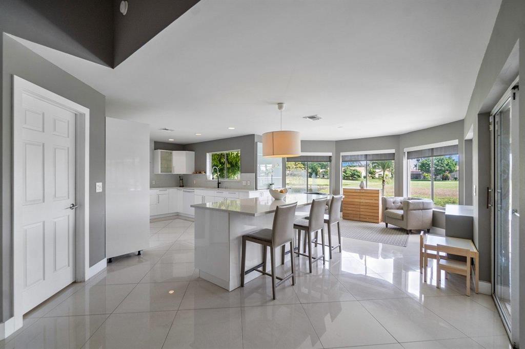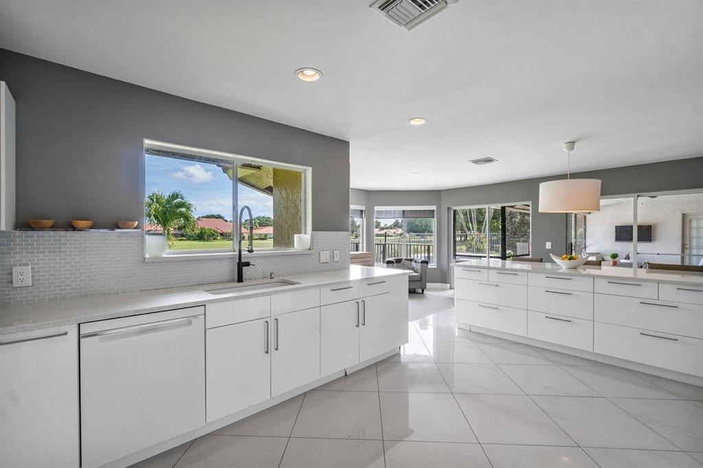 STUNNING!! From the moment you enter, the PANORAMIC POOL/LAKE views take your breath away & offers ONE OF THE BEST VIEWS in the neighborhood. This UPGRADED 4 bed, 3 1/2 bath home in a TOP-RATED SCHOOL DISTRICT is located both ON THE LAKE & GOLF COURSE in the highly desirable neighborhood of Boca Greens. The vaulted ceilings & open-concept, split floor plan gives this home space and privacy & the entire house receives tons of natural light. The imported, designer, rectified porcelain tiled floors shine throughout the spacious living area & into the FULLY UPGRADED chef's dream kitchen boasting CAESAR QUARTZ countertops, an AUTO-LIT WALL that adjusts for evening time, custom soft-close cabinetry, designer subway tiled backsplash, double wall oven, white, high-end appliances, cooktop w/