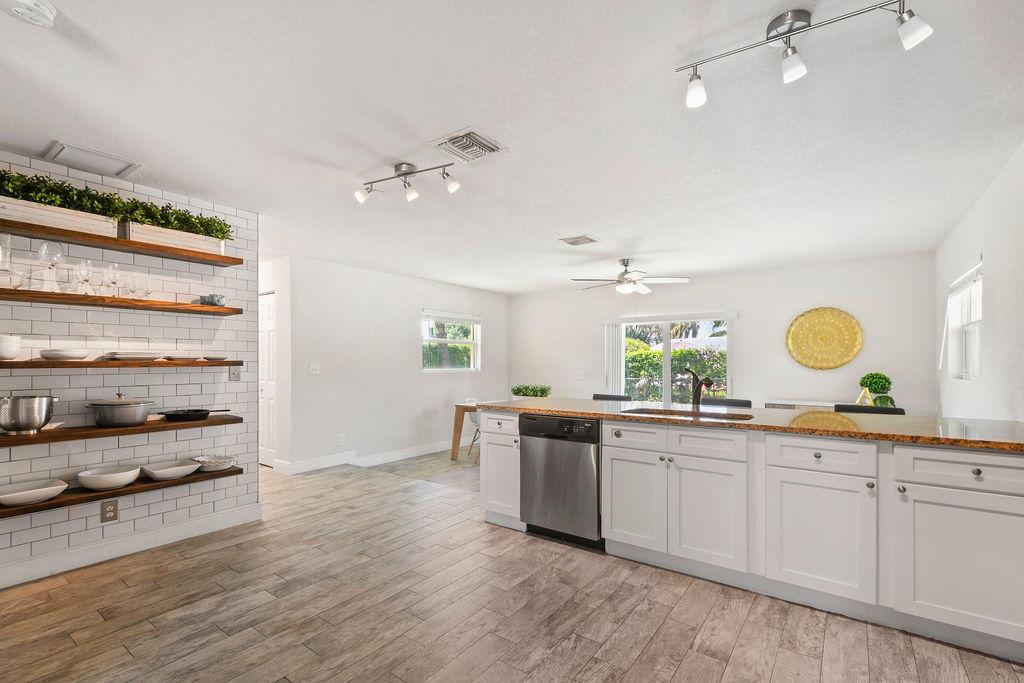Own this rare find, a fully renovated gem less than 15 minutes from the best beaches in Palm Beach County! This home has been completely updated with all new flooring, granite countertops, new light fixtures, and custom finishes throughout. The expansive back yard features lush landscaping and a fruit bearing avocado tree. The home was meticulously remodeled to feature an updated design with a light and airy open concept layout. The property is effortlessly secured during storm season with complete impact glass. The beautiful exterior paint job was completed June of 2021 and the new roof, electric and AC updates were all completed in 2016. Move right in and start enjoying this space for summer.