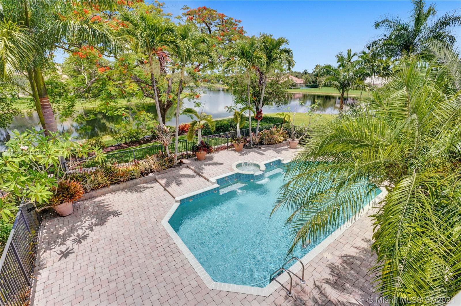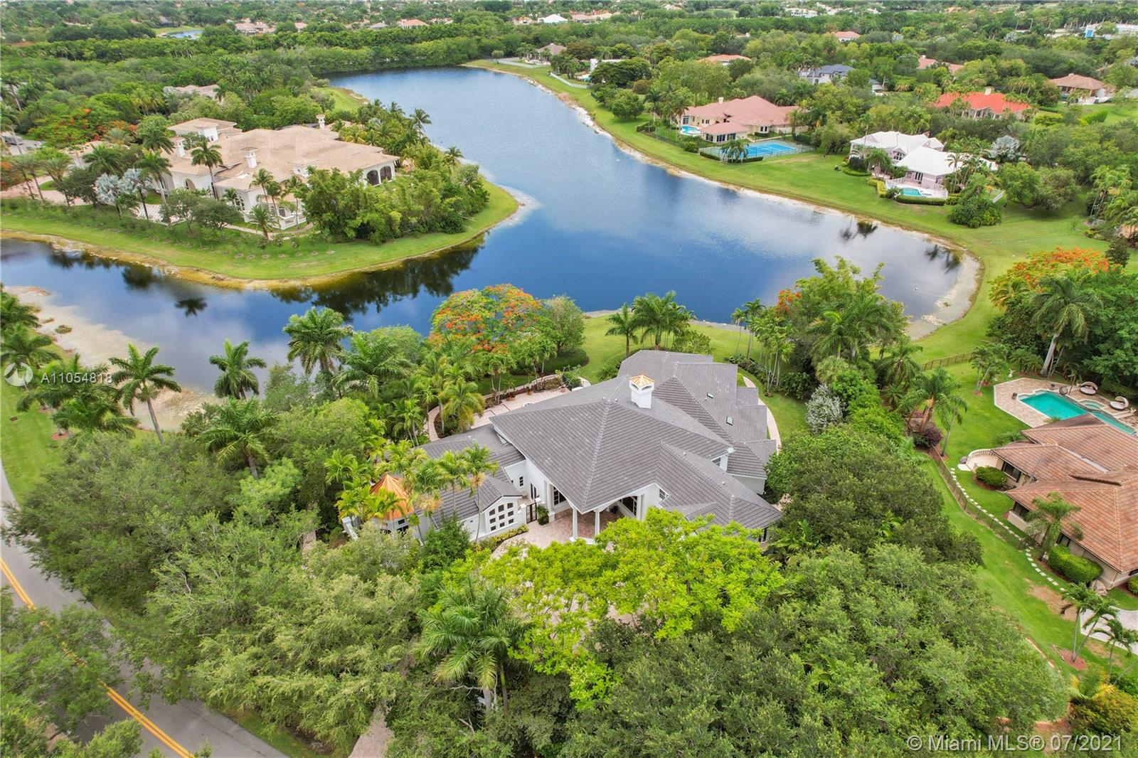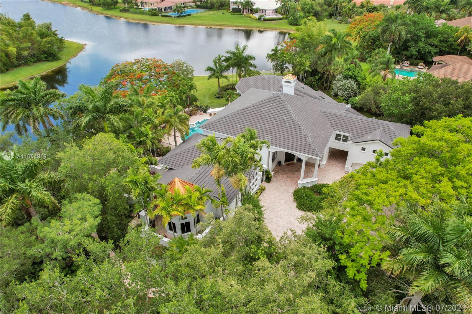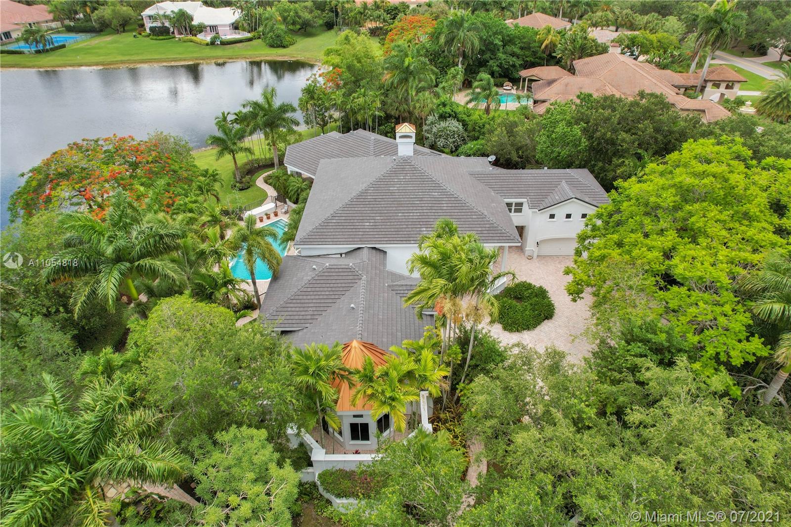 FIRST TIME ON THE MARKET! Absolutely captivating & private lakefront residence in the sought after neighborhood of Windmill Ranch Estates! Not a detail was spared in this incredibly planned two story estate home - perfect for entertaining & luxury living. Features include: Serene 1.49 acre corner lot, grand entry with Porte cochere, 3 car garage, NEW roof, hurricane impact glass, 5 bedrooms, 4 1/2 baths PLUS gym, office, library, wine room & bonus room, oversized master suite with spa-like bath & separate outdoor spa, living room with soaring ceilings & fireplace, gourmet kitchen, 2nd office, family room with endless views, summer kitchen & resort style pool - all together with peaceful & relaxing walkways around the property to enjoy the picturesque lush landscaping & beautiful sunsets!